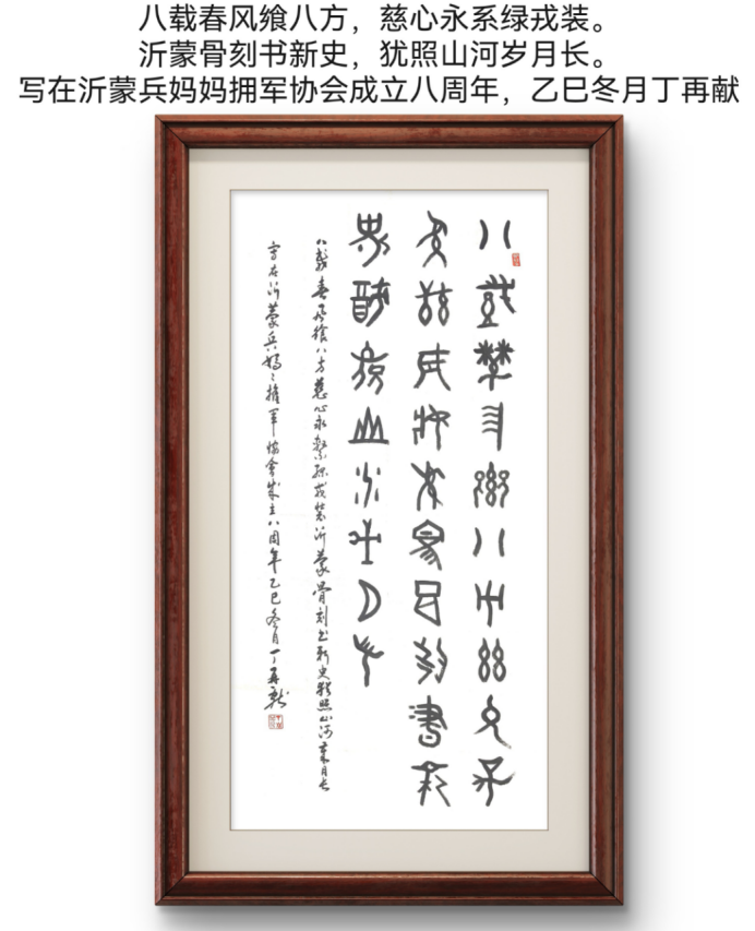 三、格律严谨:平仄合规,对仗工整 。作为一首七绝,全诗严格遵循平仄韵律规范,音韵和谐,朗朗上口。首句“八载春风飨八方”平仄相间,完全符合七绝平起平收式的格律要求。次句“慈心永系绿戎装”平仄协调,与首句形成对仗之势,“八载”、“慈心”、“春风”、“绿戎装”,词性相对,意境相合。 后两句“沂蒙骨刻书新史,犹照山河岁月长”同样严守格律,平仄交替有序,押韵规范。同时,诗歌节奏明快,每句七言平仄相间,读来抑扬顿挫,既符合传统七绝的韵律美感,又便于口头传诵,充分体现了丁先生对古典诗词格律的娴熟驾驭。 丁再献先生的这首贺诗,以严谨的格律为骨,以真挚的情感为肉,以深厚的文化为魂,不仅为沂蒙兵妈妈拥军协会送上了诚挚祝福,更让东夷文化、沂蒙精神与拥军情怀在诗词中实现了完美交融。它证明了传统诗词并非束之高阁的古董,而是能够承载时代精神、传递当代情感的鲜活载体;也展现了东夷骨刻文这一古老文化符号在当代的独特价值。全诗篇幅虽短,却意蕴深远,既是对拥军传统的礼赞,也是对文化传承的践行,值得细细品读与回味。