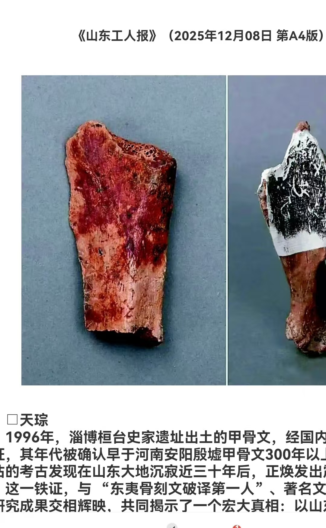 1996年,淄博桓台史家遗址出土的甲骨文,经国内权威专家严密论证,其年代被确认早于河南安阳殷墟甲骨文300年以上!这项被严重低估的考古发现在山东大地沉寂三十年后,正焕发出震撼人心的光芒。 这一铁证,与“东夷骨刻文破译第一人”著名文化学者丁再献的研究成果交相辉映,共同揭示了一个宏大真相:以山东为核心的东夷文化,不仅是中华文明的重要源头,更是中国成熟文字系统一脉相承的摇篮。