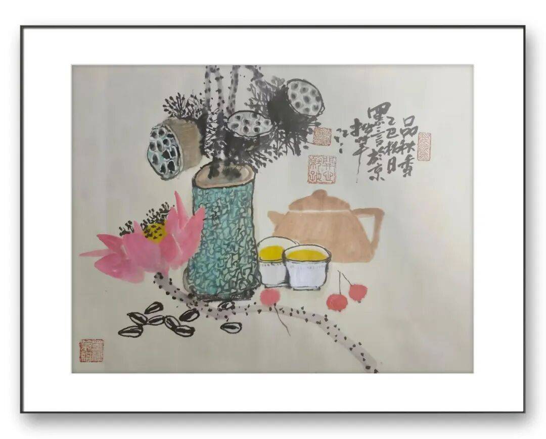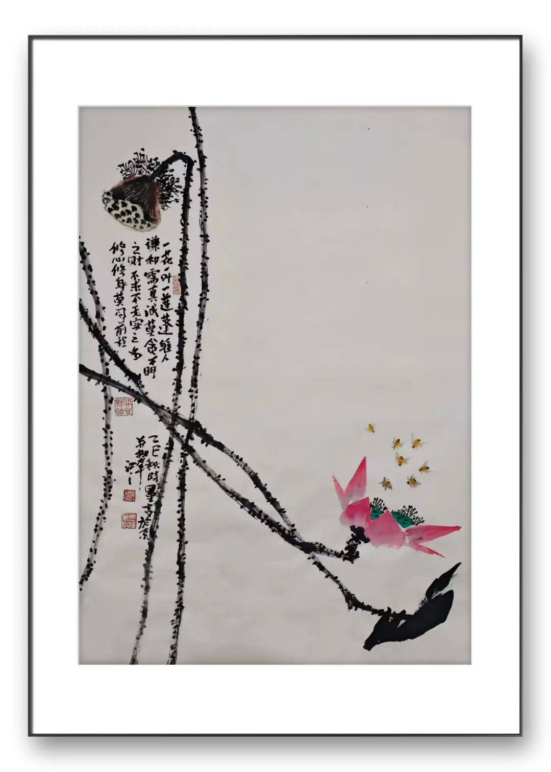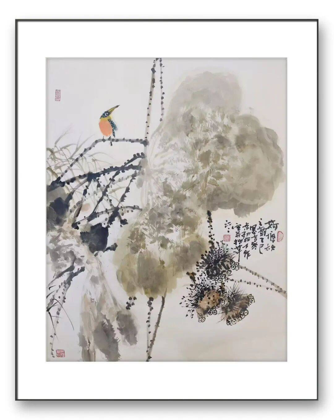 邵建刚先生的花鸟画,同样展现出深厚的传统功底与独特的艺术视角。他的花鸟画取法徐渭、齐白石等名家,注重笔墨的写意性与情感的表达,将花鸟的形态与神韵展现得栩栩如生。他擅长以简练的笔墨勾勒花鸟的轮廓,以浓淡变化的墨色表现花鸟的质感与层次,画面简洁而富有韵味,生动而不失雅致。他笔下的荷花,绝非对自然景观的简单复刻,而是经过艺术提炼后的精神写照。他善于搭配景致,或在荷塘中点缀几只游鱼,或在荷畔辅以几株水草,或用淡墨渲染远山碧水,让画面更显丰富饱满,意境悠远。在构图上,他既借鉴传统“留白”艺术,让画面留有想象空间,又融入当代审美视角,注重画面的平衡与张力。