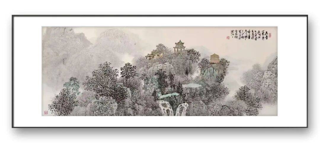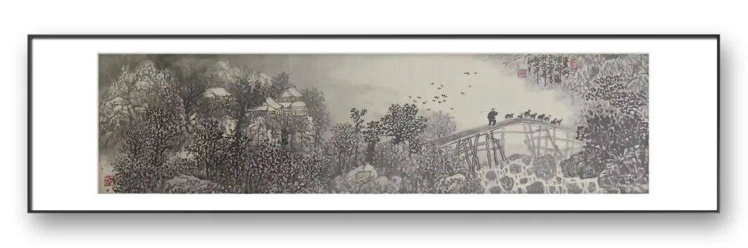 难能可贵的是,邵建刚先生的山水画并未局限于传统的桎梏,而是在传承中寻求创新,融入了鲜明的时代气息。他将当代生活中的审美感悟与山水创作相结合,在题材选择、色彩运用等方面都展现出新颖的视角。在题材上,他不仅描绘名山大川,也关注寻常百姓的生活场景,将田园风光、乡村新貌等元素融入山水画中,让作品更具生活气息与时代温度。在色彩运用上,他打破了传统山水画以水墨为主的单调格局,适当融入淡雅的色彩,既不张扬刺眼,又能为画面增添生机与活力。作品中,他以淡淡的绿色描绘初生的草木,以浅粉点缀山间的桃花,与水墨的黑白灰相互映衬,既展现了江南春天的生机盎然,又不失传统山水的雅致韵味。这种创新并非对传统的背离,而是在传统基础上的升华,让山水画在当代语境下焕发出新的生命力。