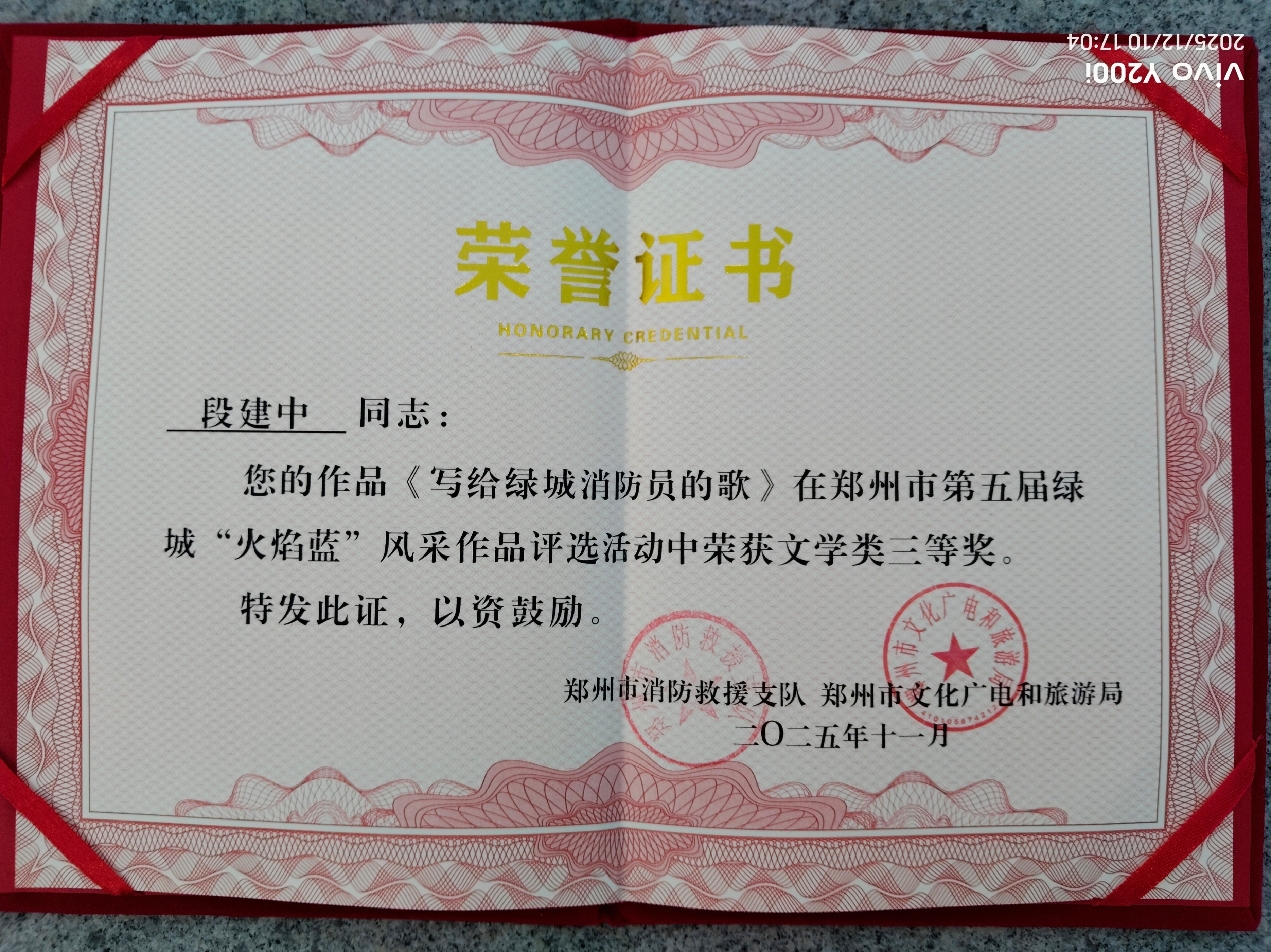 喜鹊报喜喜洋洋,本人近日又获奖。时至年底,又有惊喜。在郑州市第五届绿城"火焰蓝"风采作品评选活动中,本人的作品《写给绿城消防员的歌》获得三等奖: