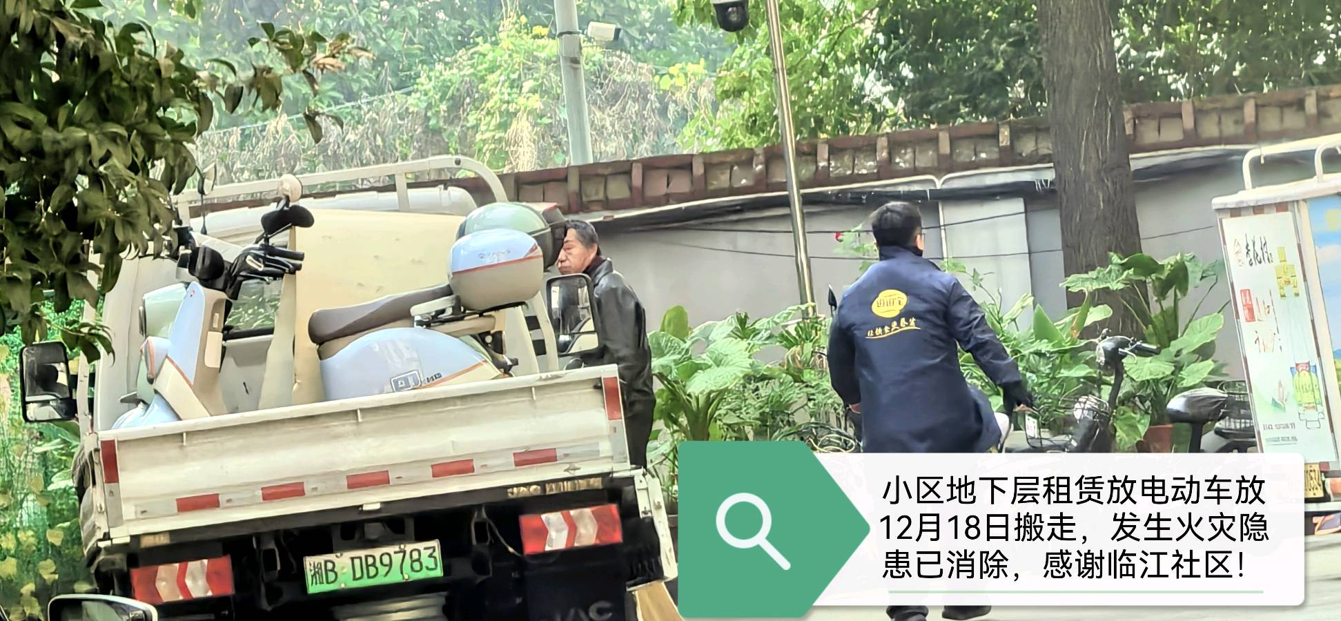 异军小区A栋地下层XX租赁放电动车於12月18日搬走,发生火灾隐患已消除,感谢临江社区!