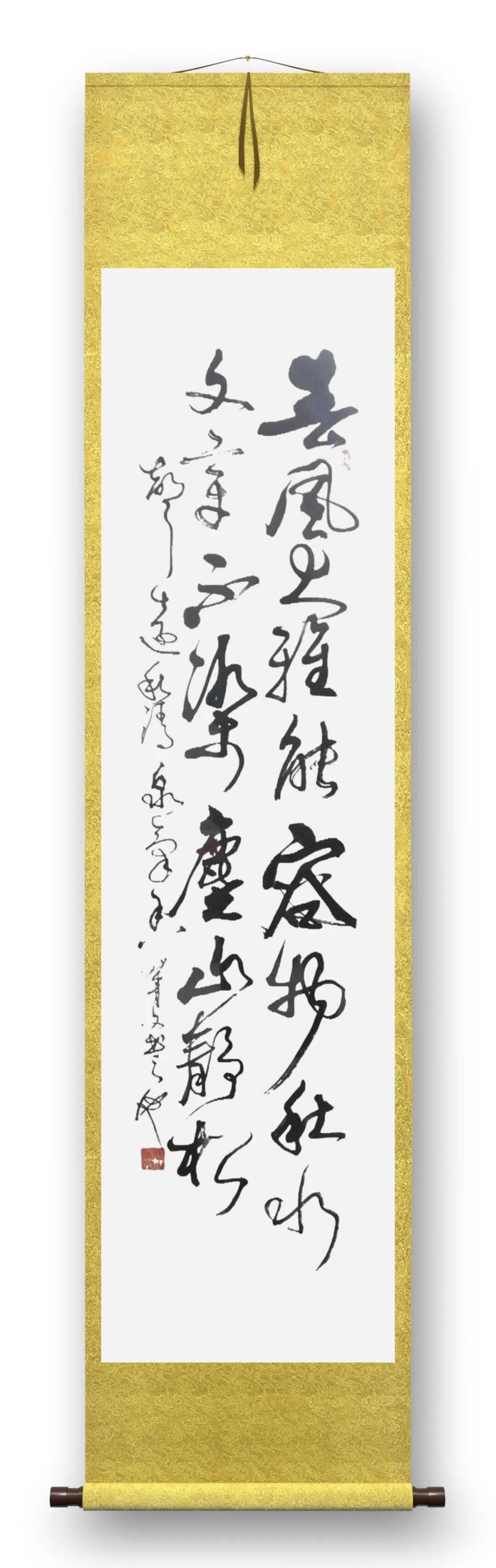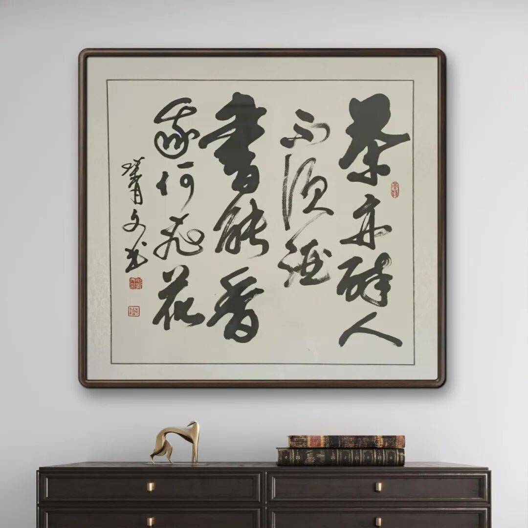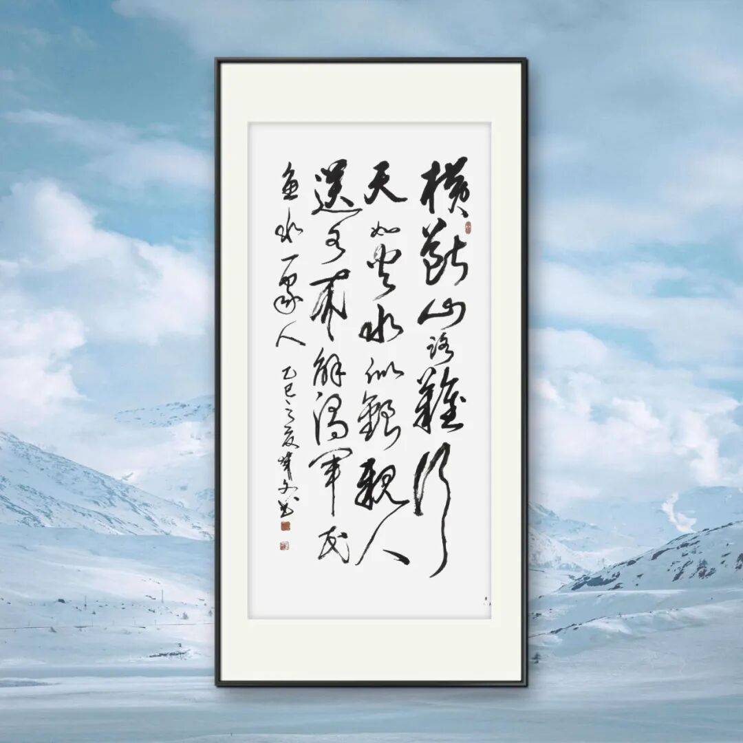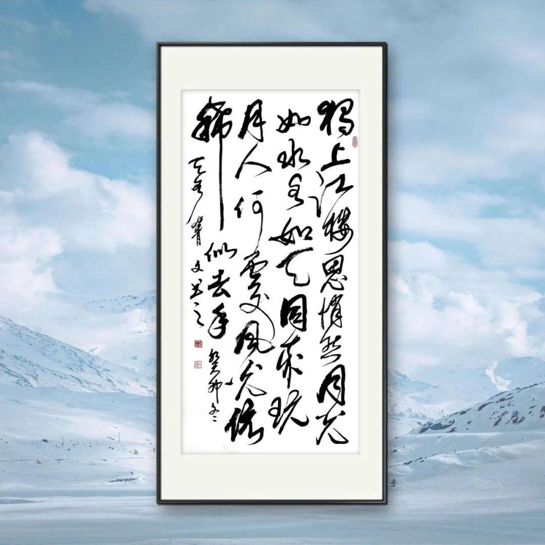 毛菁文先生的草书线条如奔蛇走虺 ,连绵回绕又充满张力,笔画粗细对比强烈,时而轻若游丝,时而重如崩云,在强烈的节奏变化中展现独特韵律。其笔法精妙绝伦,传承古法又大胆创新,常以夸张的提按、使转,将藏锋、露锋、中锋、侧锋灵活运用 ,打破常规结字规则,字的大小、疏密、开合等处理随心所欲,却又和谐统一,呈现出一种自由奔放、气象万千的艺术境界,将草书的写意性发挥到极致,对后世草书发展影响深远。