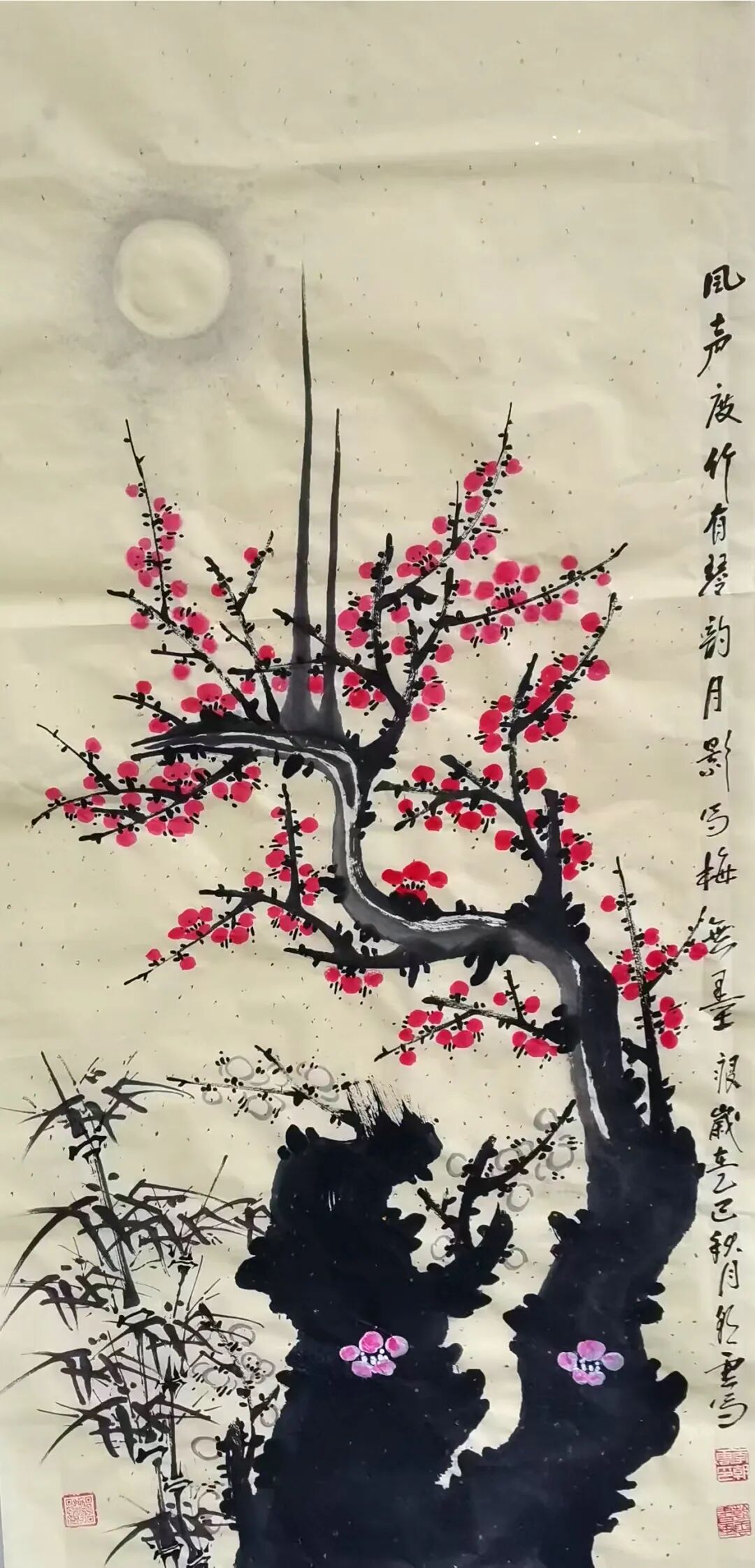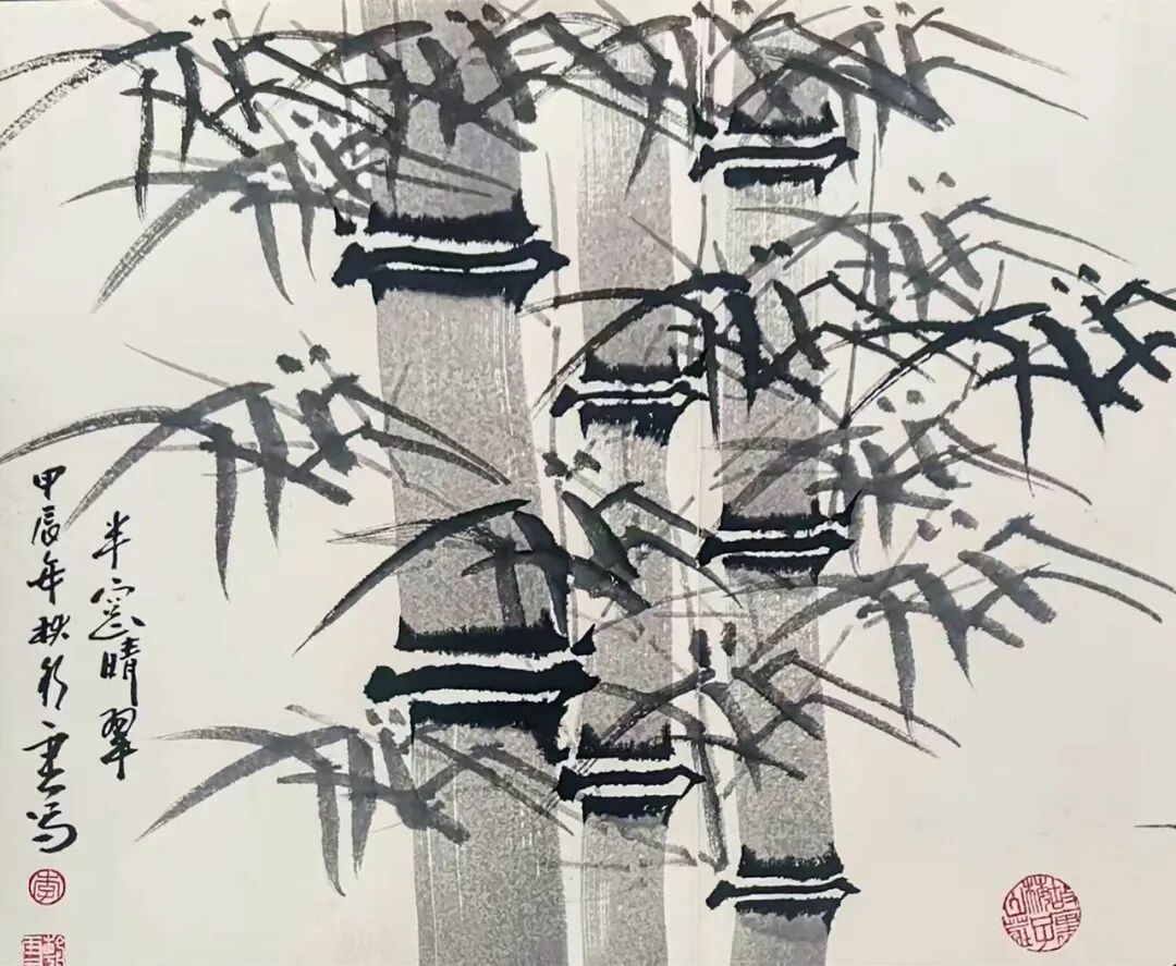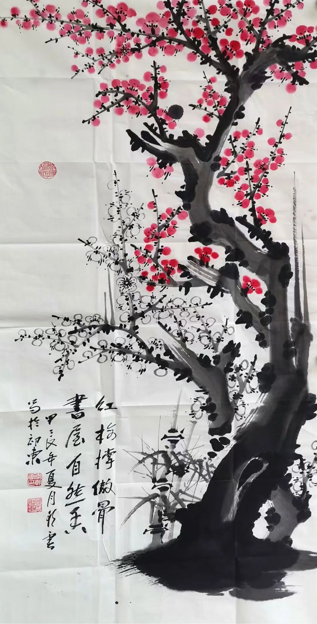 在绘画方面,李朝云先生尤擅梅、竹、花鸟等题材。他笔下的梅花枝干苍劲、转折有力,花瓣疏密得当,既有“铁骨冰心”的高洁品格,也有生机勃发的温润气息;竹子则以挺拔的姿态、清劲的笔线表现其坚韧与气节,竹叶的向背、浓淡、疏密处理富于节奏感,使画面在简约中见丰富,在静穆中含动势。作品整体呈现出清新雅致、刚柔并济的审美取向,体现了画家对自然物象的细致观察与对笔墨语言的熟练驾驭。