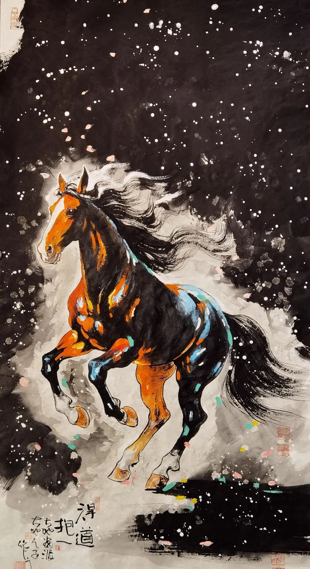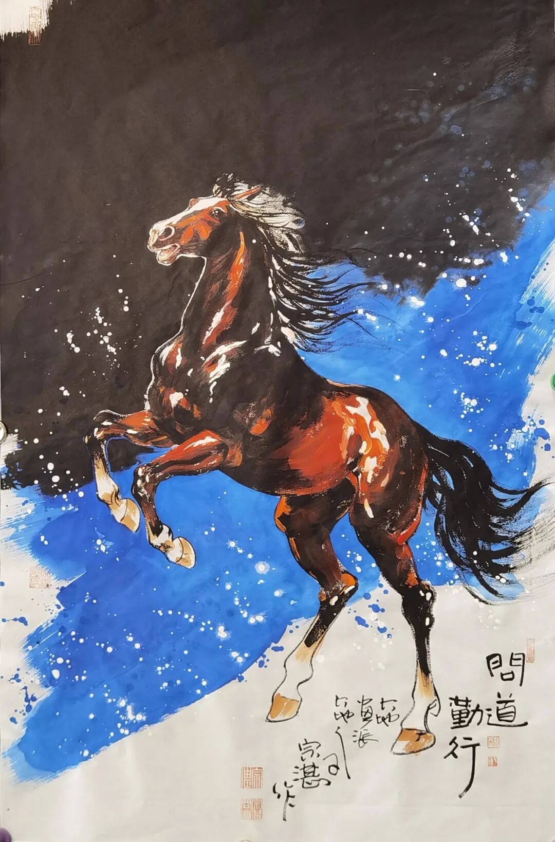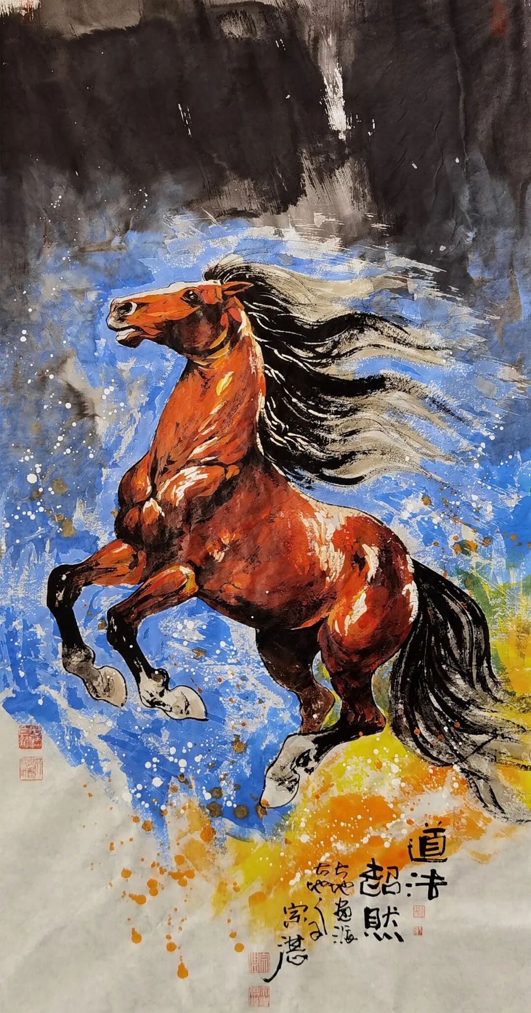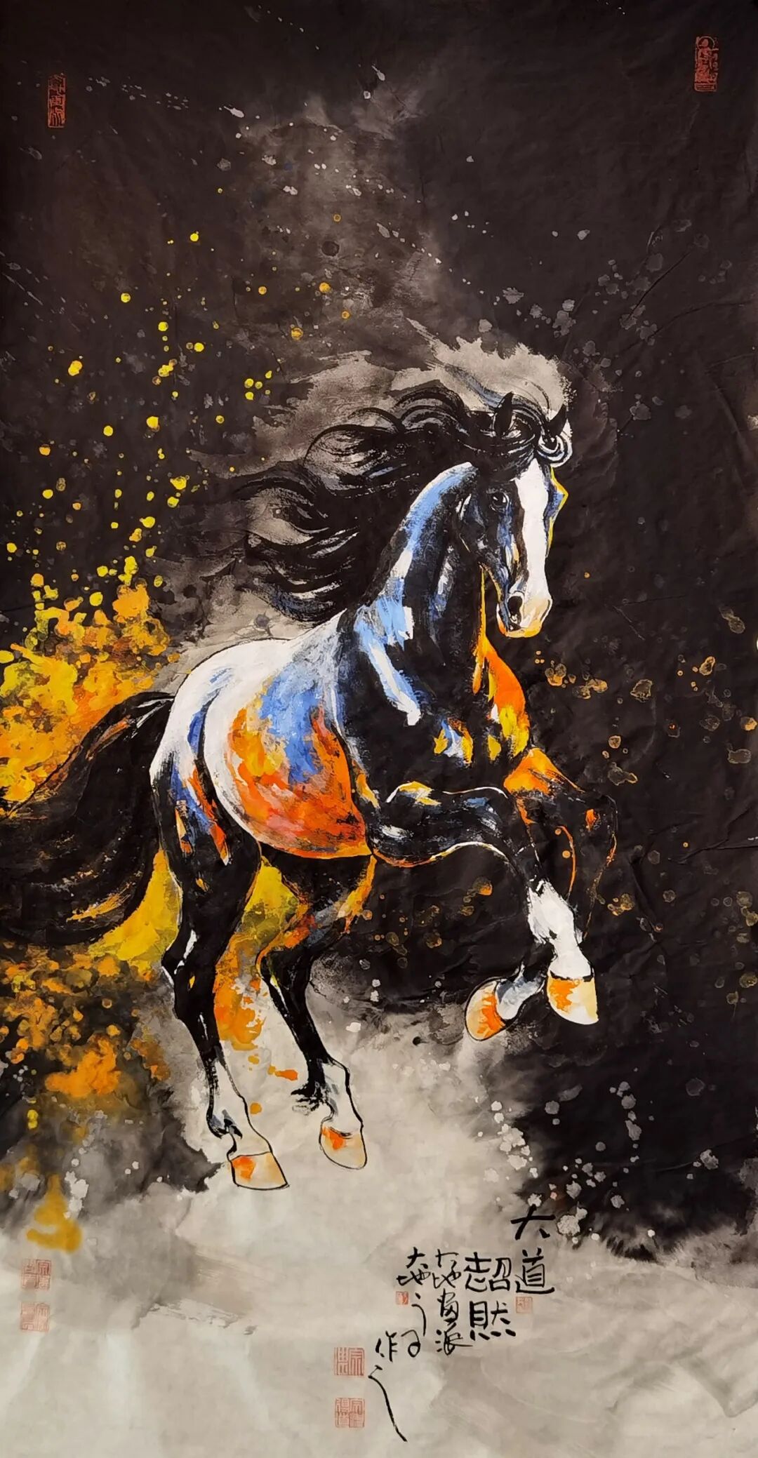 观其作,《无尽行道》中三骏并驰,墨色与厚彩交织,蹄踏烟波,鬃扬长风,尽显“行而不辍,未来可期”之践行;《志在长空》的白骏踏云而起,素毫染雪,丹青凝霞,写“心游太虚,志凌九霄”之旷达;《黑神骏》以泼墨成势,马身显灵韵,墨痕流转如自然肌理,融“龙马精神”于一笔,合“生生不息”之哲思。更有诸多佳作,或骏骥峙风而立,目向苍穹似含远志;或烈马奋蹄而驰,身贯长虹若赴征途;或骅骝踏雪而归,毛骨凝霜犹守初心。中西技法相融,油画之厚彩塑马之筋骨,国画之笔墨写马之神韵,蓝如沧海凝光,红若丹霞映日,黑似玄云垂野,白若皓月临空,色彩与笔墨碰撞,恰如“有无相生,难易相成”之艺理,大地“刚柔相济,动静相和”之神韵。
