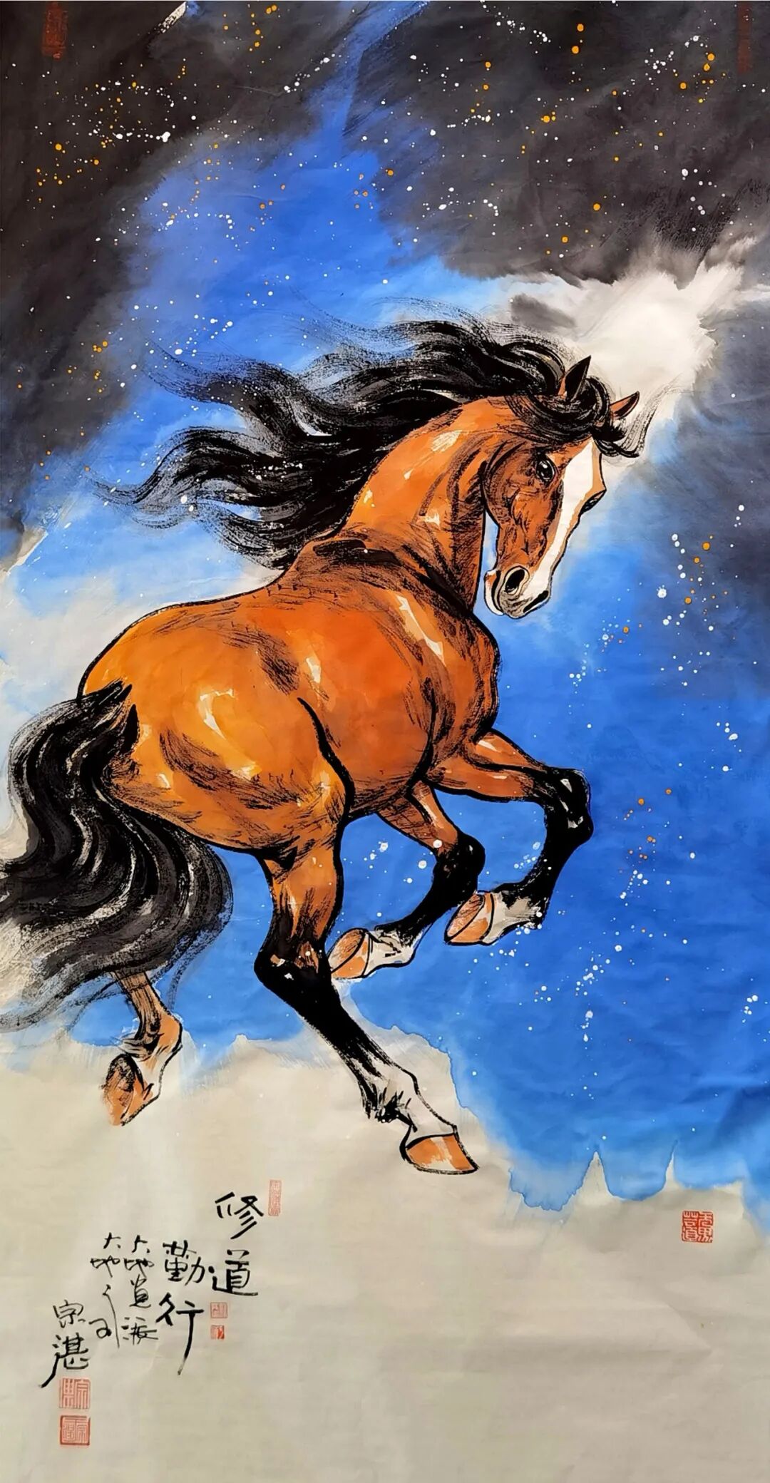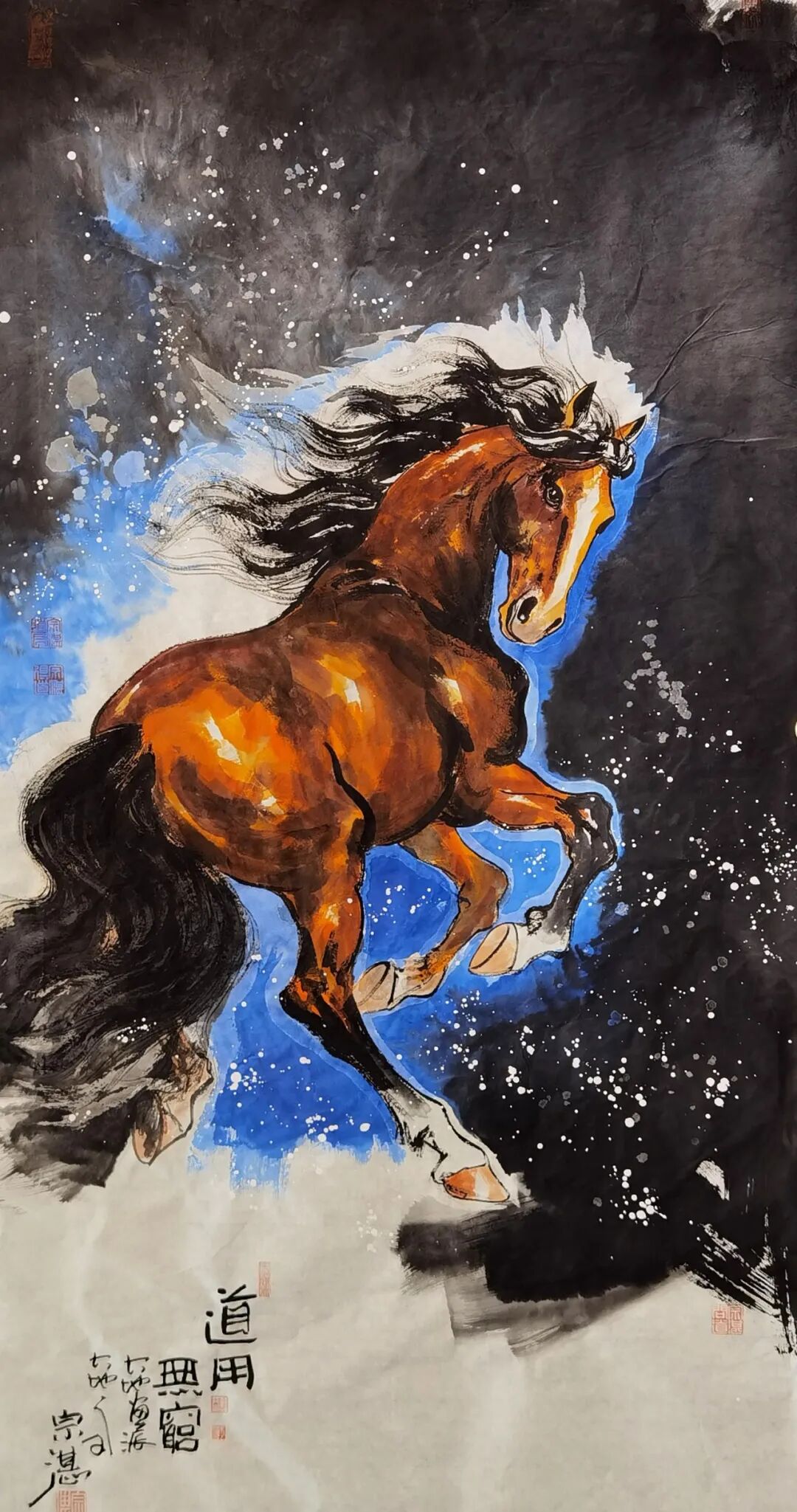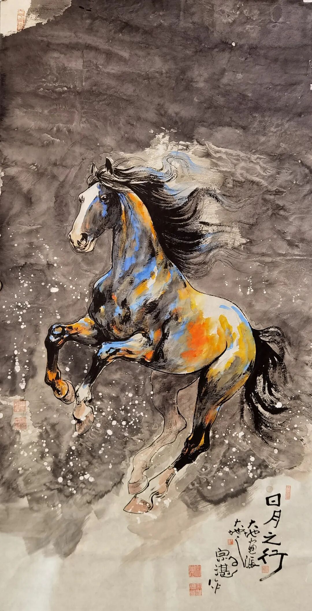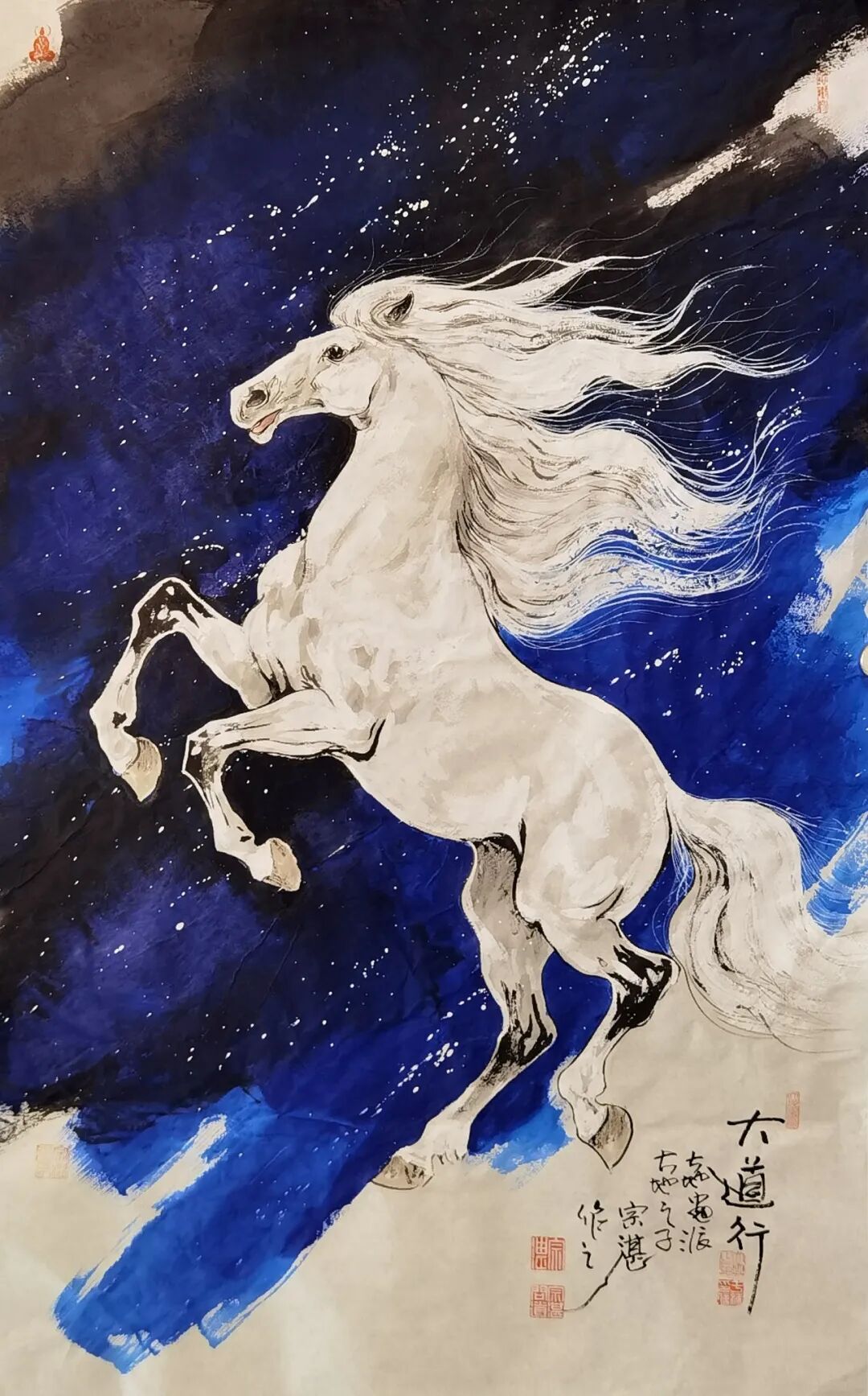 观其作,《无尽行道》中三骏并驰,墨色与厚彩交织,蹄踏烟波,鬃扬长风,尽显“行而不辍,未来可期”之践行;《志在长空》的白骏踏云而起,素毫染雪,丹青凝霞,写“心游太虚,志凌九霄”之旷达;《黑神骏》以泼墨成势,马身显灵韵,墨痕流转如自然肌理,融“龙马精神”于一笔,合“生生不息”之哲思。更有诸多佳作,或骏骥峙风而立,目向苍穹似含远志;或烈马奋蹄而驰,身贯长虹若赴征途;或骅骝踏雪而归,毛骨凝霜犹守初心。中西技法相融,油画之厚彩塑马之筋骨,国画之笔墨写马之神韵,蓝如沧海凝光,红若丹霞映日,黑似玄云垂野,白若皓月临空,色彩与笔墨碰撞,恰如“有无相生,难易相成”之艺理,大地“刚柔相济,动静相和”之神韵。