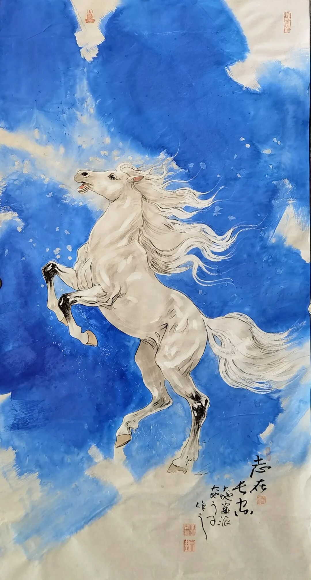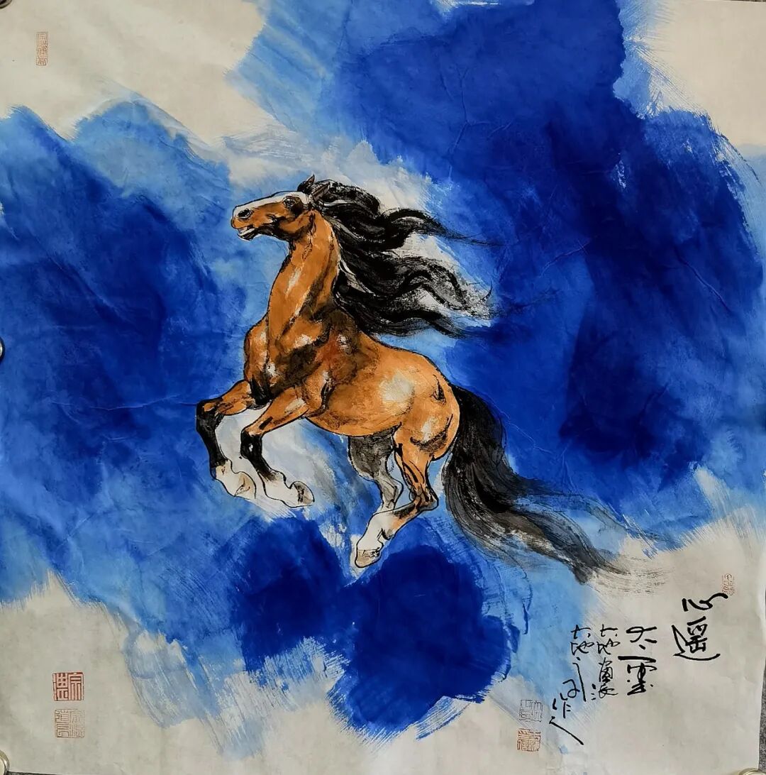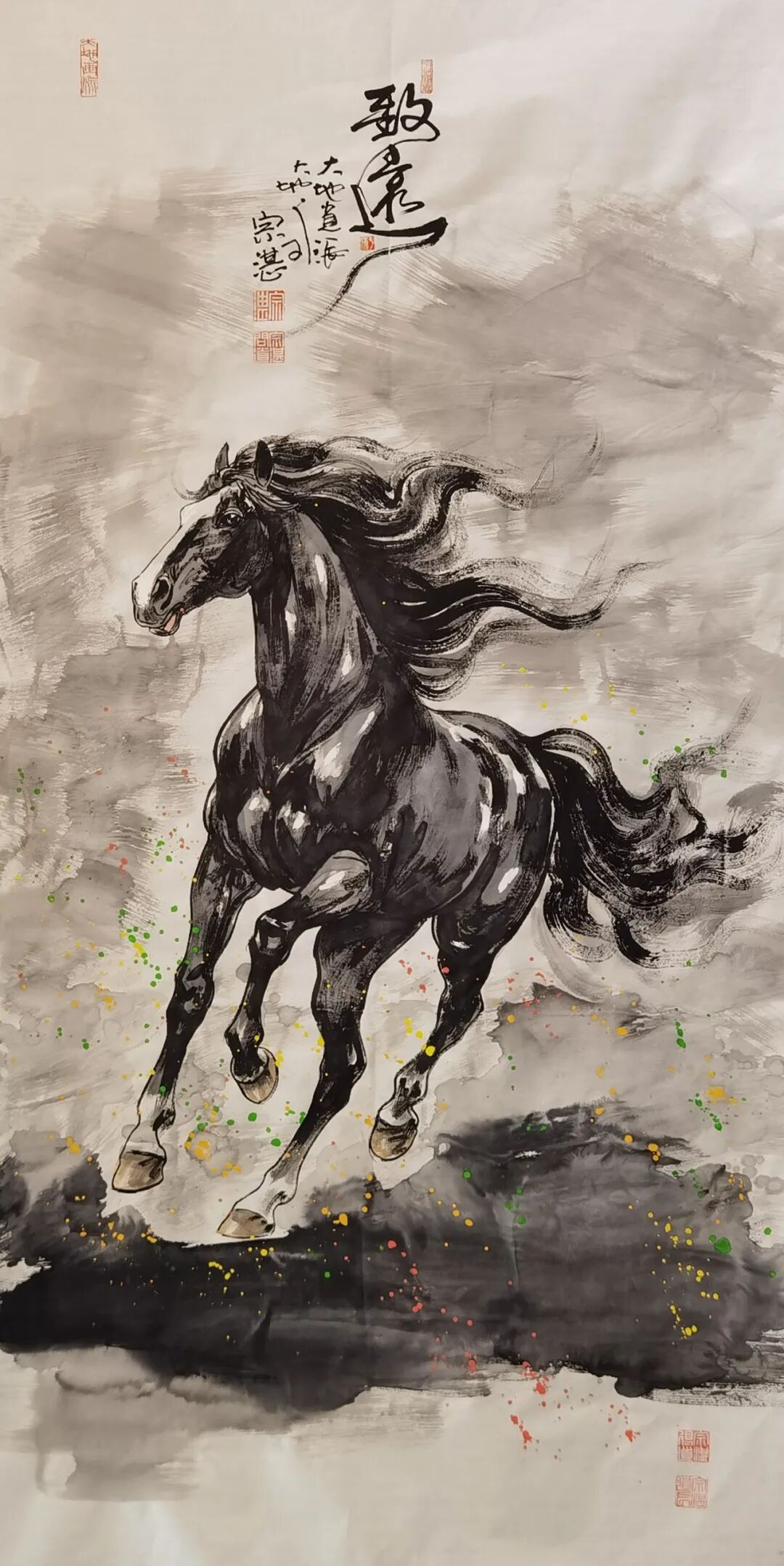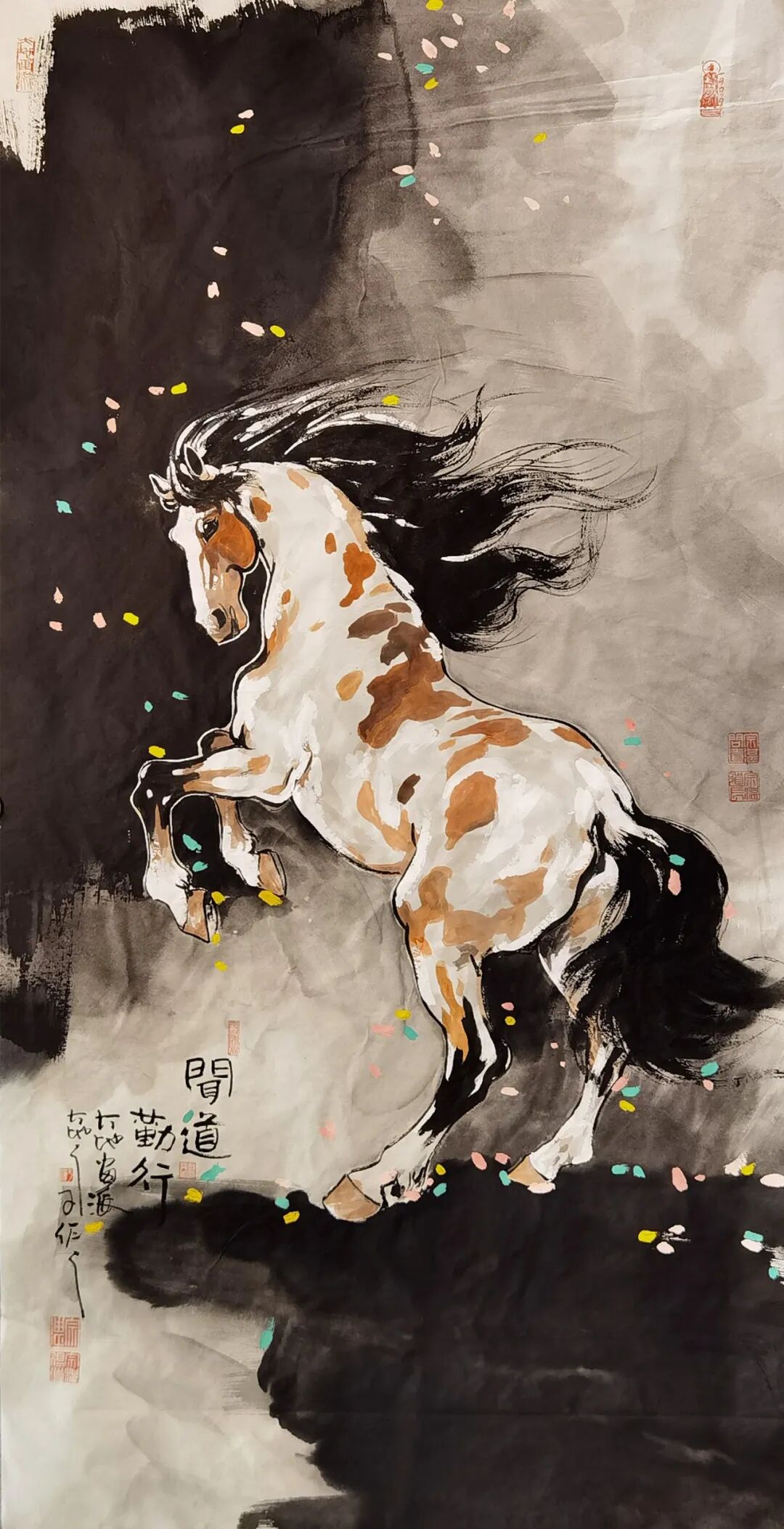 观其作,《无尽行道》中三骏并驰,墨色与厚彩交织,蹄踏烟波,鬃扬长风,尽显“行而不辍,未来可期”之践行;《志在长空》的白骏踏云而起,素毫染雪,丹青凝霞,写“心游太虚,志凌九霄”之旷达;《黑神骏》以泼墨成势,马身显灵韵,墨痕流转如自然肌理,融“龙马精神”于一笔,合“生生不息”之哲思。更有诸多佳作,或骏骥峙风而立,目向苍穹似含远志;或烈马奋蹄而驰,身贯长虹若赴征途;或骅骝踏雪而归,毛骨凝霜犹守初心。中西技法相融,油画之厚彩塑马之筋骨,国画之笔墨写马之神韵,蓝如沧海凝光,红若丹霞映日,黑似玄云垂野,白若皓月临空,色彩与笔墨碰撞,恰如“有无相生,难易相成”之艺理,大地“刚柔相济,动静相和”之神韵。