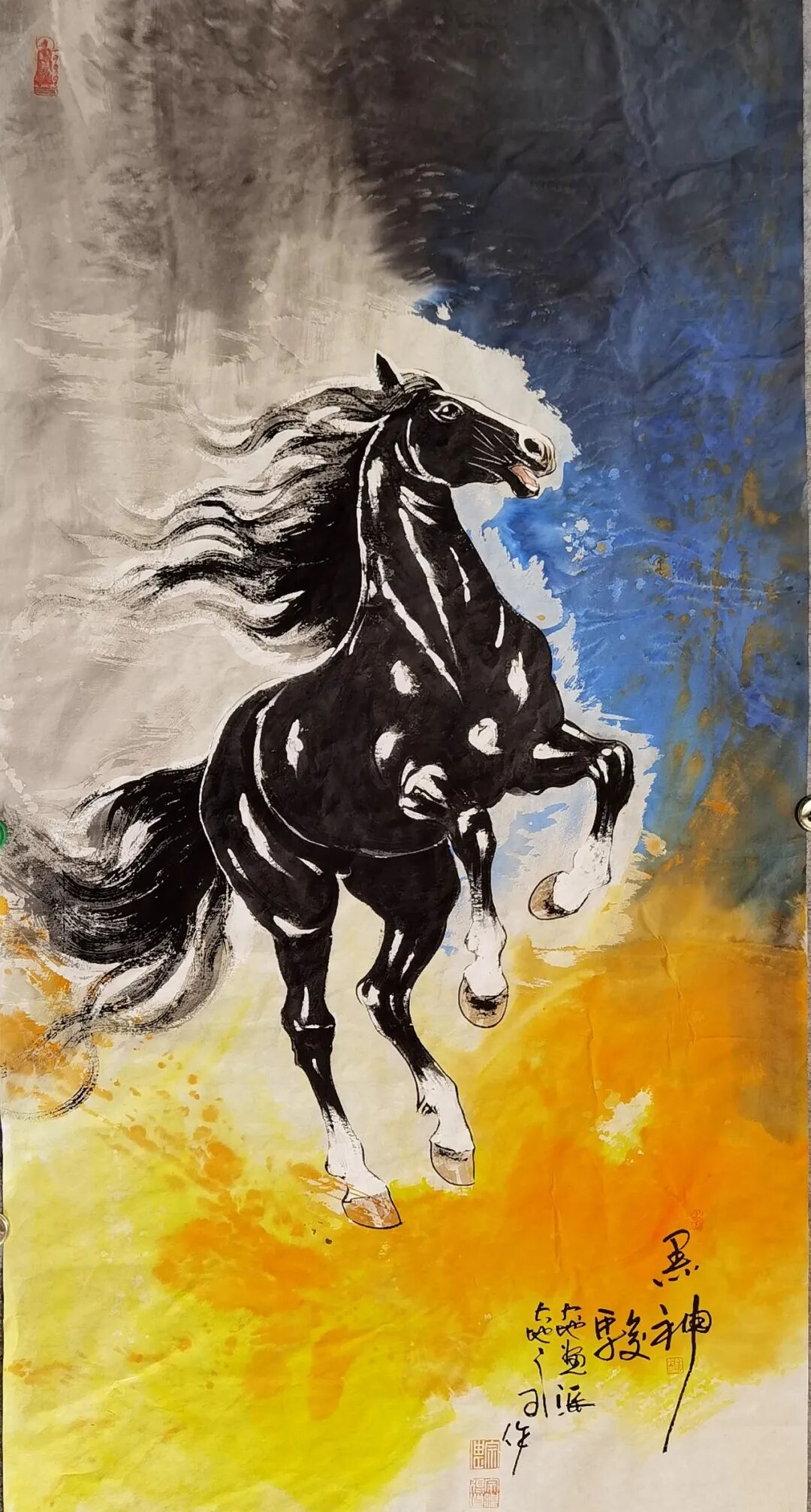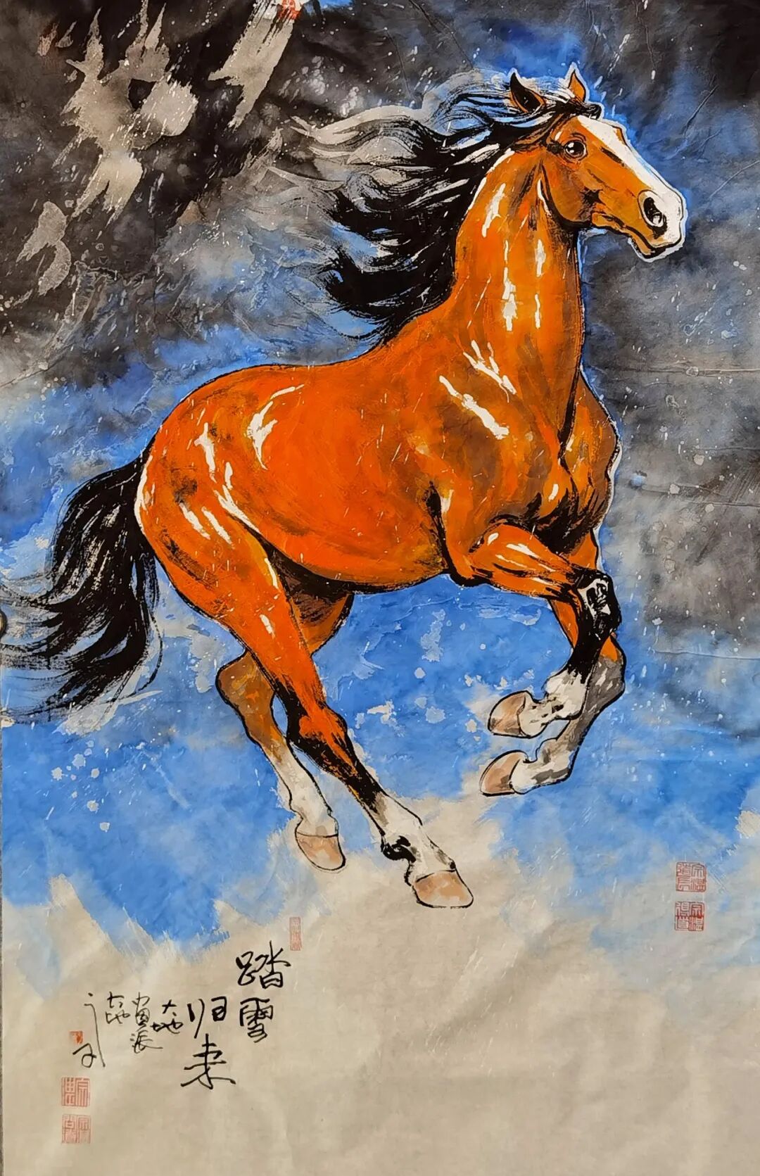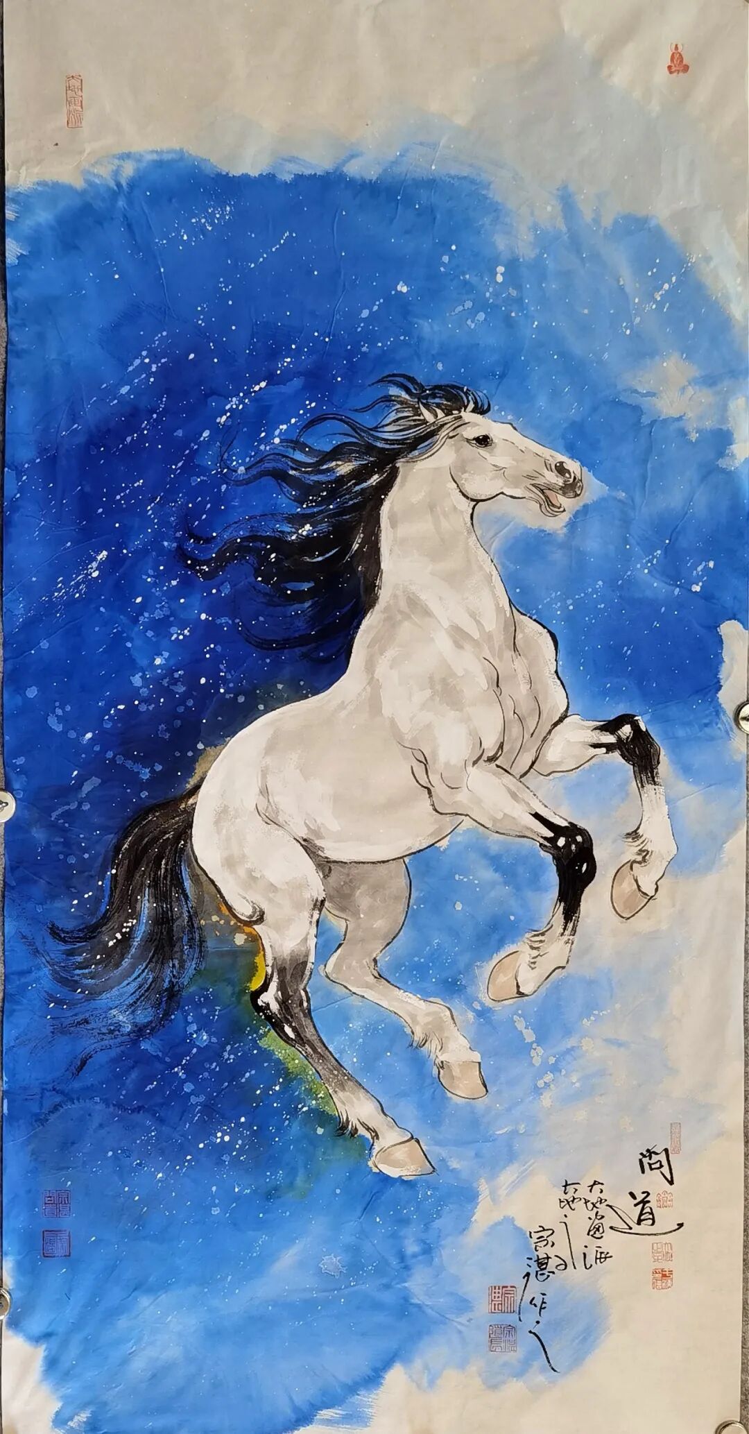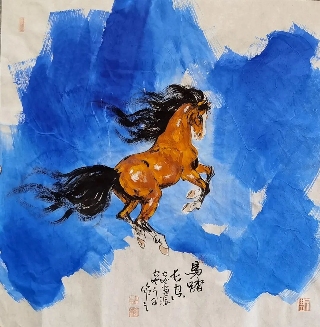 观其作,《无尽行道》中三骏并驰,墨色与厚彩交织,蹄踏烟波,鬃扬长风,尽显“行而不辍,未来可期”之践行;《志在长空》的白骏踏云而起,素毫染雪,丹青凝霞,写“心游太虚,志凌九霄”之旷达;《黑神骏》以泼墨成势,马身显灵韵,墨痕流转如自然肌理,融“龙马精神”于一笔,合“生生不息”之哲思。更有诸多佳作,或骏骥峙风而立,目向苍穹似含远志;或烈马奋蹄而驰,身贯长虹若赴征途;或骅骝踏雪而归,毛骨凝霜犹守初心。中西技法相融,油画之厚彩塑马之筋骨,国画之笔墨写马之神韵,蓝如沧海凝光,红若丹霞映日,黑似玄云垂野,白若皓月临空,色彩与笔墨碰撞,恰如“有无相生,难易相成”之艺理,大地“刚柔相济,动静相和”之神韵。