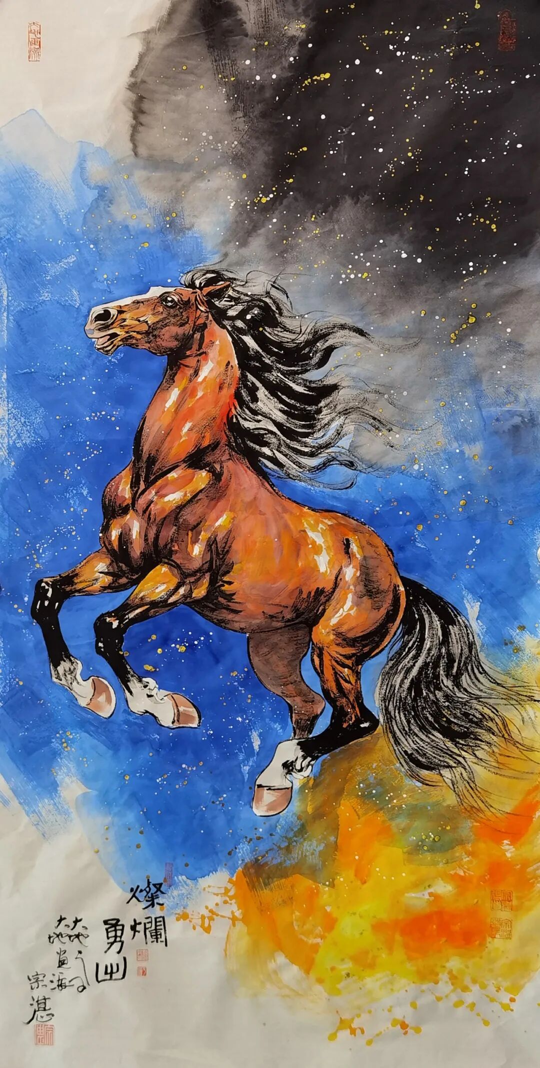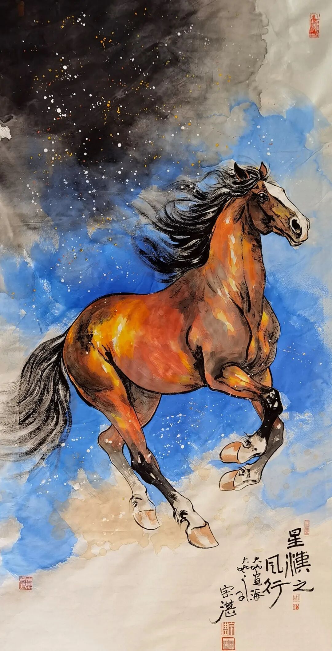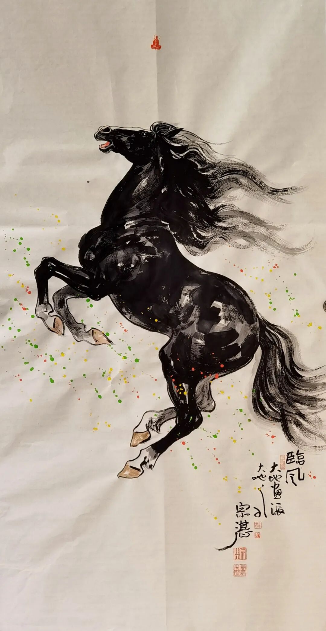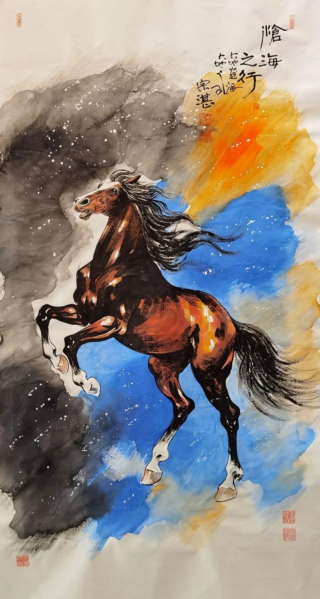 这批马系列作品,是他依托深厚艺术修养打造的马年专属题材佳作。作品形象版面背景以赤红泼墨狂草题写“宗湛”二字,笔墨张力呼应大地画派“以墨载心、以艺传情”的艺术内核;题字与注解的搭配,更将传统文脉底蕴与当代实力派艺术大家的视野相融合。这一艺术形象,既是他扎根大地、以奔马寄情抒怀的创作追求具象化呈现,也是“大地之子”于海融合传统美学与现代艺术语言的生动写照——于艺中悟理,于理中焕彩,让大地画派的艺术探索成为传统美学当代表达的鲜活载体。