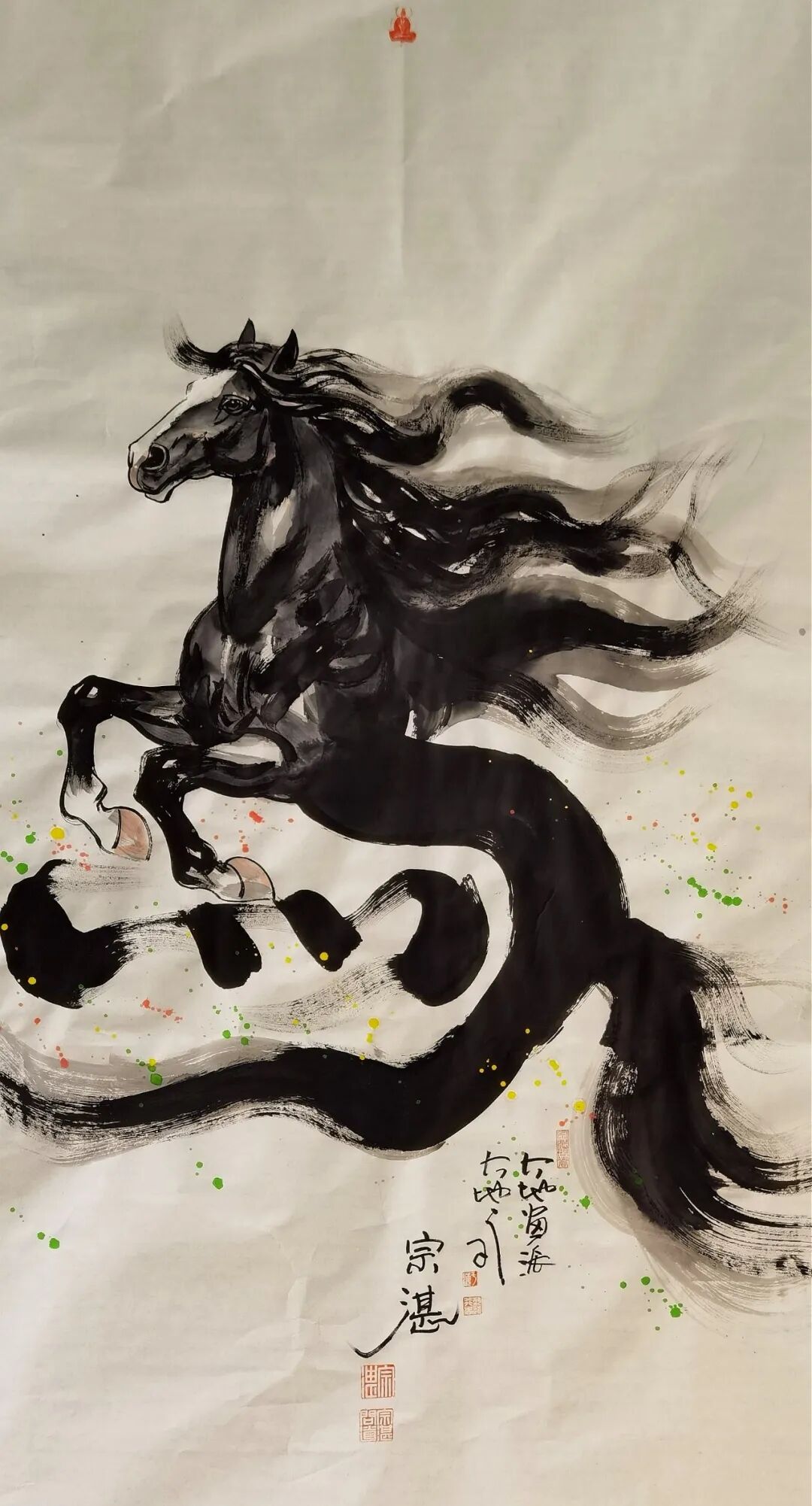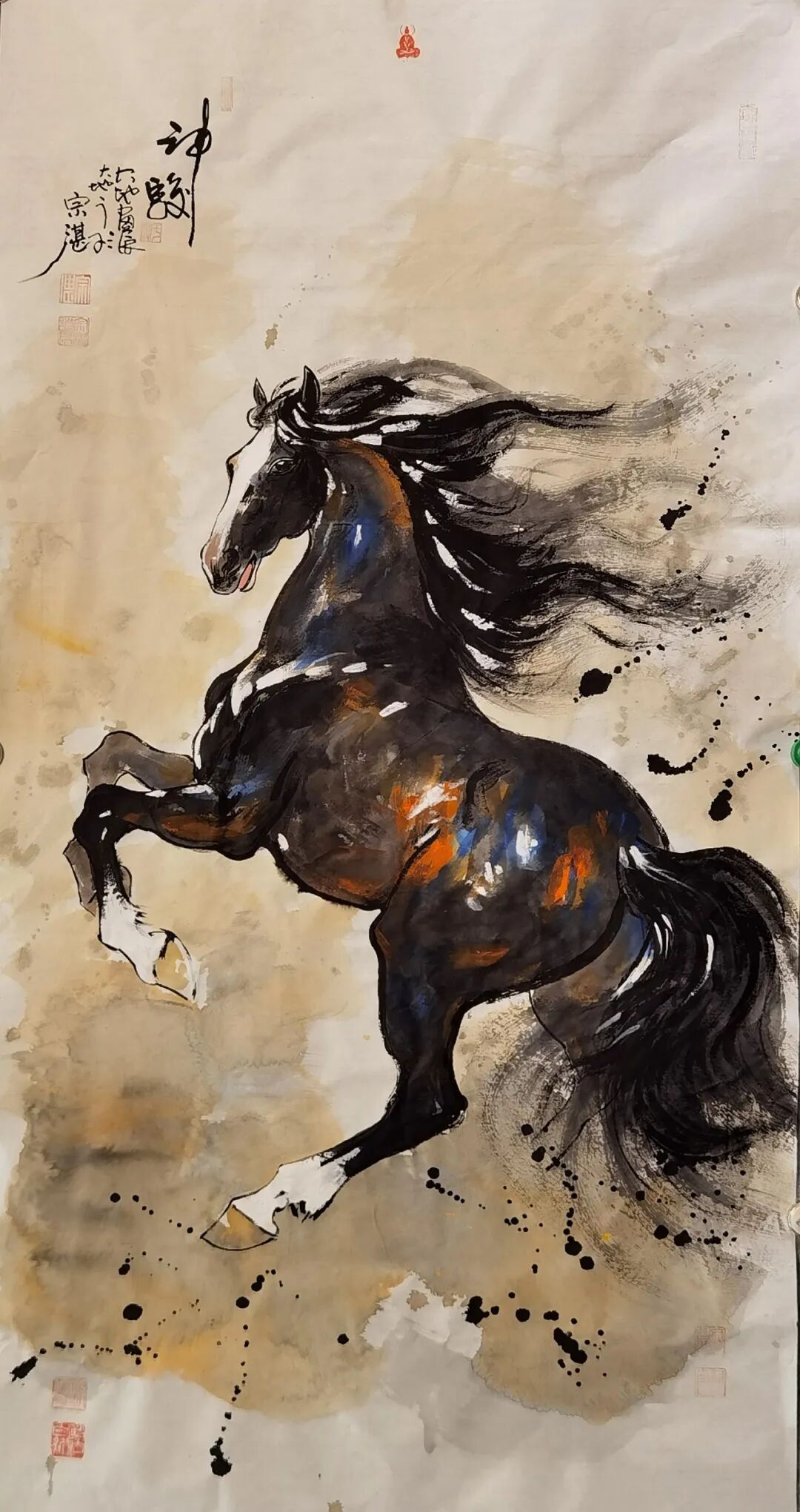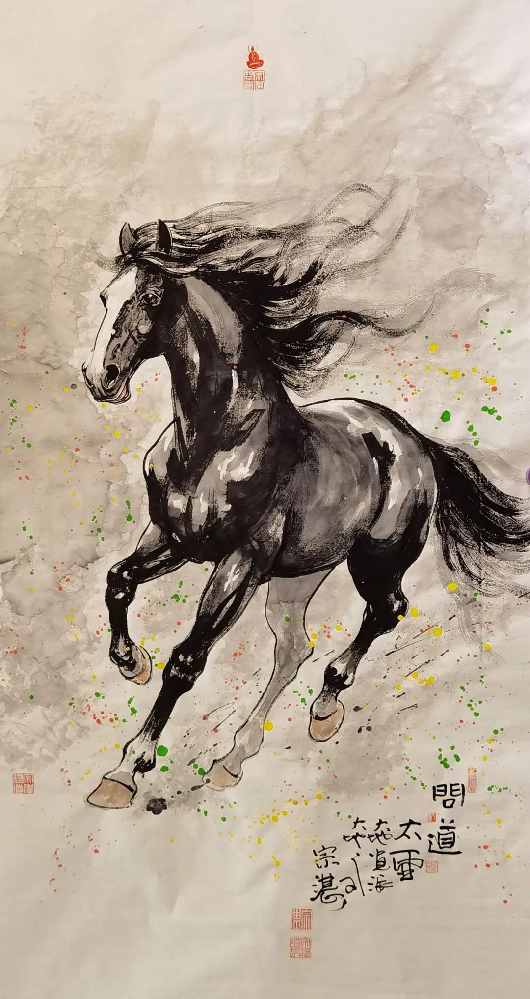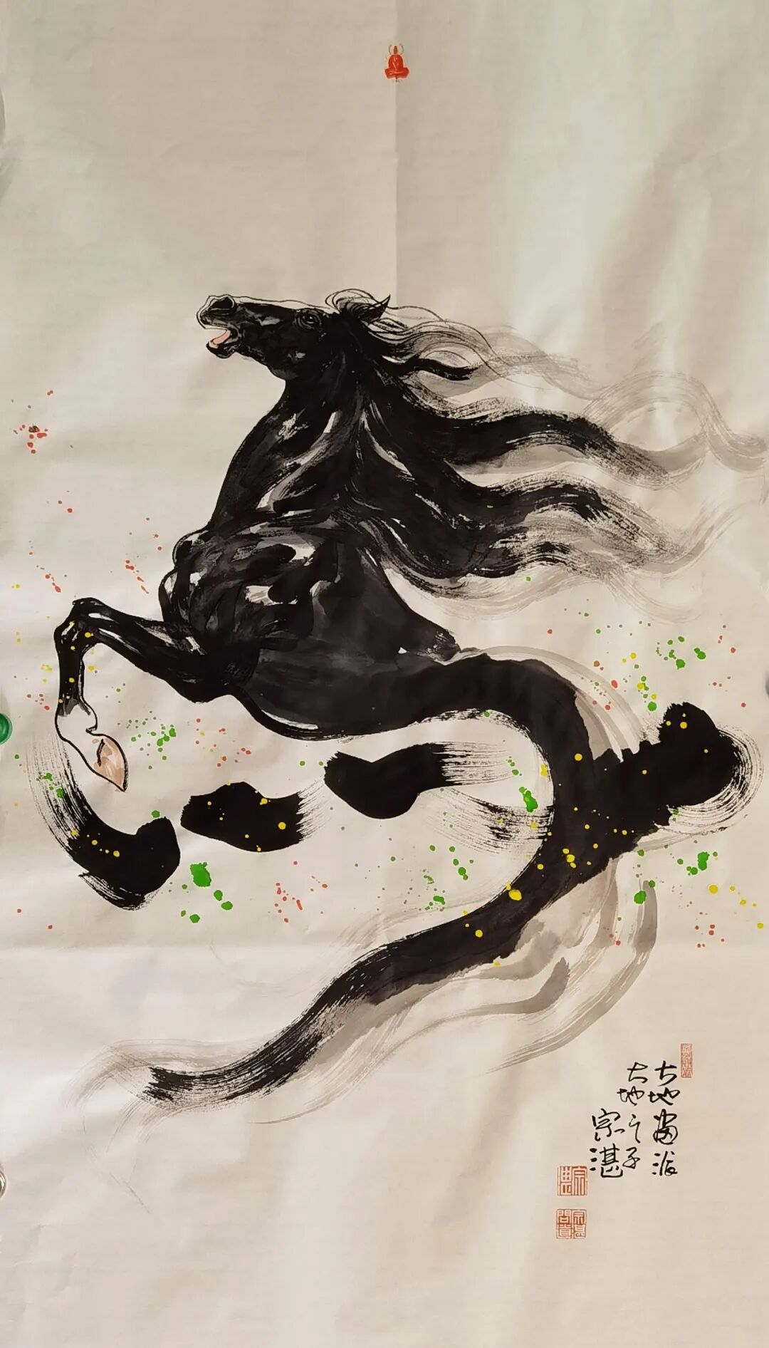 这批马系列作品,是他依托深厚艺术修养打造的马年专属题材佳作。作品形象版面背景以赤红泼墨狂草题写“宗湛”二字,笔墨张力呼应大地画派“以墨载心、以艺传情”的艺术内核;题字与注解的搭配,更将传统文脉底蕴与当代实力派艺术大家的视野相融合。这一艺术形象,既是他扎根大地、以奔马寄情抒怀的创作追求具象化呈现,也是“大地之子”于海融合传统美学与现代艺术语言的生动写照——于艺中悟理,于理中焕彩,让大地画派的艺术探索成为传统美学当代表达的鲜活载体。
