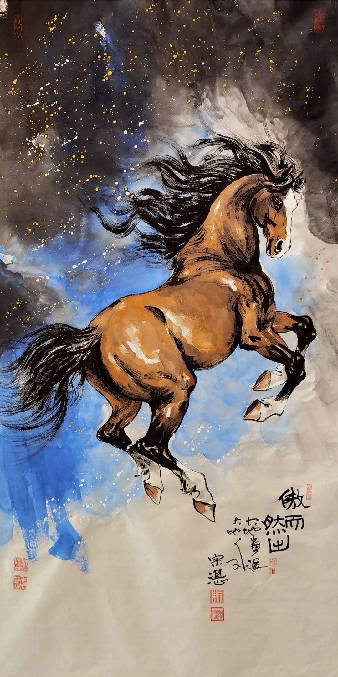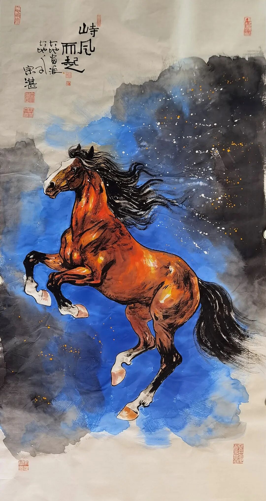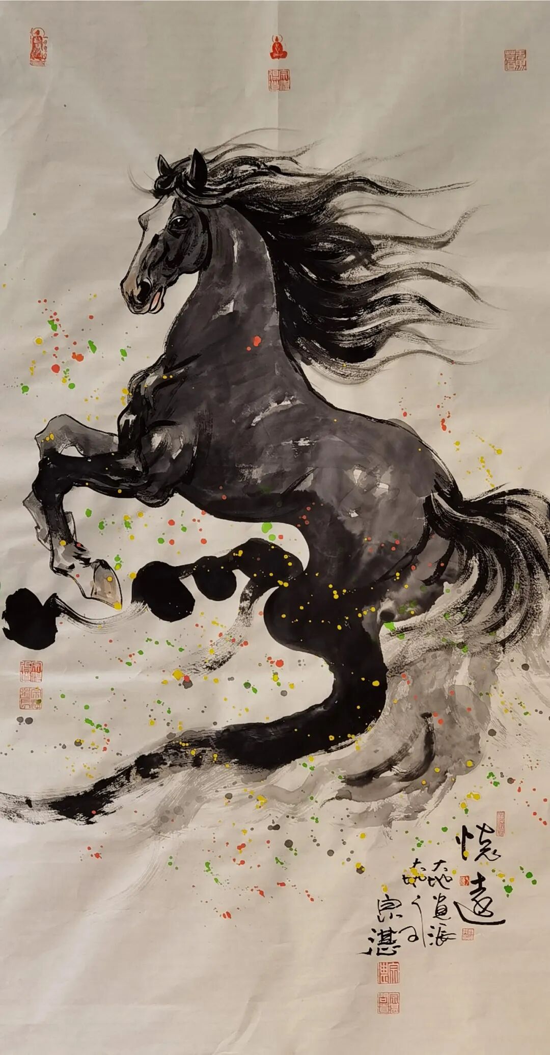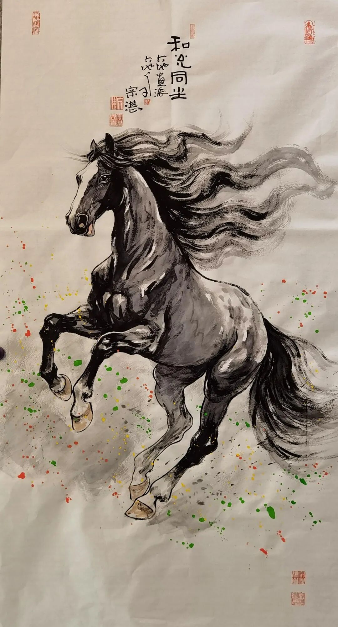 这批马系列作品,是他依托深厚艺术修养打造的马年专属题材佳作。作品形象版面背景以赤红泼墨狂草题写“宗湛”二字,笔墨张力呼应大地画派“以墨载心、以艺传情”的艺术内核;题字与注解的搭配,更将传统文脉底蕴与当代实力派艺术大家的视野相融合。这一艺术形象,既是他扎根大地、以奔马寄情抒怀的创作追求具象化呈现,也是“大地之子”于海融合传统美学与现代艺术语言的生动写照——于艺中悟理,于理中焕彩,让大地画派的艺术探索成为传统美学当代表达的鲜活载体。