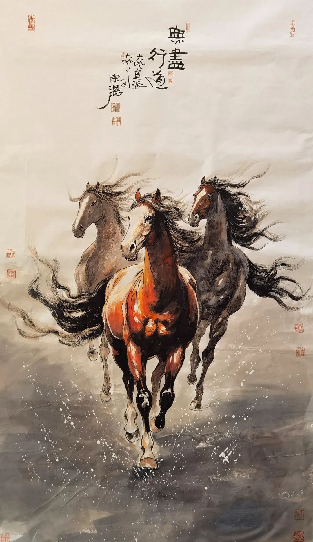 大地画派近四十载,踏尽崎岖大道平,从“问道艺途”到“深耕不辍”,从“探研技法”到“弘扬文化”,以艺为舟,以心为舵,载大地之魂,渡艺海之波。2026丙午马年,春回大地,骏骥开途,于海先生(号宗湛)以这批厚彩马作贺岁,非为赏玩,乃为明志:艺在心中,艺以载情,大地恒昌,文化不息。愿以笔下龙马,迎四海春风,愿以心中热忱,伴九州奋进;愿马年里,人人如骏骥健行,笃行不怠,共赴“大道之行也,天下为公”之境,共绘大地山河生生不息之卷!