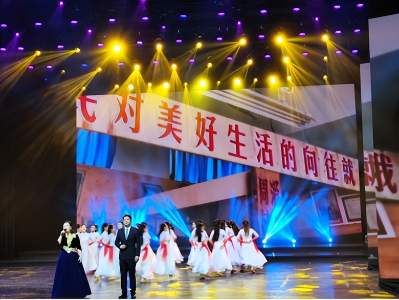 容纳千余人的剧场一楼座无虚席。舞台上:灯光璀璨,歌声悠扬,舞蹈精彩;影屏中:“三转一响”的老物件,热闹繁华的周村大街、健康快乐的群众、朝气蓬勃的学生、宏伟的淄博地标、快速的高铁驰骋,空中的飞机翱翔;精彩展示着民富国强,从时代记忆的回望,向美好生活的前行。