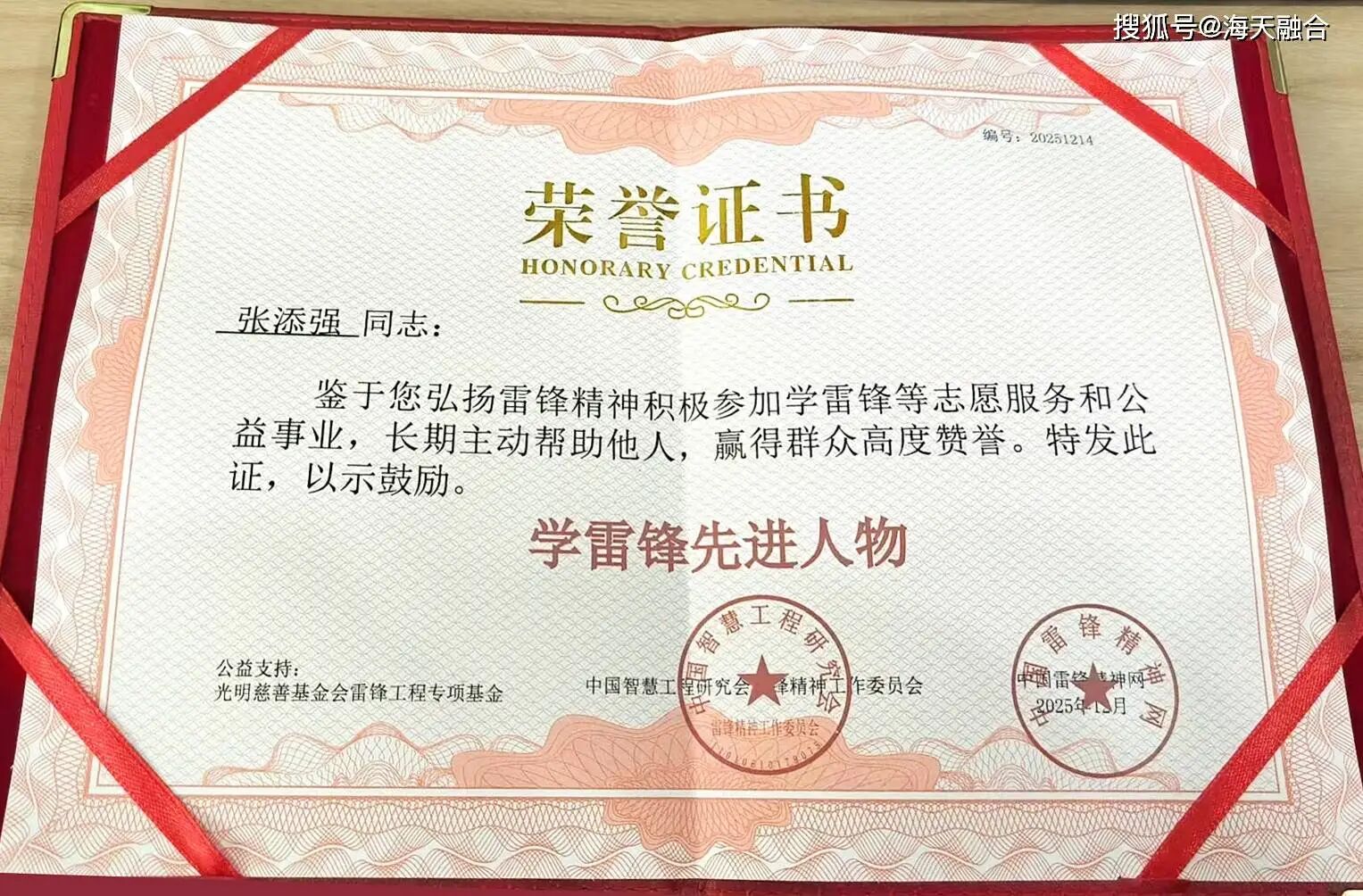 近日,中国时事新闻网辽宁编辑部副主任张添强获聘(教育部主管)中国智慧工程研究会雷锋精神工作委员会理事,并在光明慈善基金会雷锋工程专项基金的支持下,由中国智慧工程研究会雷锋精神工作委员会与中国雷锋网联合主办的评选活动中,经多方评审一致决定:授予张添强同志“学雷锋先进人物”荣誉称号。