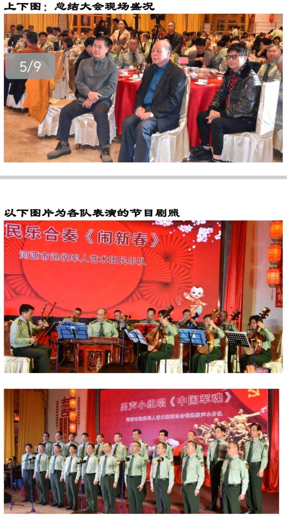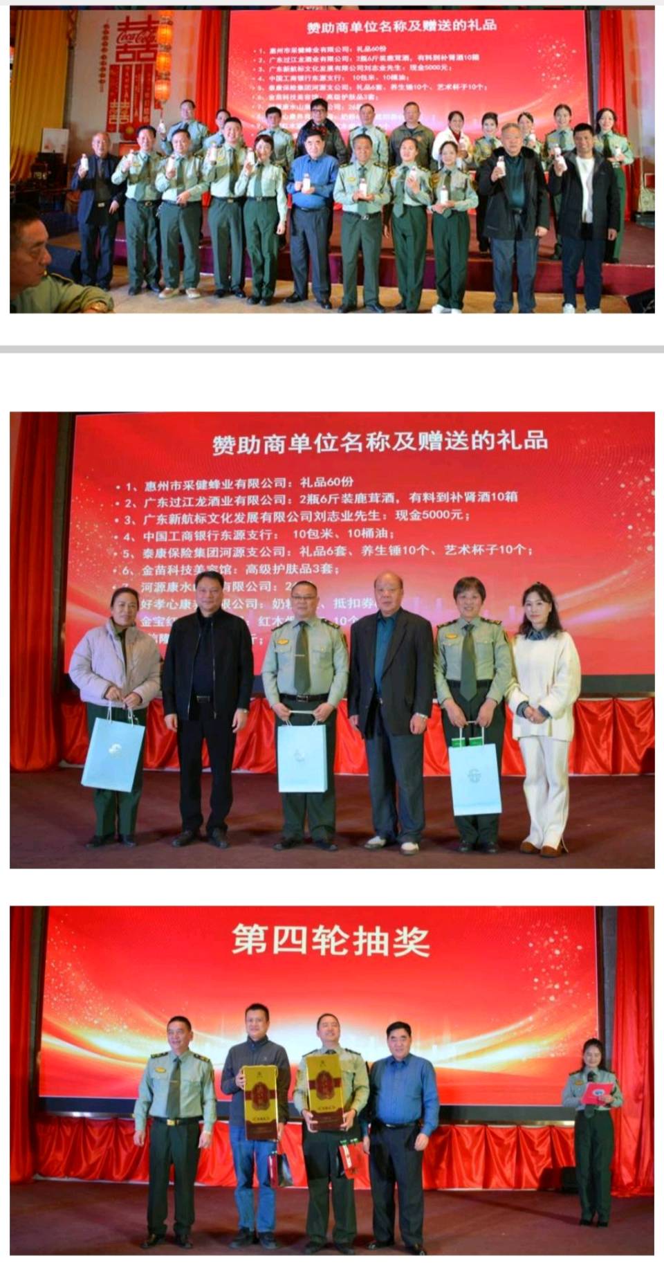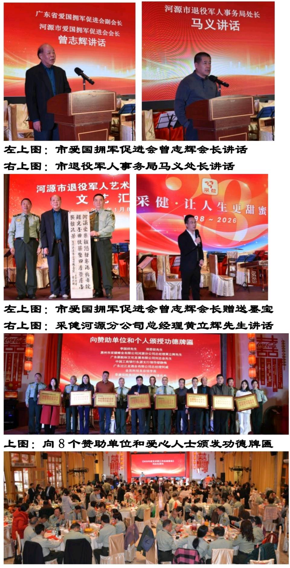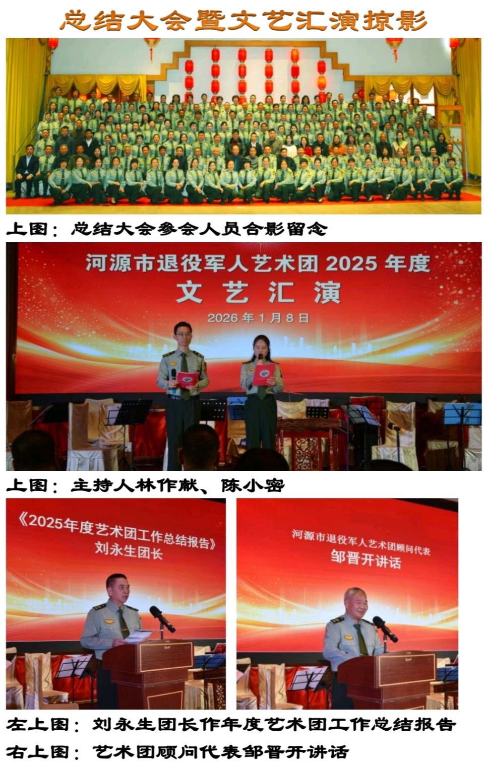 岁序更替,华章日新。2026 年 1 月 8 日,新丰江畔的年辉渔村华灯璀璨、暖意融融,河源市退役军人艺术团 2025 年终总结大会暨文艺汇演,在雄壮嘹亮的中华人民共和国国歌声中隆重拉开帷幕。市退役军人事务局领导、市爱国拥军促进会领导、艺术团顾问、源城和东源的退役军人志愿者服务队代表、来自有关单位的特邀代表、活动赞助商代表、以及艺术团全体团员,共计 200 多人齐聚一堂,共话年度发展成果,共赏精彩文艺盛宴。会上,刘永生团长代表艺术团作 2025 年度工作总结报告。报告开篇致谢市退役军人事务局的悉心指导、市爱国拥军促进会的鼎力协助,以及社会各界的关心支持。大会特别设置爱心奉献表彰环节,对为艺术团发展作出突出贡献的先进个人与单位予以表彰授牌。参战老兵李国祥,两年来累计为艺术团捐款 40 余万元,以实际行动为团队发展注入强劲动力;艺术团副秘书长邓思钦,不仅无偿腾出场地作为团队排练大厅与文化活动室,更慷慨解囊,以个人工资捐款助力团队建设。在全场热烈的掌声中,两位战友依次登台,分别接过镌刻着“国祥仁心施大爱,艺团兴盛念隆恩”、“思钦心襄艺事,宾馆倾情暖兵心”的荣誉牌匾。与此同时,艺术团还为工商银行河源支行、泰康保险集团河源支公司、广东过江龙酒业有限公司、惠州采健蜂业有限公司、金苗美容及刘志业先生等赞助单位与个人,逐一回赠荣誉牌匾,以此致谢他们的鼎力相助,现场敬意与掌声交织,暖意浓浓。值得一提的是,艺术团顾问邹国忠先生因出差外地未能亲临参会,但他始终心系艺术团发展,特意为本次总结大会发来祝贺诗文。邹老诗曰:“艺术之花四季红,新丰江畔沐春风。青春永葆长歌放,剑气如虹傲碧空。” 这篇题为《致敬河源市退役军人艺术团,并祝艺术团年终大会圆满成功》的诗文,字里行间饱含着对艺术团的深切关怀与殷切期望。该诗文已于大会现场宣读,后续将由团部正式发文存档。市爱国拥军促进会曾志辉会长,有感于艺术团合唱队开年比赛勇夺金奖的佳绩,在大会现场亲书贺诗一幅赠予艺术团,诗曰:“河源雅韵绕梁音,爱乐和声动粤深;新岁舞台金奖耀;湾区共赞韵流金”。热烈祝贺合唱团载誉而归,高度赞美其精湛的艺术水准,生动展现了艺术团的艺术成就与广泛影响力。墨宝飘香间,尽显对退役军人艺术风采的高度赞誉。随后,刘永生团长的报告全面梳理年度工作成果,从八个方面系统总结艺术团 2025 年的奋进足迹:一是顺利完成换届选举,筑牢组织建设根基;二是深耕基层文化阵地,开展多场惠民演出;三是远赴外地交流展演,载誉而归彰显风采;四是精心创编特色节目,内容新颖广受好评;五是走进校园深化双拥,厚植军民鱼水深情;六是服务企业助力发展,贡献文化赋能力量;七是积极投身公益事业,传递退役军人温暖;八是拓宽资金筹集渠道,保障团队稳健运作。报告特别指出,艺术团合唱团实力斐然,在省内外多项歌唱比赛中斩获金奖;公益演出足迹遍布城乡,赢得社会各界广泛认可与赞誉。报告既对年度工作成效予以高度肯定,也客观剖析了发展中存在的短板不足,并明确 2026 年发展方向,艺术团将继续秉持“传承军魂,服务人民”的宗旨,凝心聚力推动各项工作再上新台阶。市退役军人事务局马义处长、市爱国拥军会会长曾志辉、艺术团顾问邹晋开、赞助商代表采健蜂业有限公司河源分公司总经理兼源城区政协委员黄立辉先后登台致辞。他们对艺术团 2025 年在文化惠民、双拥共建、公益服务等领域取得的丰硕成果给予高度评价,同时寄语艺术团在新的一年里,继续发挥退役军人的优良作风与独特优势,唱响主旋律、传播正能量,谱写更加绚丽的时代篇章。文艺汇演环节精彩纷呈,成为本次大会的一大亮点。民乐合奏悠扬婉转,奏响时代强音;萨克斯合奏铿锵豪迈,尽显军人风采;独唱曲目声情并茂,传递赤子之心;舞蹈表演灵动飘逸,绽放艺术魅力;诗朗诵慷慨激昂,抒发家国情怀;走秀节目英姿飒爽,展现老兵风范„„一个个精心编排的节目轮番上演,赢得现场观众阵阵掌声。演出充分展现了艺术团团员们多才多艺的风采,更彰显出退役军人“退役不褪色、建功新时代”的昂扬风貌,以及团员们凝心聚力、无私奉献、共建幸福家园的深厚情怀。为增添大会的欢乐喜庆氛围,组委会特别设置了抽奖环节。得益于赞助商的鼎力支持,本次抽奖奖品种类繁多、丰厚实用。经过四轮紧张又热烈的抽奖,经测算共有 45%的参会人员抽得心仪礼品,现场掌声、欢呼声此起彼伏,将大会氛围推向新的高潮。本次年度总结大会暨文艺汇演的圆满成功,离不开多方力量的协同发力:艺术团领导班子站位高远、精心谋划、及早筹备,为大会顺利召开筑牢坚实基础;各队队长亲力亲为,认真组织排练汇演节目,以高质量的演出为大会添彩;会务组人员废寝忘食、加班加点,细致做好各项会务保障工作,确保大会各环节有序推进。冬去春来万象新,砥砺奋进正当时。站在新的起点,河源市退役军人艺术团将以此次大会为契机,踔厉奋发、勇毅前行,在传承红色基因、服务社会大众的道路上续写新的