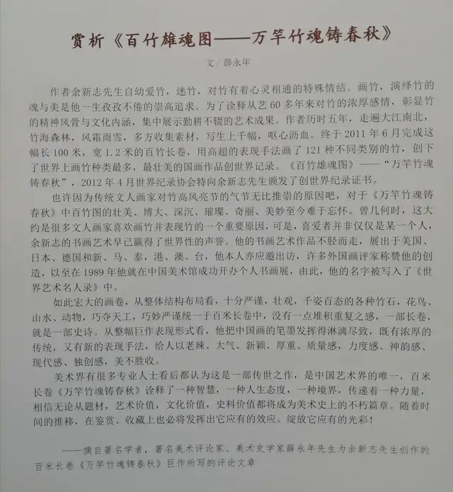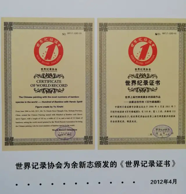 2011年6月,国画大师余新志老师历时5年完成了一幅幅长100米,宽1.2米的百竹长卷,用高超的表现手法画了112种不同类别的竹子,创下了世界上画竹种类最多,最壮美的国画作品创世界记录。《百竹雄魂图》——“万竿竹魂铸春秋”,2012年4月被世界纪录协会向余新志先生颁发了创世界纪录证书。