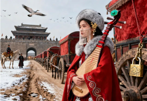 翟车华盖,仪仗煊赫,她端坐于这片陌生的荣光里,指腹反复摩挲怀中琵琶——