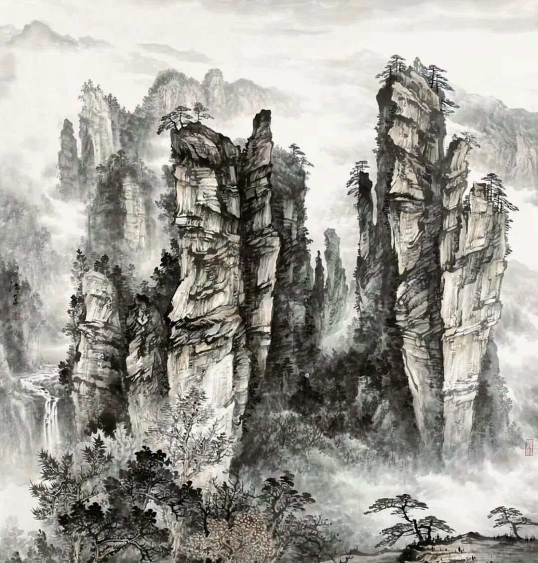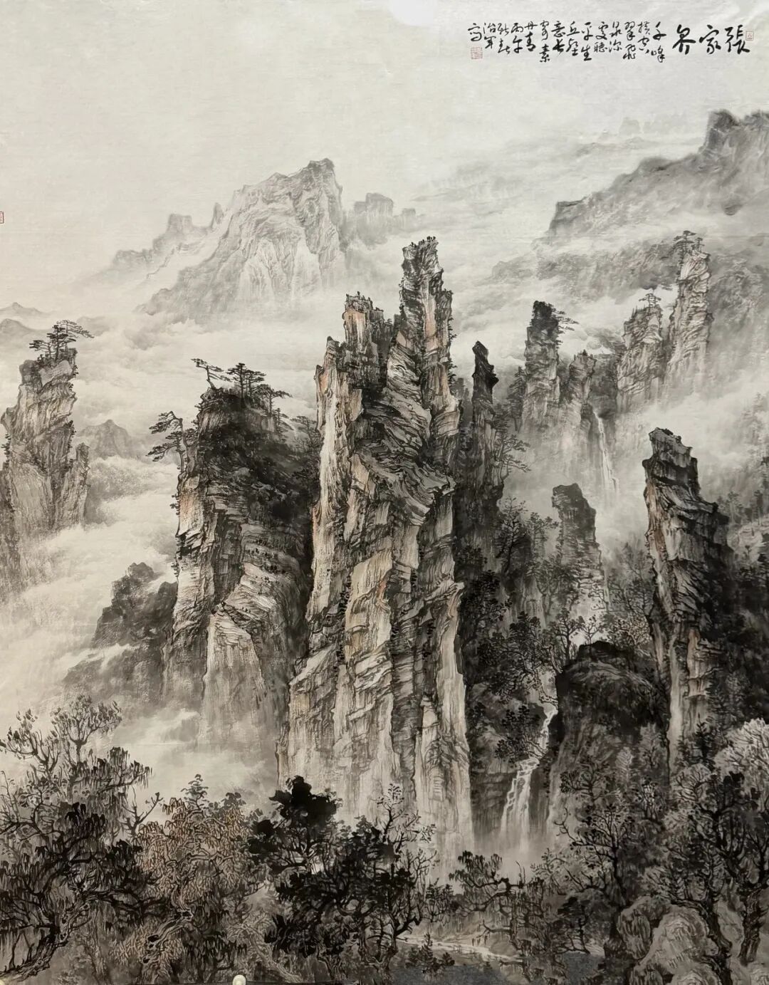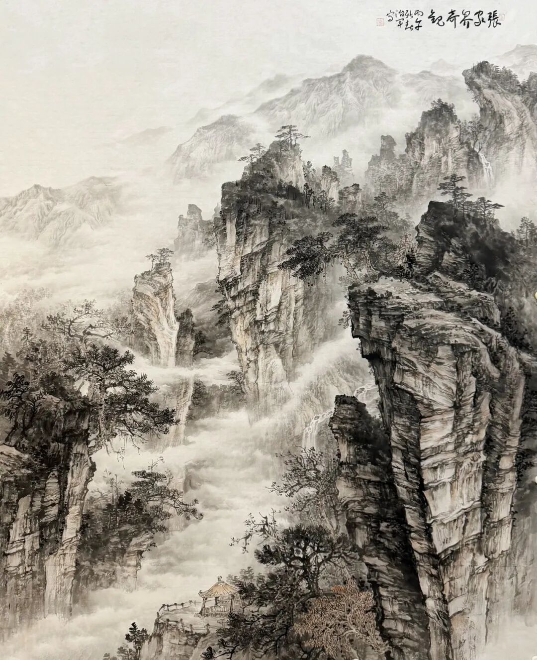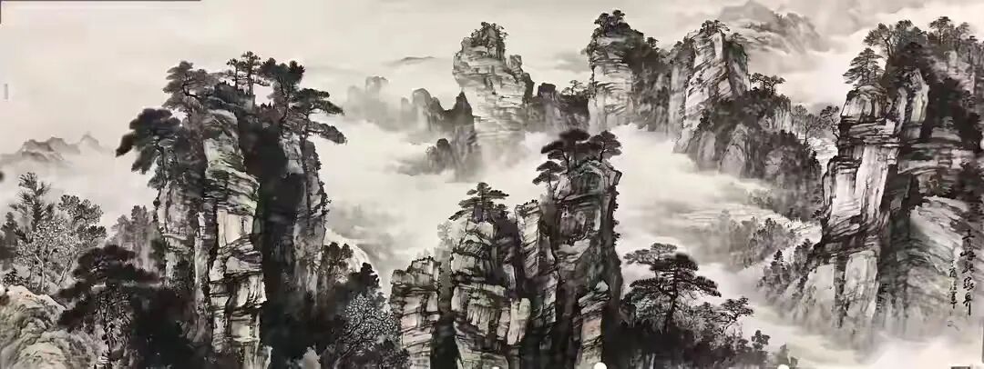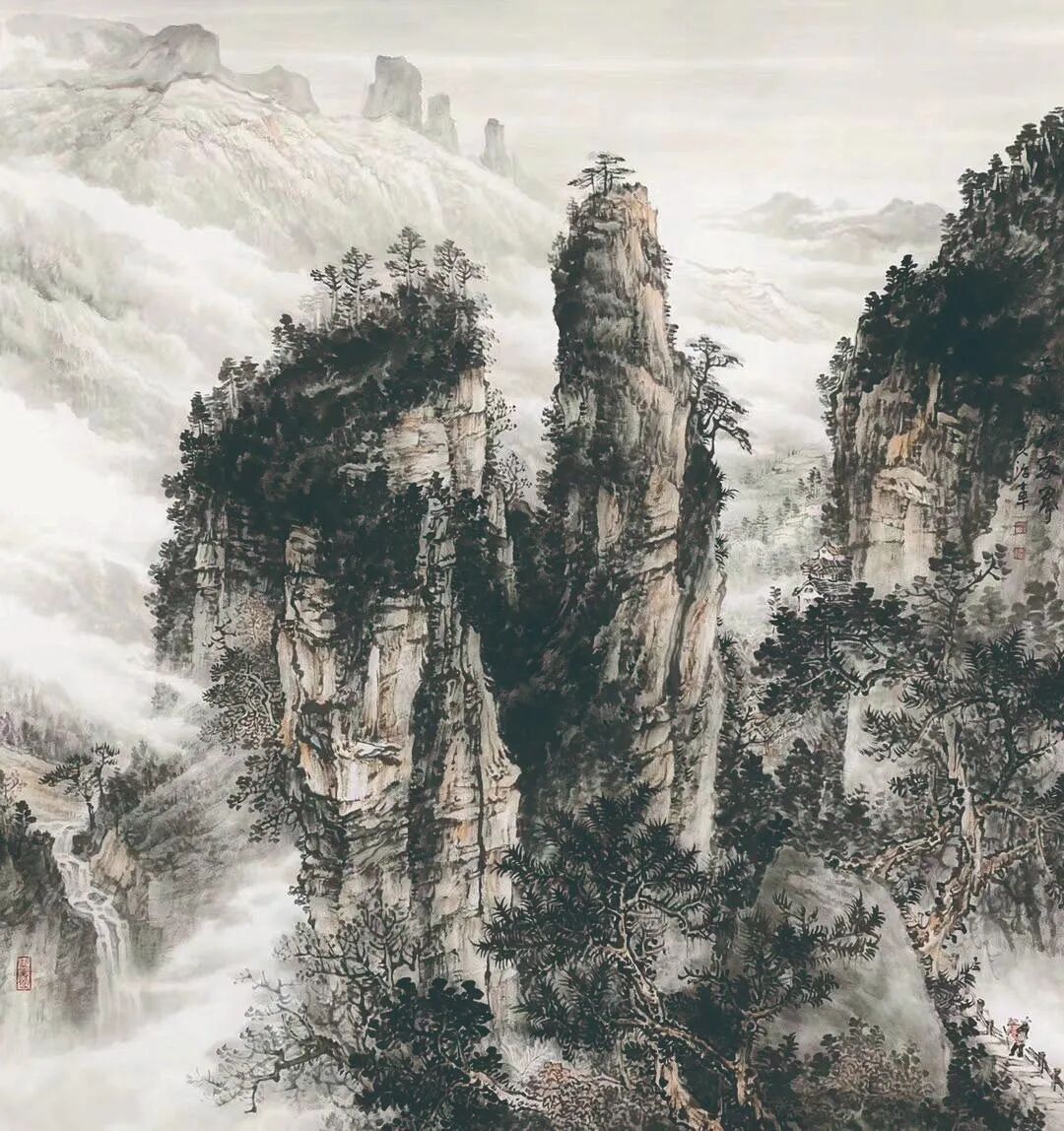 在童治军先生的笔下,张家界的雄、奇、险、秀、幽、野、怪展现的淋漓尽致,那些山,千姿百态,奇特诡谲,既粗犷又细密,浑朴中略带狂狷,威猛中又挟妖媚,真是雍容大气又不失妙趣横生,看那陡峭的石柱,岩壁上生长的苍松翠柏,迷雾氤氲缭绕,画中体现的忽隐忽现如在仙境般的意境,非常唯美。(文/南雁)