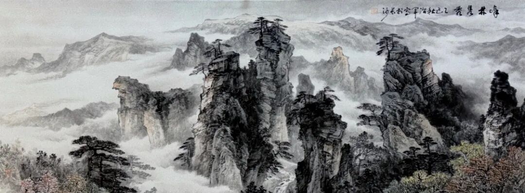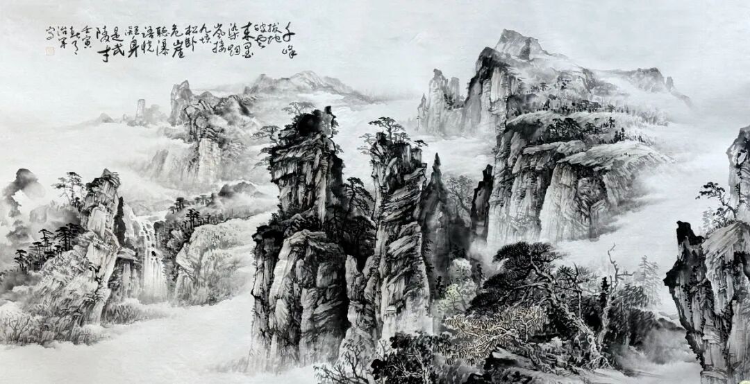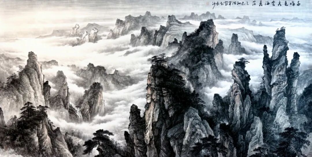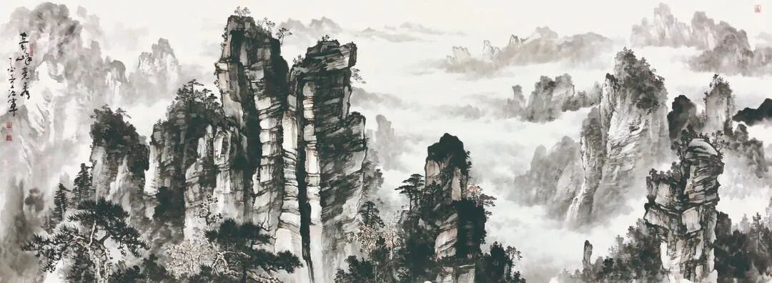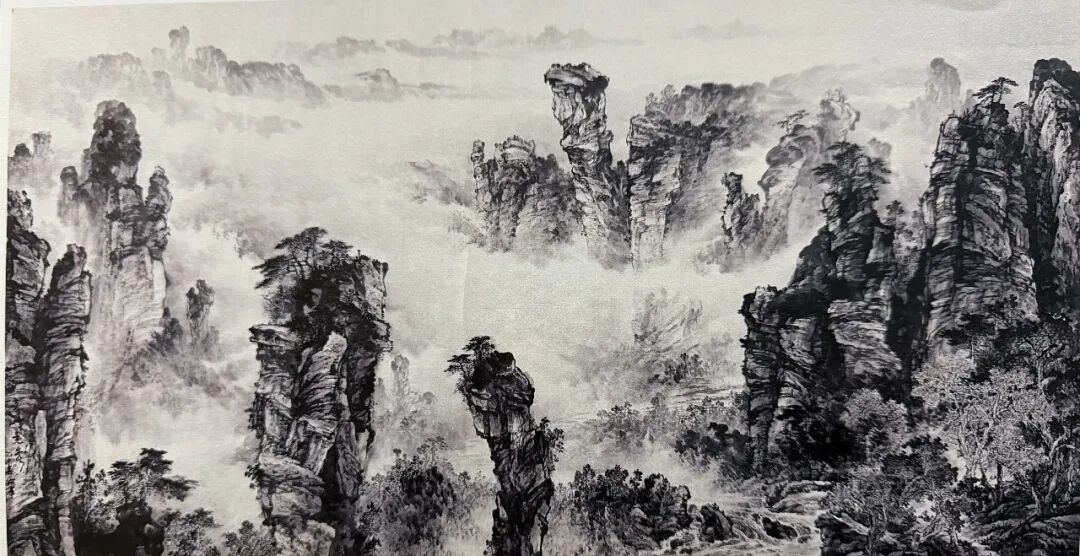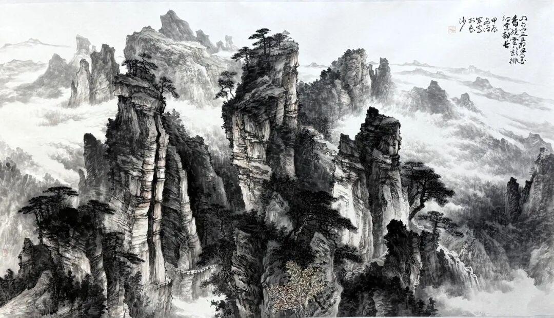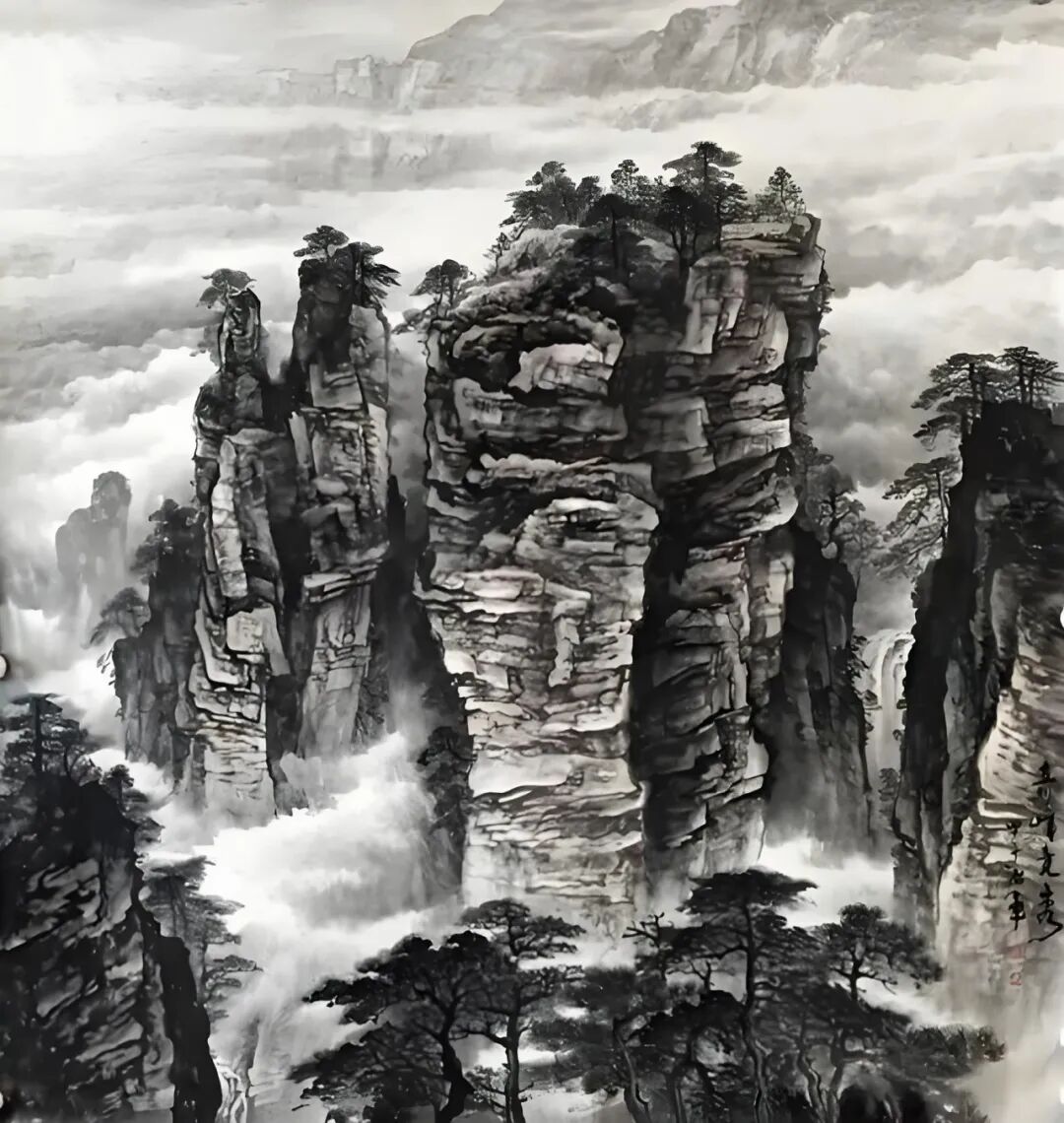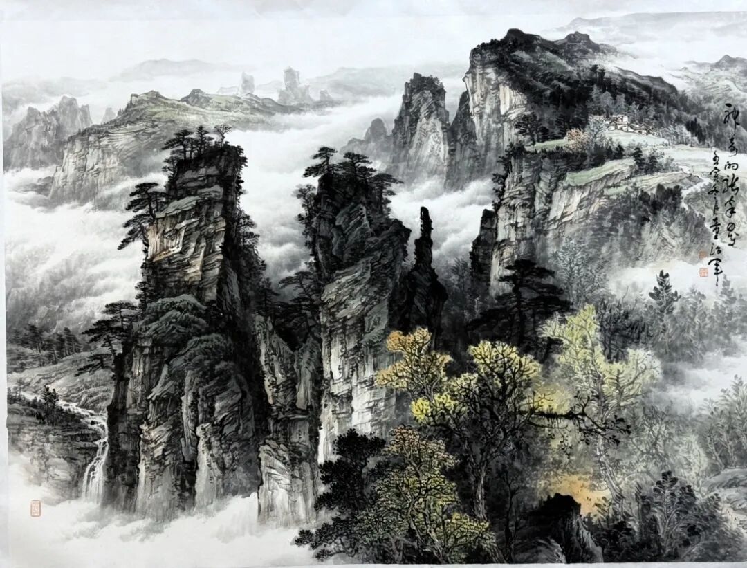在童治军先生的笔下,张家界的雄、奇、险、秀、幽、野、怪展现的淋漓尽致,那些山,千姿百态,奇特诡谲,既粗犷又细密,浑朴中略带狂狷,威猛中又挟妖媚,真是雍容大气又不失妙趣横生,看那陡峭的石柱,岩壁上生长的苍松翠柏,迷雾氤氲缭绕,画中体现的忽隐忽现如在仙境般的意境,非常唯美。(文/南雁)