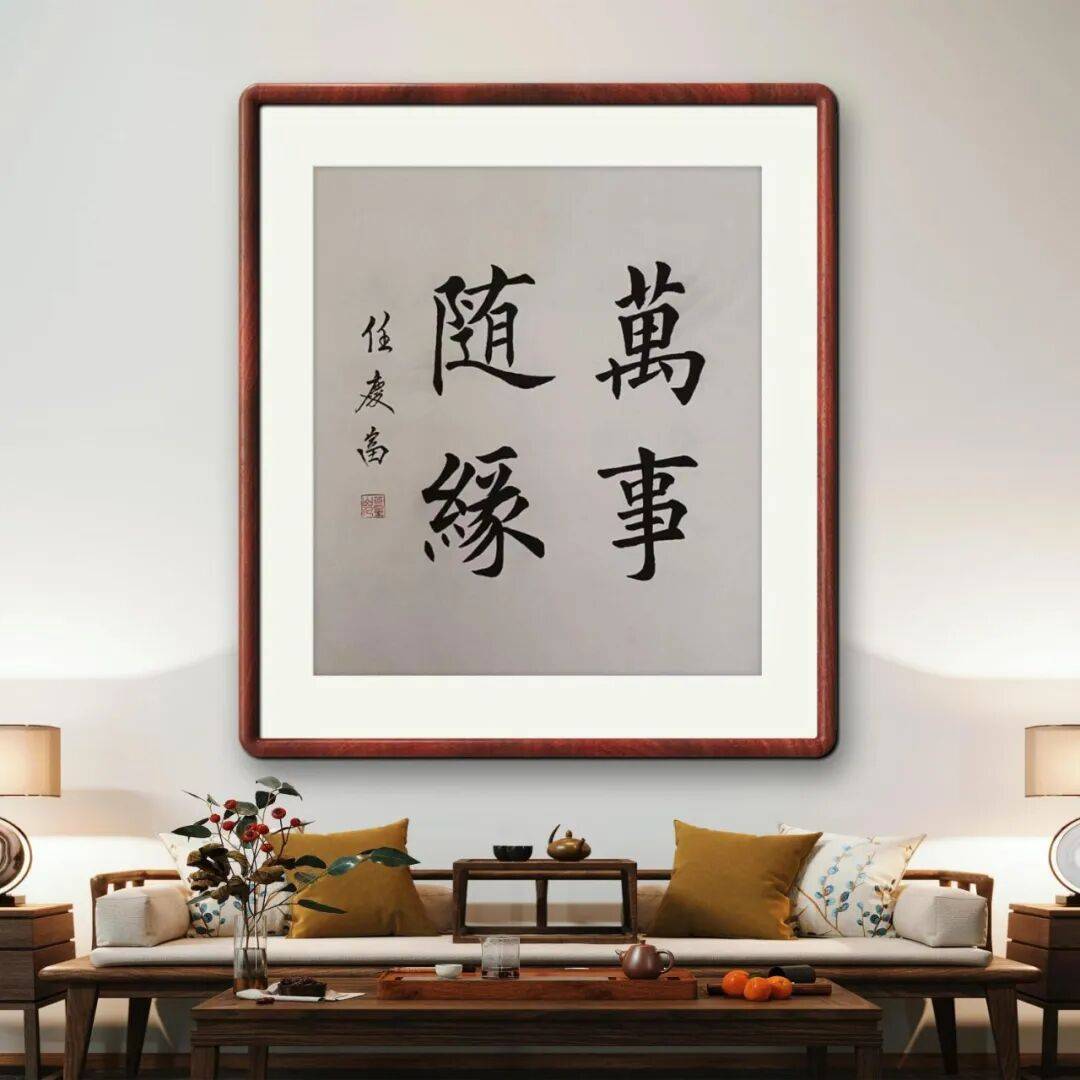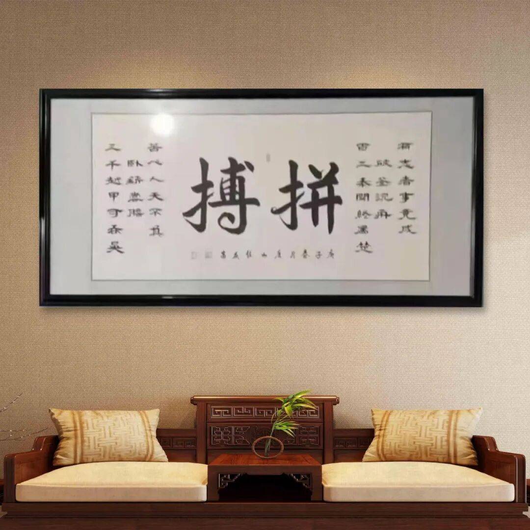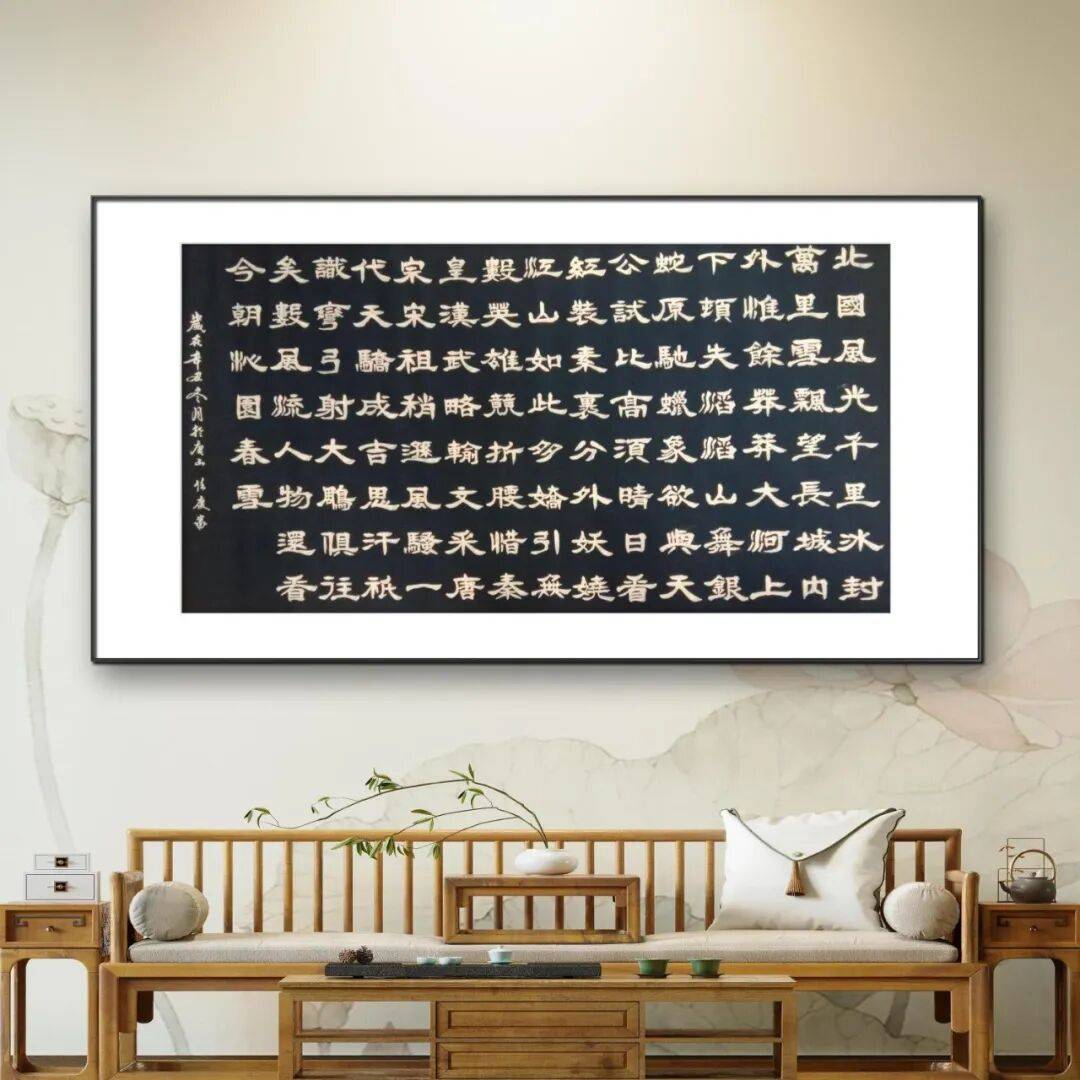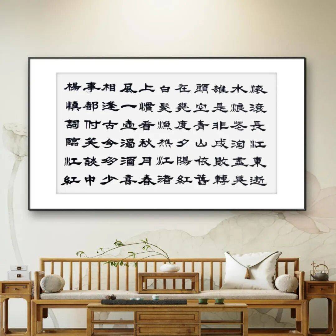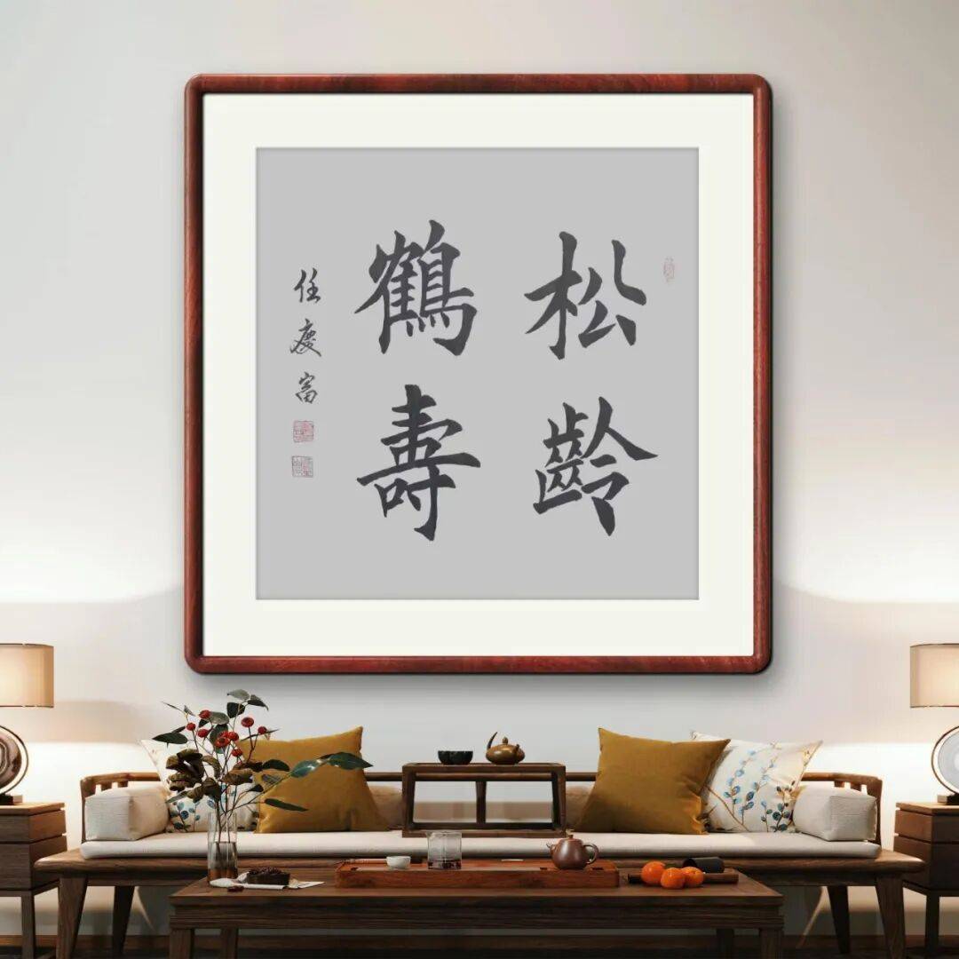 任庆富老师深知,书法的笔法从来不是孤立的技巧,而是与墨法、结体、章法浑然一体的整体。在墨法运用上,他不拘一格,浓淡干湿、枯润相生,变化丰富而又浑然天成。写行书时,墨色浓淡如晚霞染江,牵丝连绵似水波流转,将诗文的诗意与画面感融入笔墨之中;写楷书、隶书时,墨色温润饱满,浓而不滞,淡而不浮,尽显碑帖的庄重古朴;即便书写巨幅作品,也能精准把控墨色的晕染范围,让墨色与宣纸的肌理完美相融,焦墨见骨、润墨含韵,营造出层次丰富、意境悠远的视觉效果。在结体上,他兼顾平正与奇崛,重心平稳而疏密得当,字形或方或圆,或欹或正,在平正端庄中寓以巧妙变化,既取隶书之稳重,得楷书之严谨,又含行书之流动,做到了“疏可走马,密不透风”,每一个字都体态舒展、神采飞扬,兼具形美与神美。