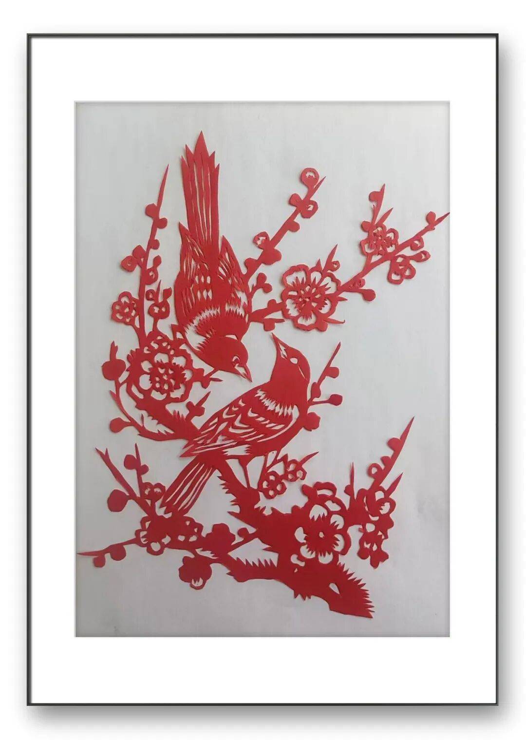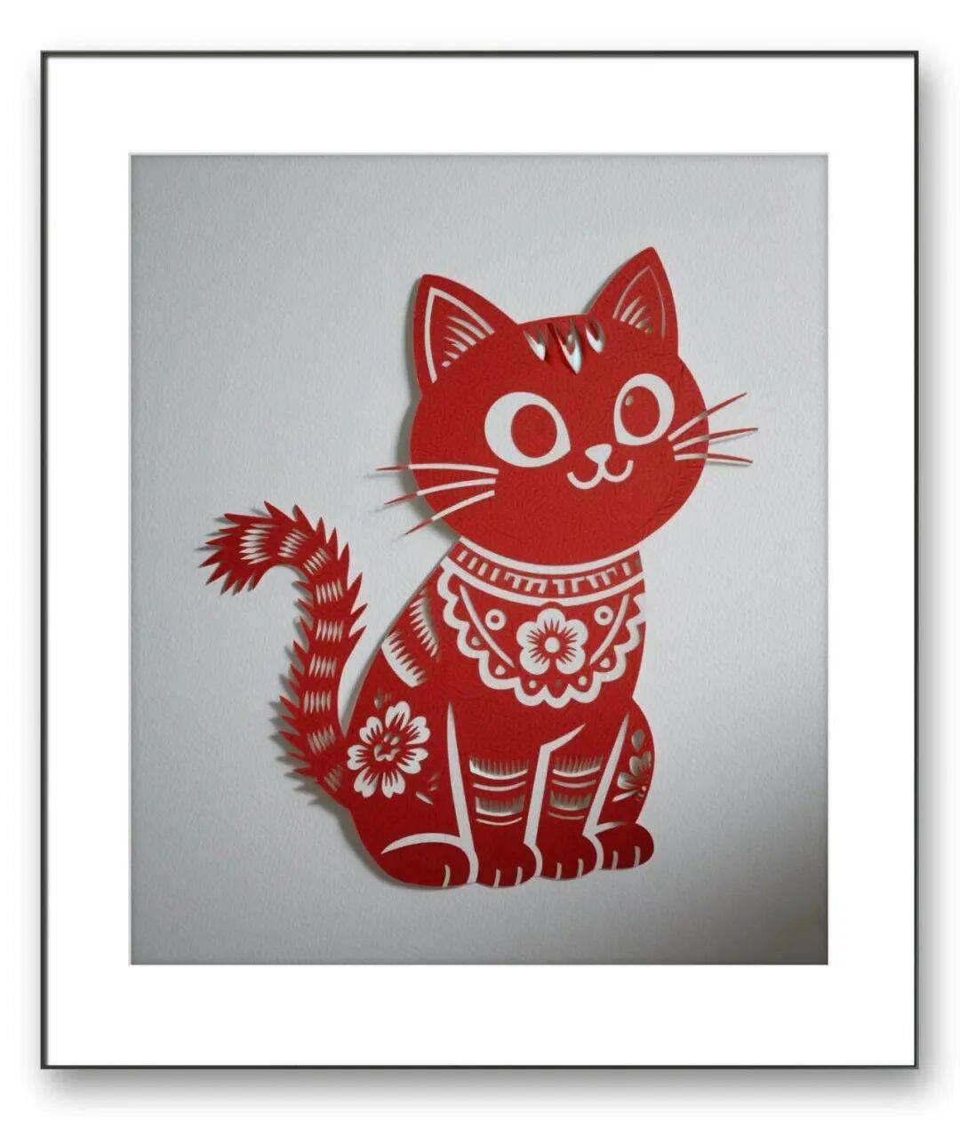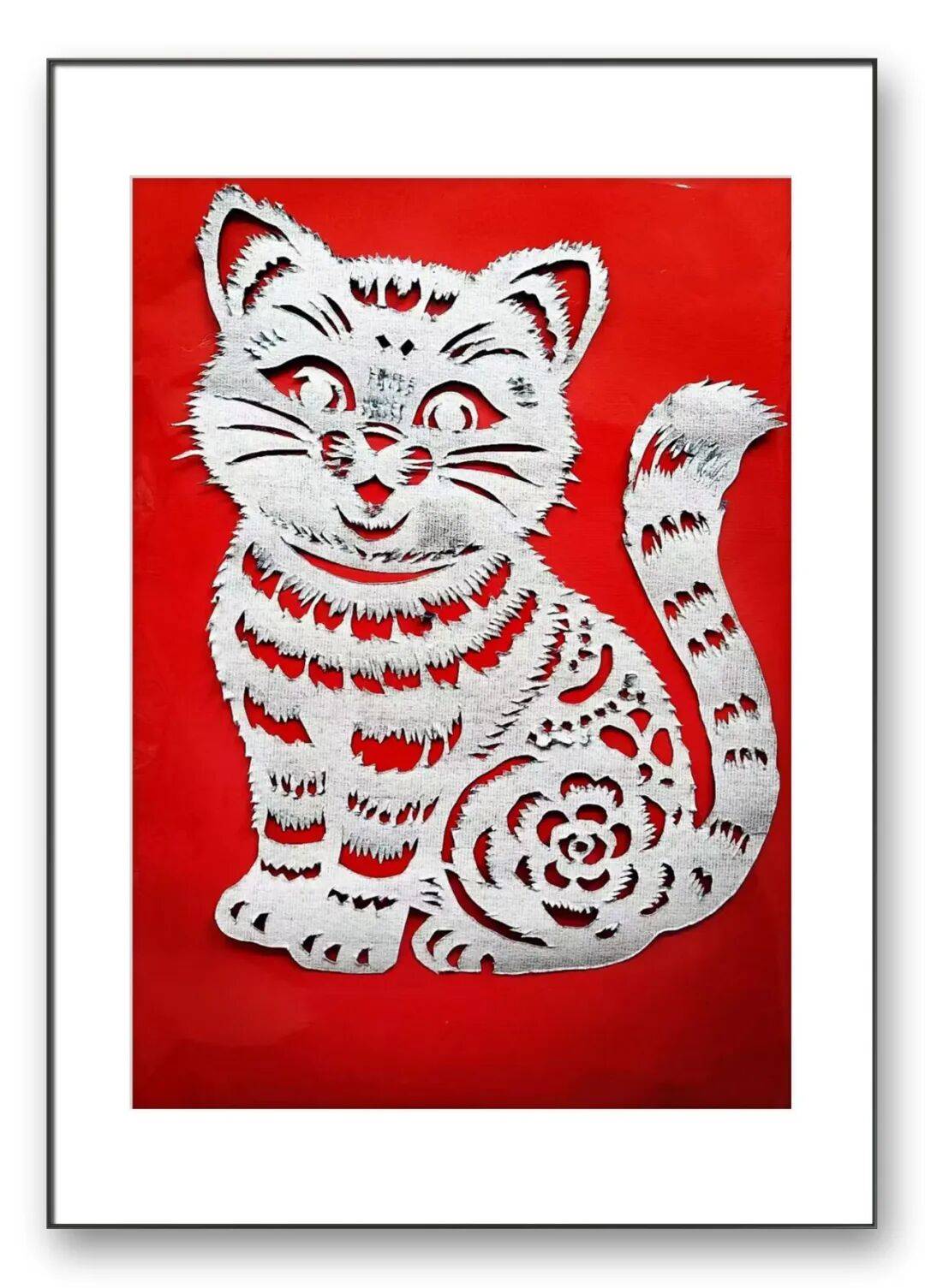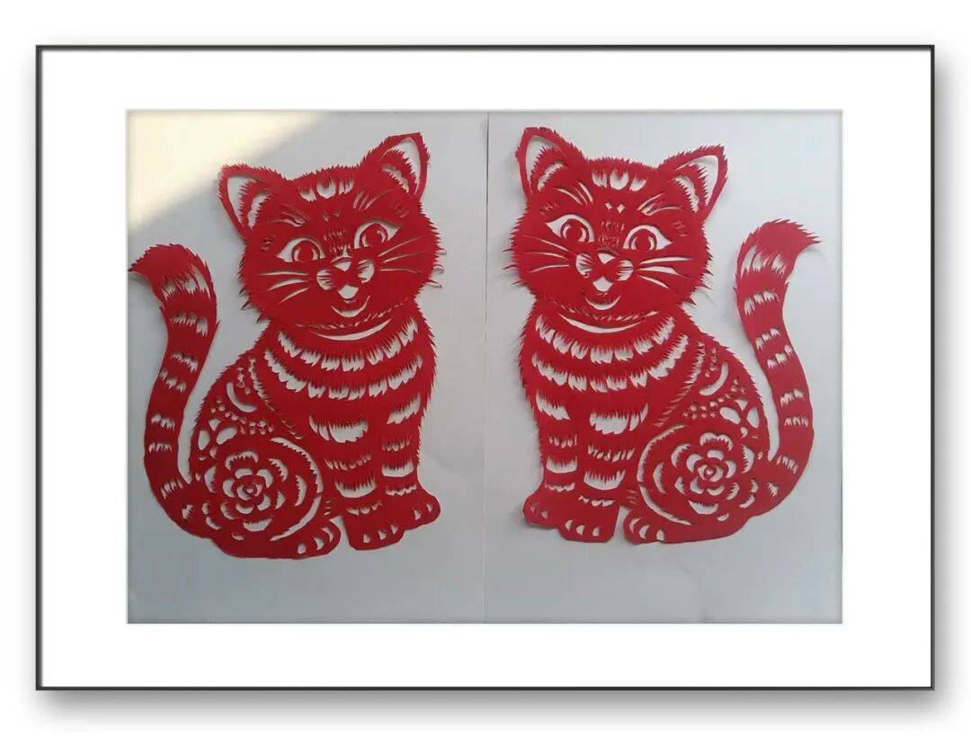 任老师的剪纸,刀工精湛得令人叹服。他深谙“稳准巧”的剪纸精髓,线条流转间兼具刚劲与细腻,既有北方剪纸的粗犷豪放,又不失江南剪纸的灵动精巧。细观其作,一厘米内可刻出细密纹路,虚实相生的剪法让图案层次分明,无论是“耄耋富贵”中猫蝶的灵动,还是吉祥纹样里线条的舒展,都尽显刀工的娴熟与匠心,所谓“千刀不落,万刀不断”,在他的作品中得到了生动诠释。