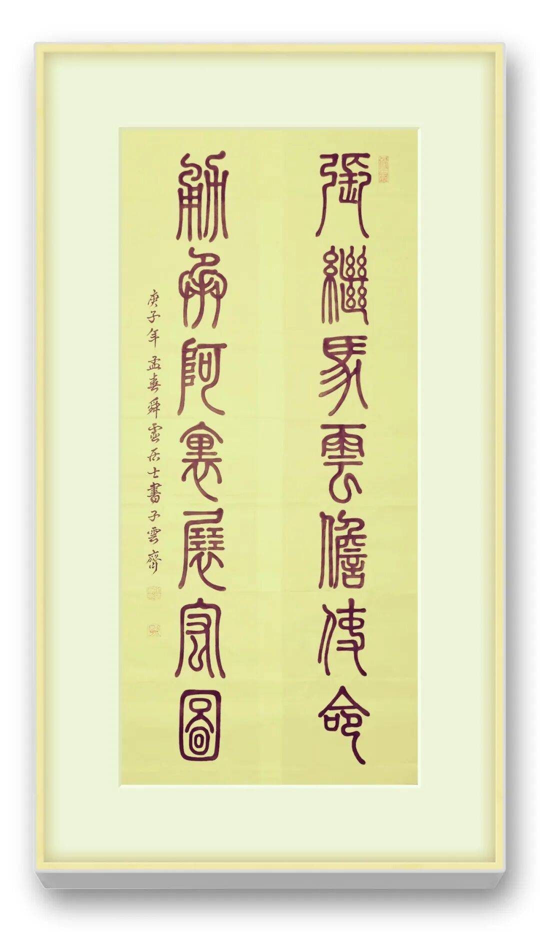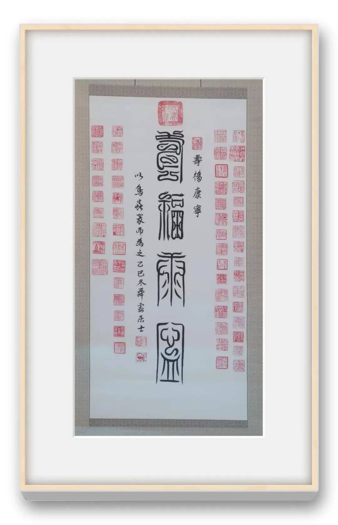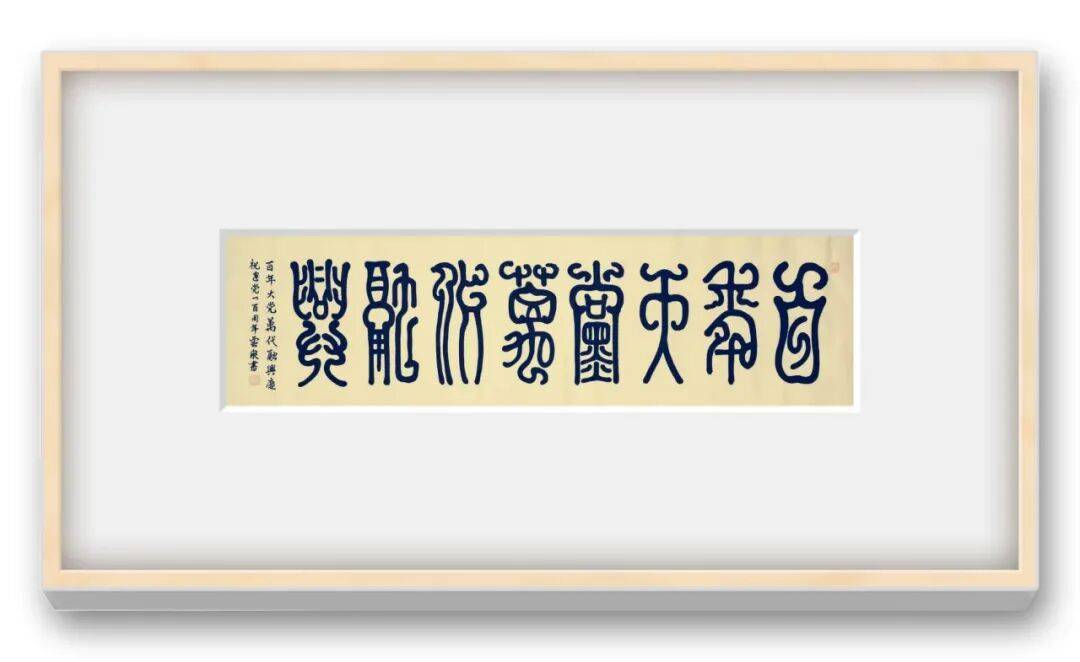 笔墨之间,藏着书家的匠心与巧思,而墨色的运用,更彰显着王海军老师对书法艺术的深刻体悟。他的篆书作品,墨色运用极具匠心,浓淡枯润相生,或如乌云蔽日,厚重沉凝;或如薄雾轻烟,空灵飘逸;或如春雨润物,细腻绵长,如“纤纤若新月之初天涯,落落犹众星之列河汉”,让静态的篆书焕发出灵动的生命力。巨幅铁线篆作品,他能一气呵成,线条圆劲如丝绵绕铁,弯钩优雅韵致匀净,既见“瘦体雄风力万钧”的刚健,又含婉转流畅的柔媚,被专家盛赞“刚柔相济,神来之笔”,将篆书的庄重与灵动、古朴与典雅展现得淋漓尽致。