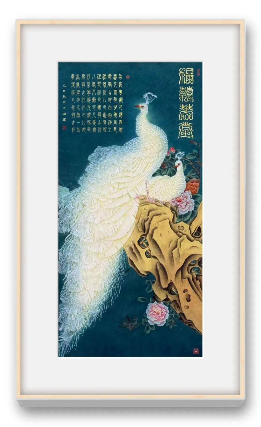 王海军老师以工笔白孔雀为魂,墨蓝底色托出白羽如雪,每一根尾羽都纤毫毕现,在光线下泛着珍珠般的柔光。孔雀栖于灵璧石上,旁伴盛放牡丹,白鸟、黄花、粉花、墨石形成强烈而和谐的视觉冲击,既有“孔雀开屏,富贵吉祥”的传统寓意,又以细腻笔触赋予了生灵沉静高贵的气质。