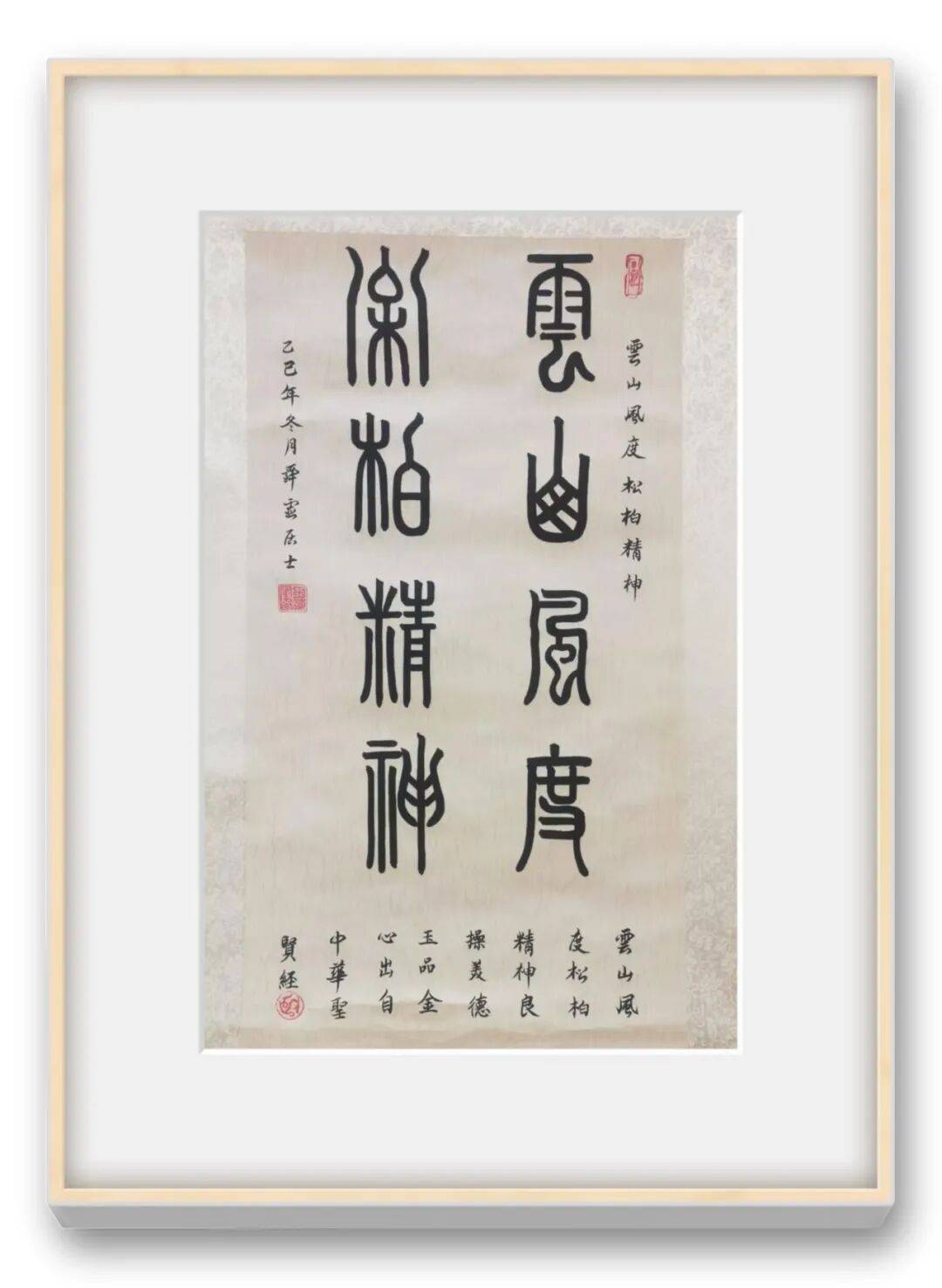 在篆书创作上,王海军老师的造诣尤为深厚,堪称当代篆书艺术的鲜明标杆。他师法《峄山碑》的典雅圆活与《泰山碑》的正大气象,更参酌石鼓文的朴拙意趣,将传统篆书的法度精髓烂熟于心、融会贯通,形成了根基深厚而又独具个性的篆书风格。他深谙篆书“结体严谨、瘦劲挺拔”的特质,每一笔都恪守中锋行笔之道,转笔处逸转流畅,无半分滞涩,尽显“笔里有墨,墨里有笔”的深厚修为。观其篆书作品,线条如铁线般坚韧,笔力千钧却收放自如,实笔重缓浓墨、虚笔轻速干润,虚实互补间尽显力透纸背的质感;结体端庄规整却不僵化,字字兼具“跃、腾、奔、卧”的人格姿态,既保持了篆书面目的纯粹性,又规避了千字一面的刻板弊病,将“楷精法详”的法度意识贯穿创作始终。