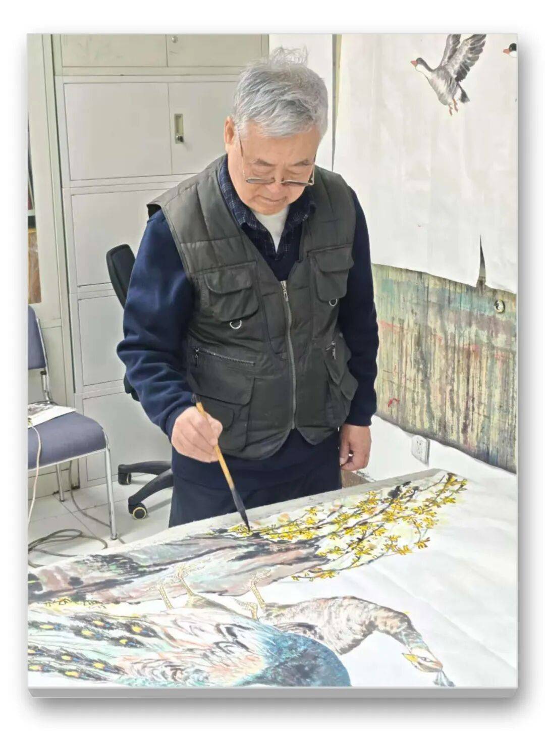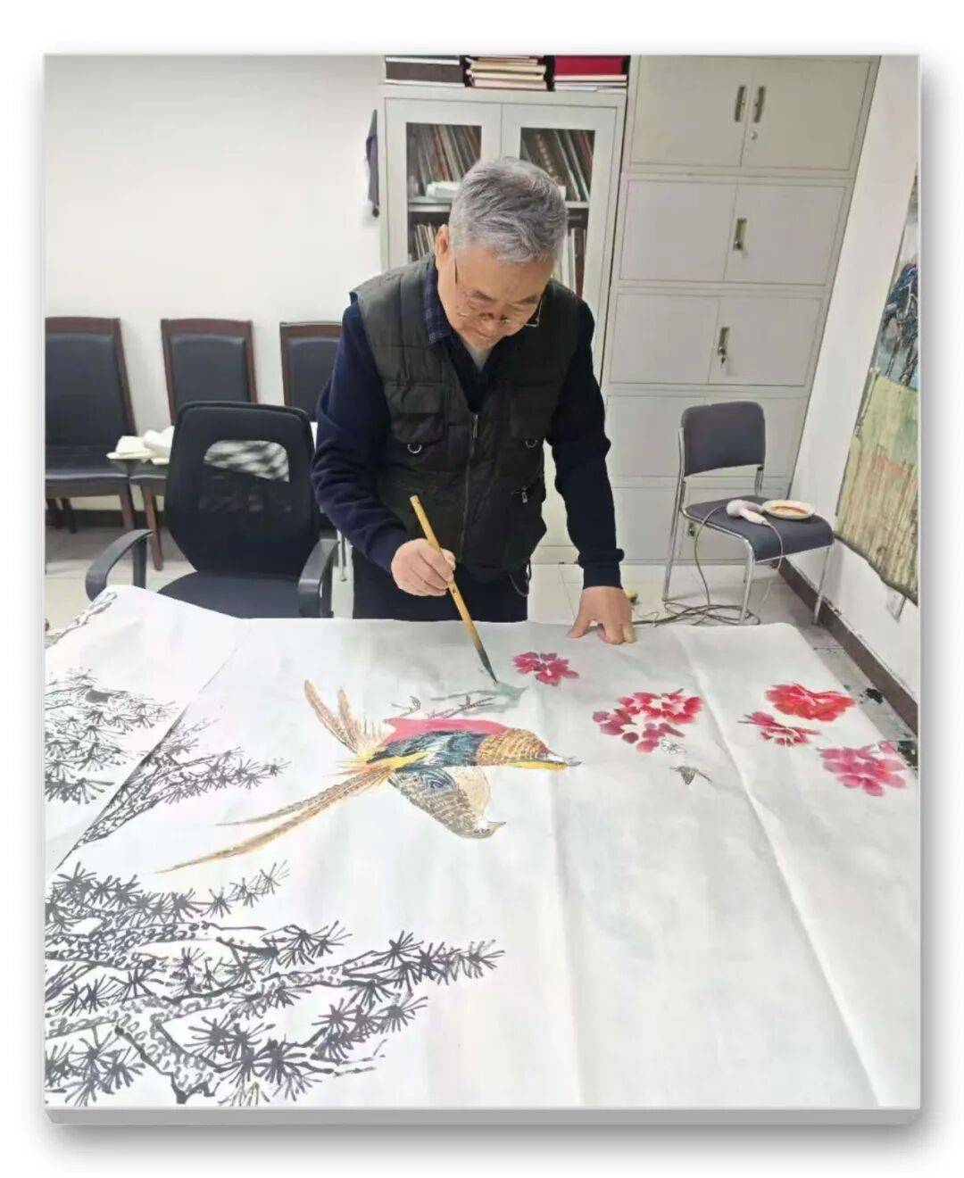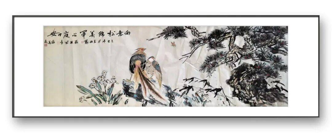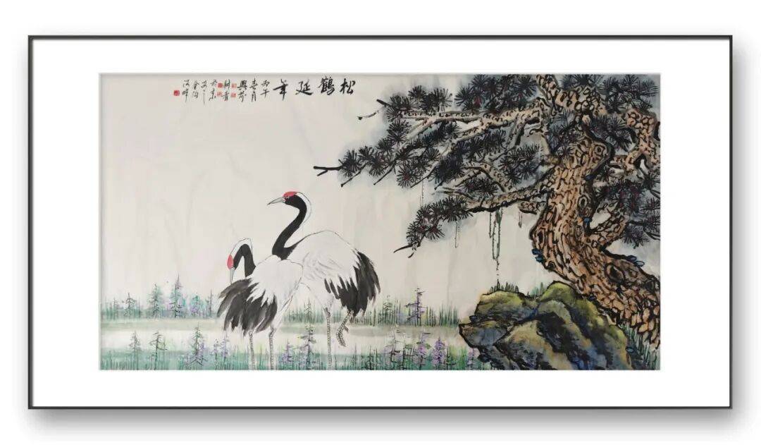 在题材选择与笔墨运用上,两位先生既坚守传统,又勇于创新。题材上,延续了松鹤、牡丹、锦鸡等传统吉祥母题,却赋予其当代审美表达,摒弃了繁琐堆砌,追求简约大气、意境悠远;笔墨上,深谙“墨分五色”之道,浓淡干湿运用自如,色彩搭配典雅不俗,既保留了传统写意画的韵味,又融入了现代审美趣味,让作品既有古典底蕴,又有时代气息。这些合作作品,不仅是笔墨技法的完美融合,更承载着两位先生的人文情怀与生命敬畏。他们以花鸟为媒介,将对自然生命的热爱、对传统文化的坚守、对美好生活的祈愿,都融入每一笔笔墨之中,让作品超越了单纯的艺术观赏价值,成为传递人文精神、彰显文化自信的载体。