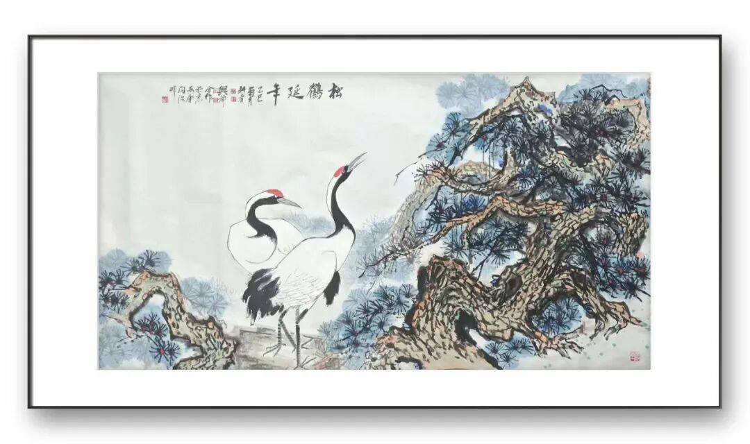 其合作作品《松鹤延年》便是典范之作。王田先生则以苍劲笔墨描绘古松虬劲枝干,针叶疏密有致,再以淡墨晕染山石,营造出苍劲悠远的意境,松的坚韧与鹤的清雅相得益彰,既传递出传统吉祥文化的内涵,又展现出自然生命的美好,刘兴前先生笔下的丹顶鹤,白羽如霜、朱顶似火,姿态优雅从容,或引颈长鸣,或低头梳理羽翼,眼神灵动,尽显长寿祥瑞之气。