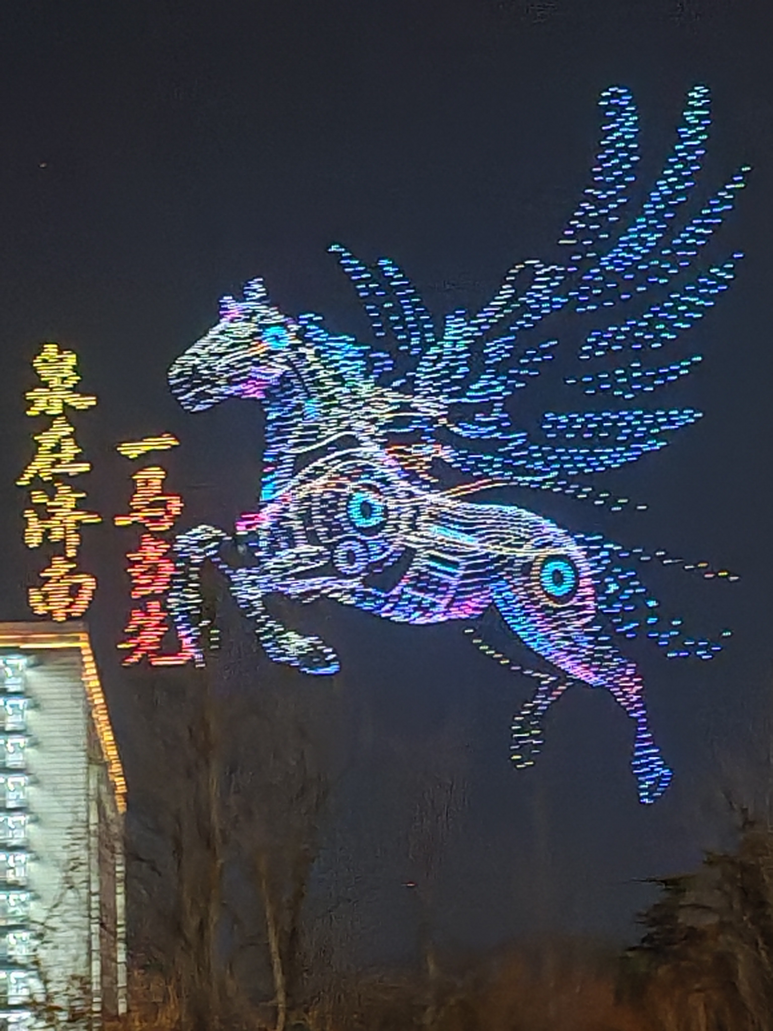 短短20分钟,十余幅动态画卷在空中缓缓展开,一举刷新山东省无人机表演的最高纪录。古老的舜耕历山传说跃然夜空,灵动的泉字流光闪耀,尽显济南千年底蕴。大明湖、千佛山、趵突泉的标志性美景依次呈现,锦鲤穿梭、白鹭飞舞,绘就出宜居泉城的动人模样。现代化的CBD高楼拔地而起,孩童与机器人相伴的画面温暖治愈,展现出数智济南的蓬勃朝气。最后腾空而起的骏马图案搭配璀璨光影,“泉在济南,一马当先”的祝福直冲云霄,将整场表演推向最高潮。
