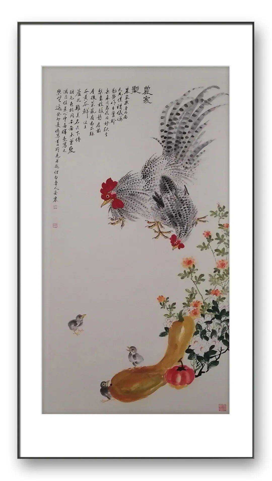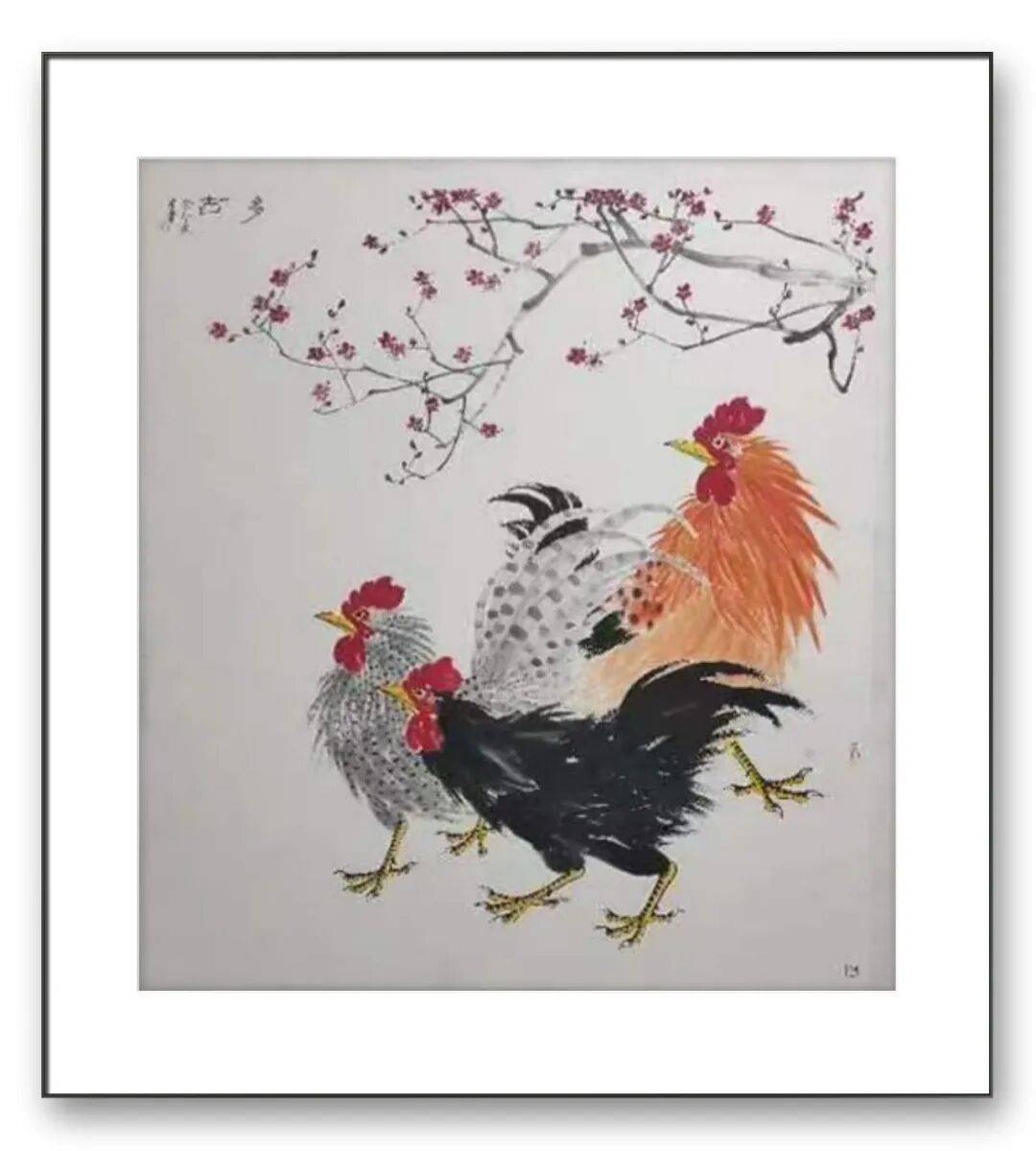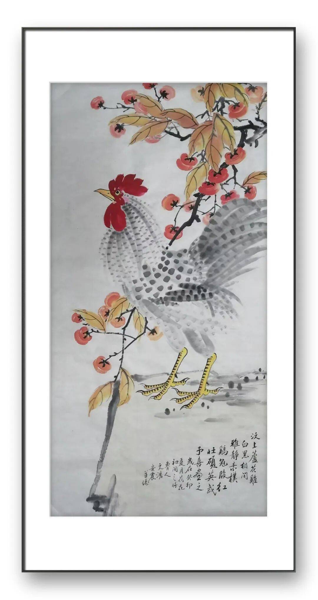 与许多画家对自然的浅层描摹不同,安震先生的“师造化”,是“观物取象”与“悟物明心”的结合,是形与神的双重契合。他曾说:“书画艺术要有时代精神,但也要守住自身本色,所以我还是坚持在注重笔墨基础上的出新。”这份坚守,让他在观察自然时,既注重捕捉花鸟的形态细节,又着力领悟其内在神韵——春日牡丹的雍容华贵,不是单纯的色彩堆砌,而是花瓣舒展的肌理、枝叶穿插的韵律;秋日寒菊的清逸傲骨,不在于枝干的纤细,而在于风霜中挺立的姿态、暗香浮动的意趣;枝头雀鸟的灵动活泼,不是羽毛的细致描摹,而是展翅的动态、啾鸣的情态,哪怕是一笔点染的翅尖,都藏着自然生灵的鲜活气息。他画《柿如意》,特意蹲在树下观察秋日柿子的饱满形态,红彤的果实挂在枯涩枝桠上,搭配停落枝头的小鸟,羽翼的纹理、神态的灵动皆镌刻于心,笔墨间既有柿子的厚重饱满,又有小鸟的轻盈灵动,将自然物象的本真与生机展现得淋漓尽致;他画雄鸡,细致留意其昂首踱步的姿态,鸡冠的艳红、羽毛的层次,甚至脚下草叶的摇曳,都一一融入笔下,既得其形,更传其神,将雄鸡的昂扬不屈、坦荡风骨定格于纸端。这种对自然的敬畏与热爱,让他的花鸟画摆脱了程式化的束缚,每一幅作品都有着独特的生命力,仿佛能让人嗅到花香、听到鸟鸣,感受到自然的温润与生机。