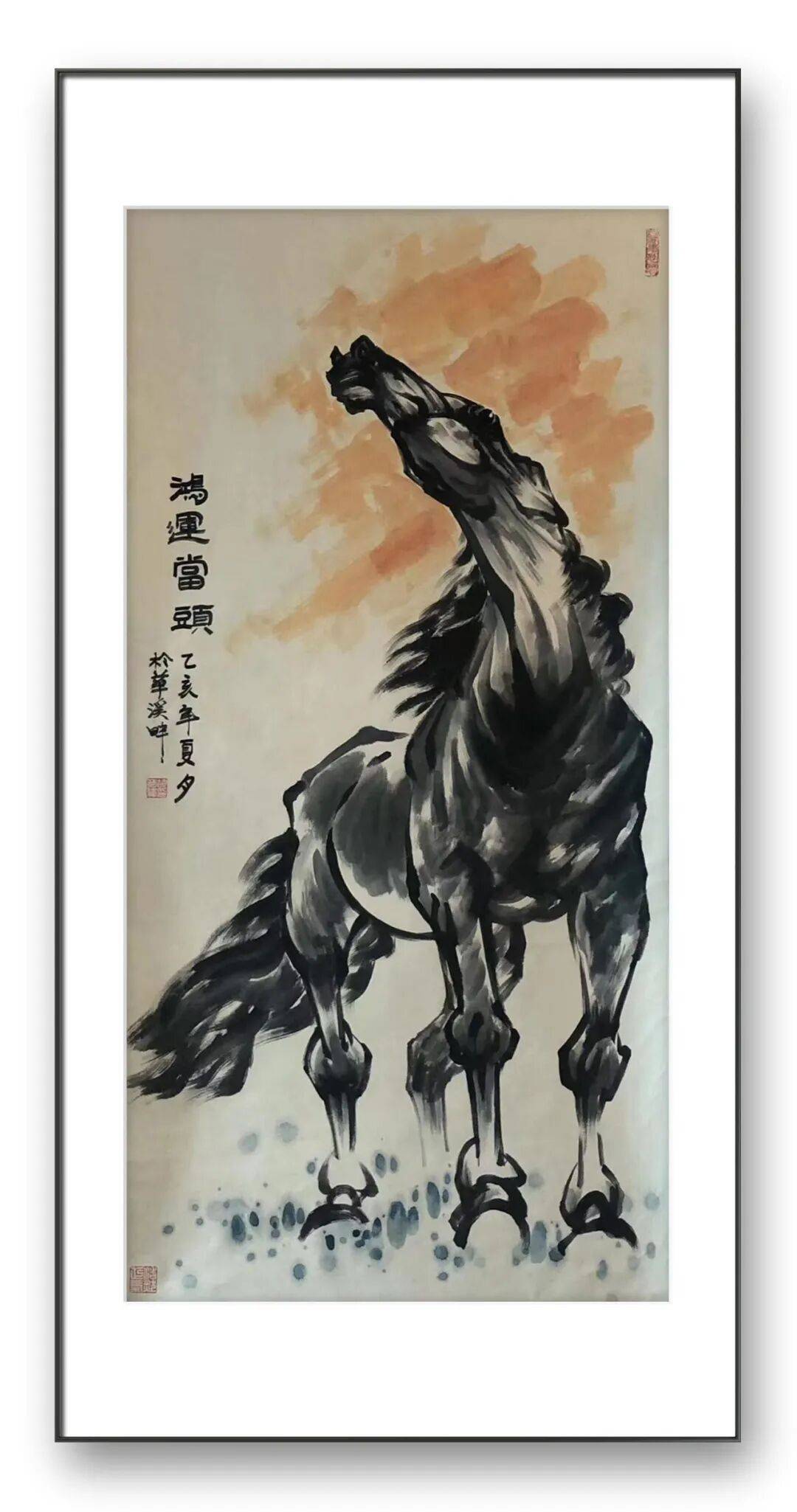 此外,他的构图还注重“动静结合”,力求让画面充满节奏感与生命力。或让骏马奔跃于苍茫山水间,四蹄腾空,昂首嘶鸣,以动衬静,凸显天地辽阔与马匹的奔放不羁;或让马匹静立于疏林溪畔,低头饮水,或昂首远眺,以静寓动,暗藏蓄势待发的力量。有时,他会刻画单马独行,凸显其孤高洒脱的风骨;有时,会描绘群马奔腾,彰显其众志成城、奋勇争先的气势;有时,会搭配人物、飞鸟等元素,让画面更具生活气息与故事性。多变的构图,让每一幅马画都各具意境,避免了题材重复带来的审美疲劳,也展现了胡奇伟先生深厚的构图功底与丰富的艺术想象力。