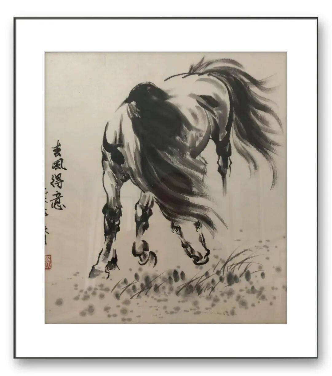 在马匹的躯干肌理处,胡奇伟先生以淡墨写意渲染,而非工笔的层层填色,通过墨色的浓淡变化,凸显肌肉的起伏与力量感,让线条与墨色相互渗透,既保留了工笔的精准,又兼具写意的气韵。这种“工中带写、写中见工”的技法融合,让他的马画既不同于纯工笔的刻板拘谨,亦有别于纯写意的空泛疏阔,形成了独特的艺术质感。每一匹马,都既有可触摸的真实体态,又有可感知的精神气度,仿佛下一秒便会挣脱画面的束缚,奔跃而出,驰骋于天地之间。