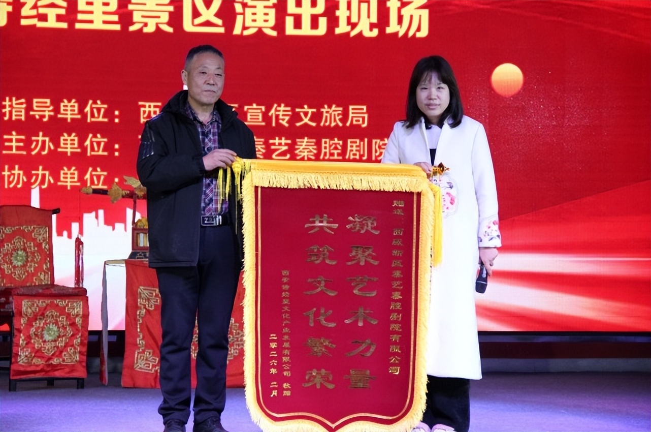 作为本场演出的协办方,西安诗经里文化产业发展有限公司副经理张玉梅女士将一面写有“聚集艺术力量,共筑文化繁荣”的锦旗亲手交到了秦艺秦腔剧院院长薛小平的手里,并一起合了影,这是西安诗经里文化产业发展有限公司对秦艺秦腔剧院的最大支持。其实每逢周六或周日,在演出不发生冲突的情况下,秦艺秦腔剧院都会在西安诗经里景区有一场公益演出。