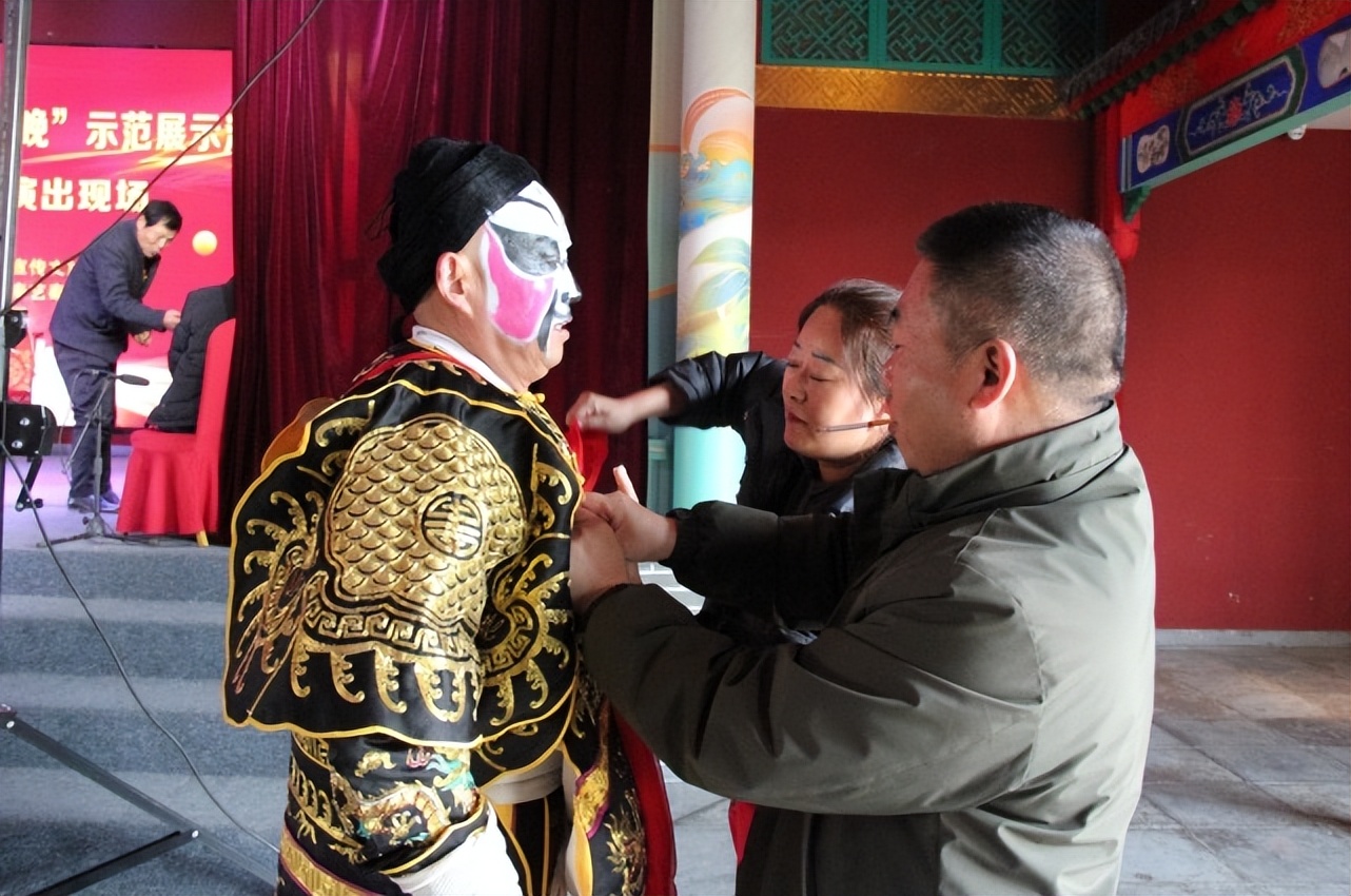 在这场精彩纷呈的演出背后,幕后英雄也是值得夸赞的。最辛苦的当属秦艺秦腔剧院优秀的旦角演员王敏,她也是秦艺剧团的团长。她负责全盘工作,后勤接待,演员穿衣化妆等都是她一个人安排的,还有我团的业务科长,桑保奇昨天也在搞后勤,学员翟五,也搞后勤,舞台演出的那几个学员也都是我这里优秀学员,从我这里培训走出的学员目前已有几百人,目前还有三十多学员还在培训中。
