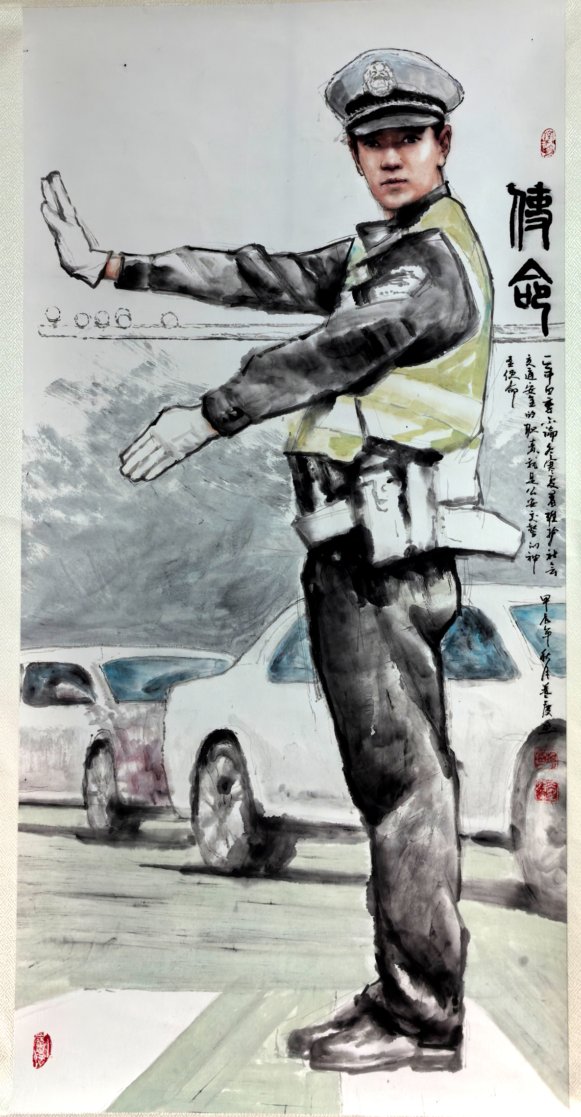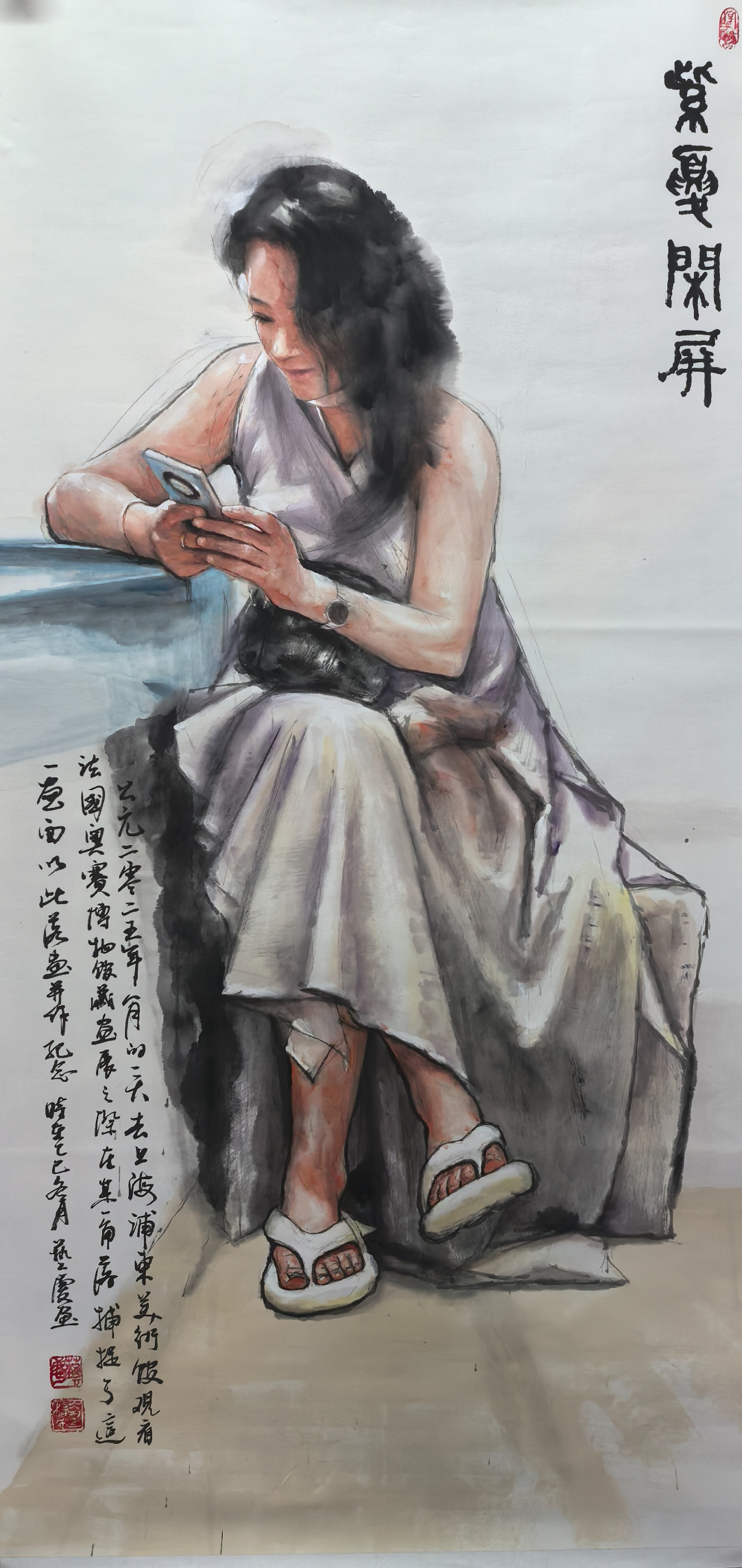 从雪域圣境到濠江之畔,从苍茫草原到都市街巷,先生的笔始终贴着人间烟火。大三巴前的少年,眉眼间藏着家国的眷恋;都市里的女子,低眸弄屏,温婉如晚风拂柳,将现代生活的闲适与柔美勾勒得淋漓尽致。他善用墨色铺陈意境,以淡墨绘雪山苍茫,以浓墨塑筋骨峥嵘,以赭石、石青点染民族服饰的绚烂,墨与色交融,形与神共生,既有传统水墨的写意空灵,又有现代写实的细腻传神。