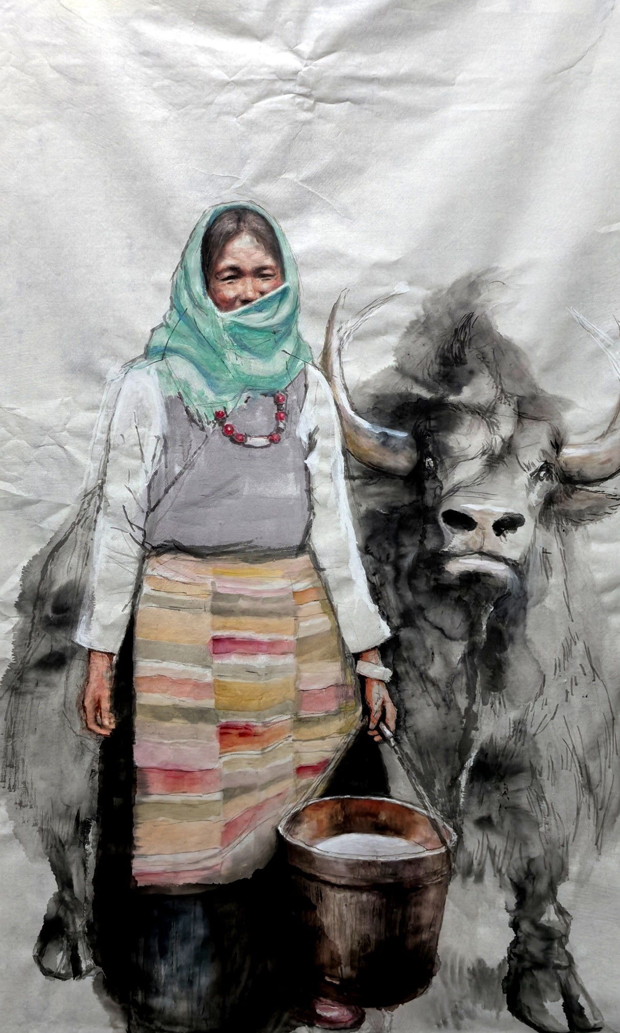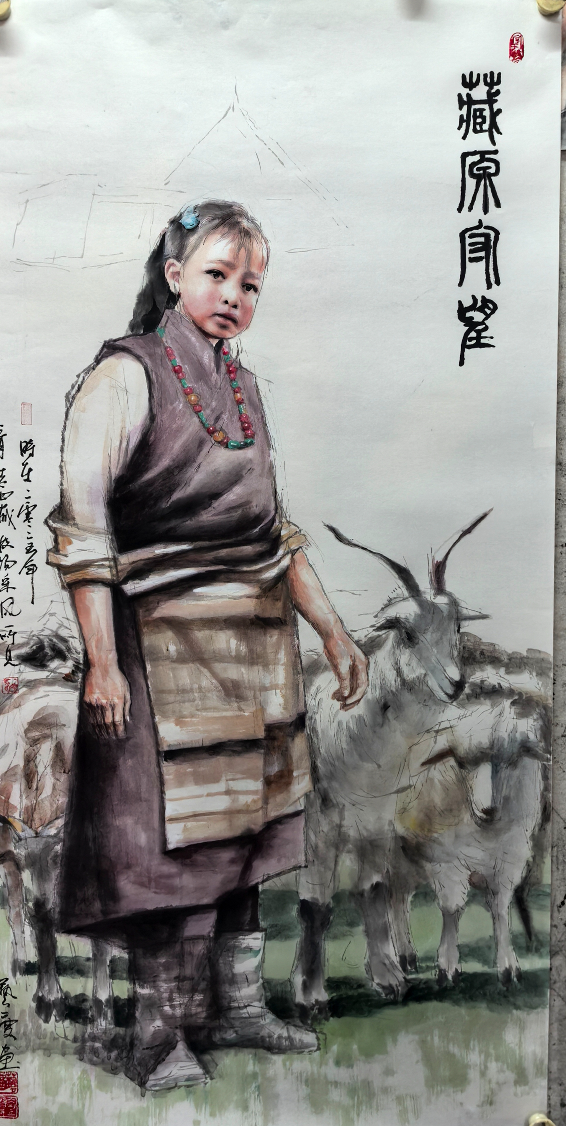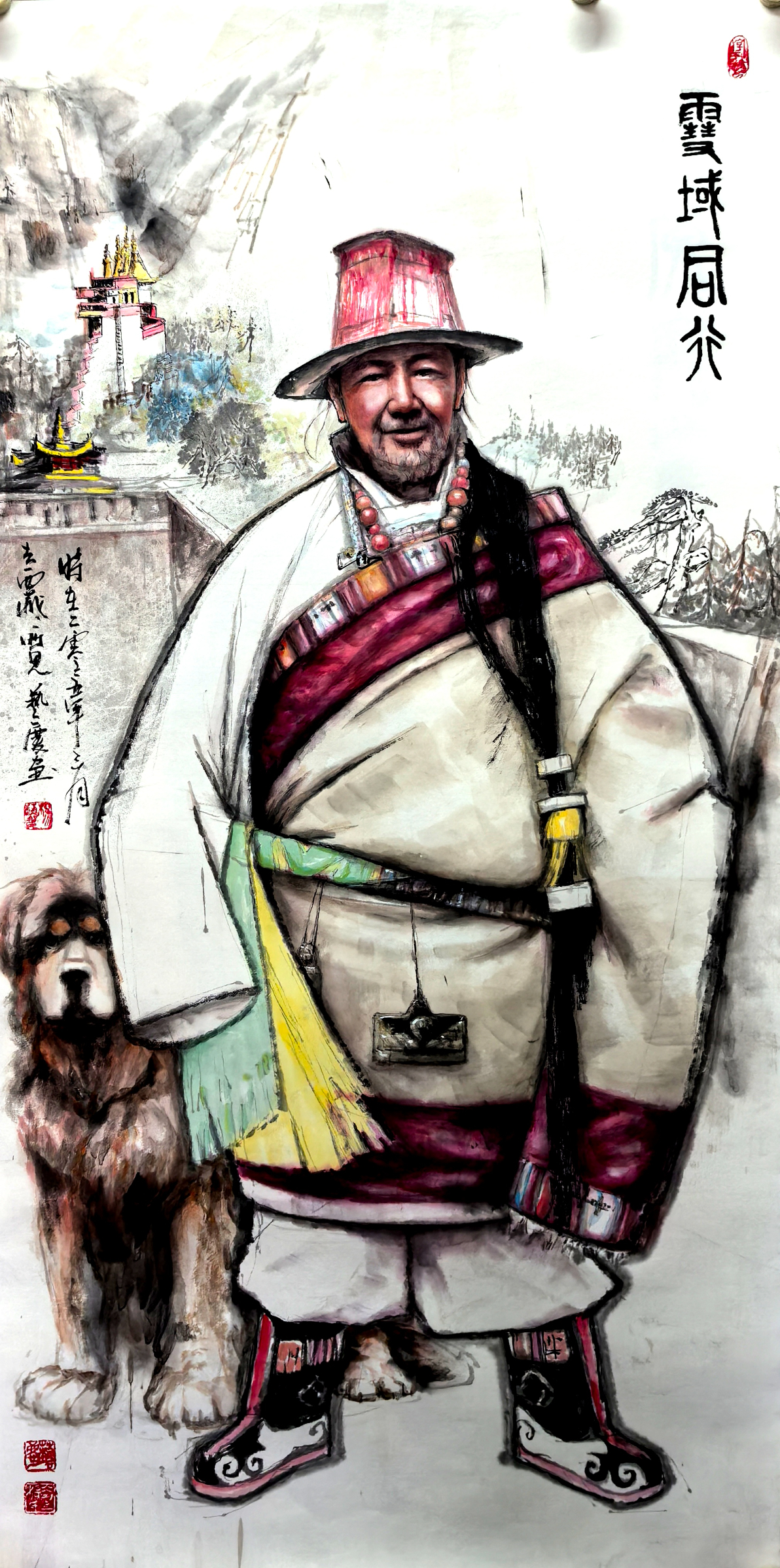 先生落笔,藏万千气象于墨色,融中西技法于毫端。他深研水墨精髓,兼收写实神韵,线条如清泉绕石,刚柔相济;墨色似流云叠嶂,五色纷呈。观其雪域系列,藏地儿女的眉眼间,是高原阳光镌刻的淳朴,是雪山圣湖滋养的澄澈。孩童的眼眸如澄澈的海子,老者的笑颜似温煦的暖阳,少女的发辫缀着松石的灵光,身旁的藏獒、牦牛、羊群,皆成笔墨间最灵动的陪伴,每一根线条都刻着高原的辽阔,每一抹晕染都藏着雪域的虔诚。