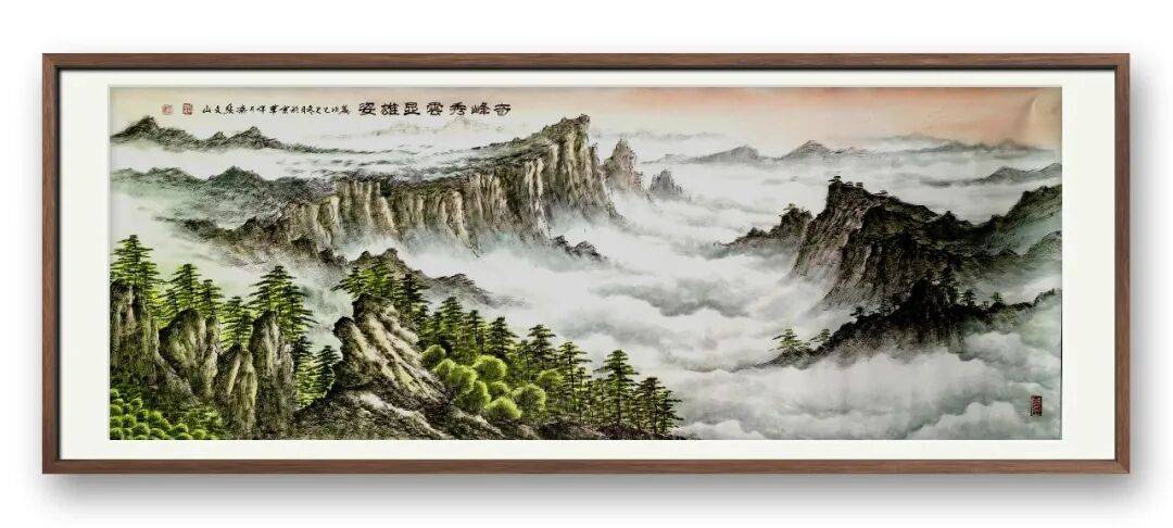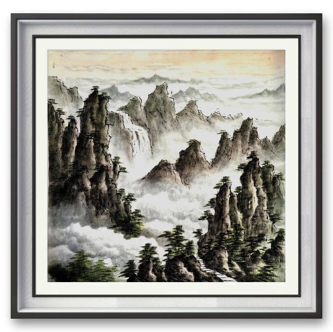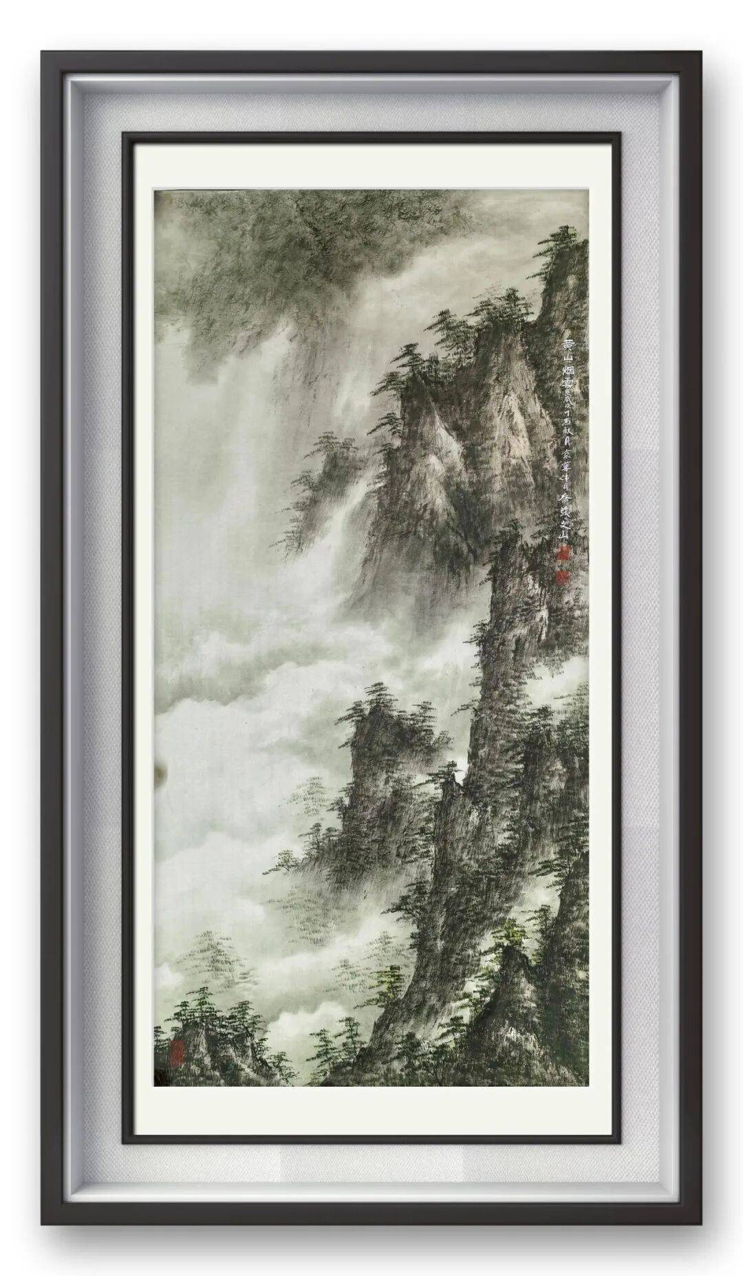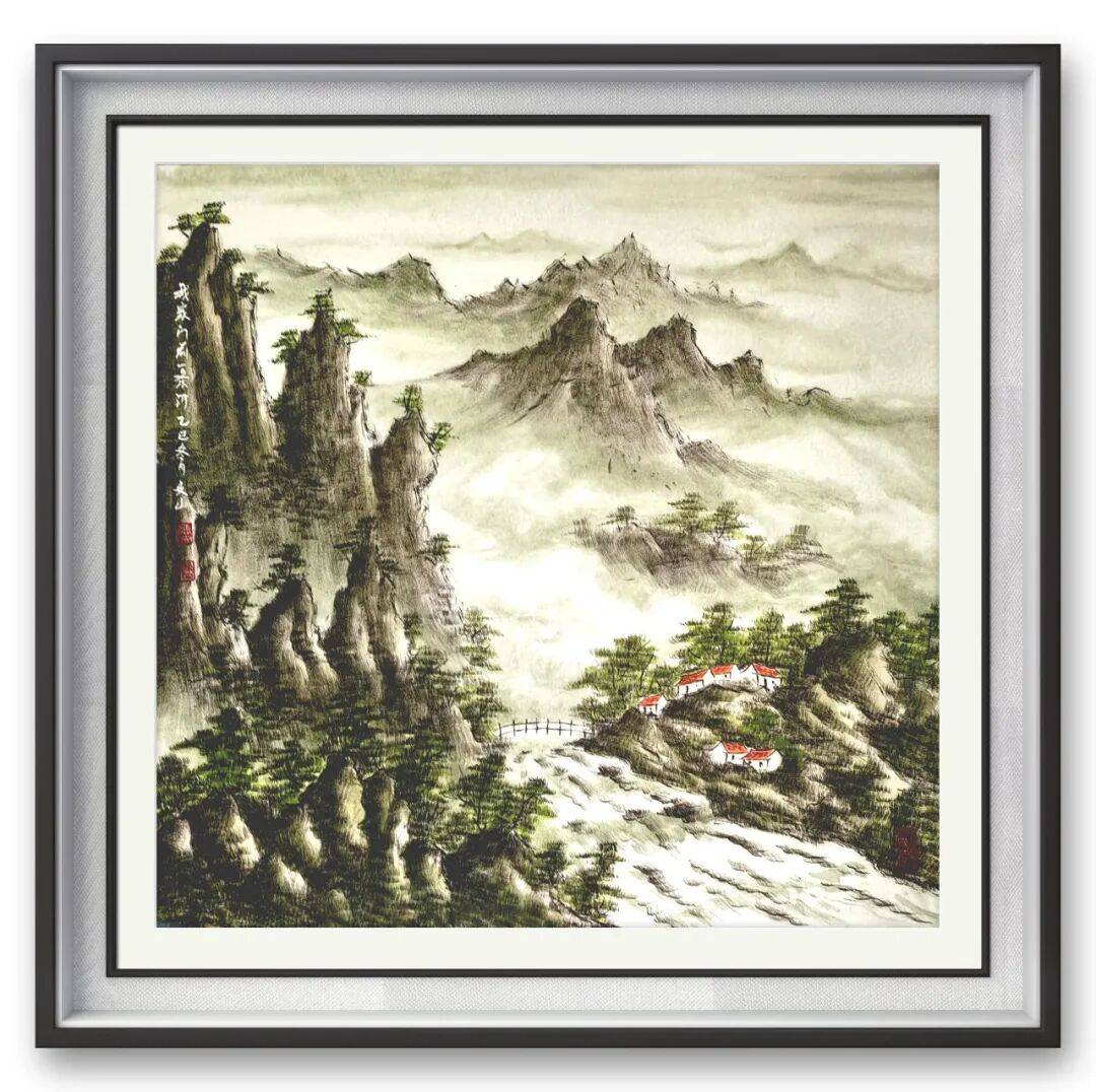 尤为称道的是其笔下的云雾,堪称画作的点睛之笔,亦是其艺术风格的鲜明标识。张文山深谙云雾之韵,不刻意雕琢,不肆意铺陈,将云的柔美缠绵、朦胧缥缈,与苍山翠柏的挺拔清劲完美相融。浓雾如纱,轻笼峰峦,显空灵之境;清烟似缕,萦绕溪涧,生悠远之思,浓淡相宜间,恰如“云烟深处似有仙,山水之间神蕴藏”,让观者在虚实相生中,体悟山水之外的禅意与哲思,这份笔墨功力,非半生浸淫不能得。