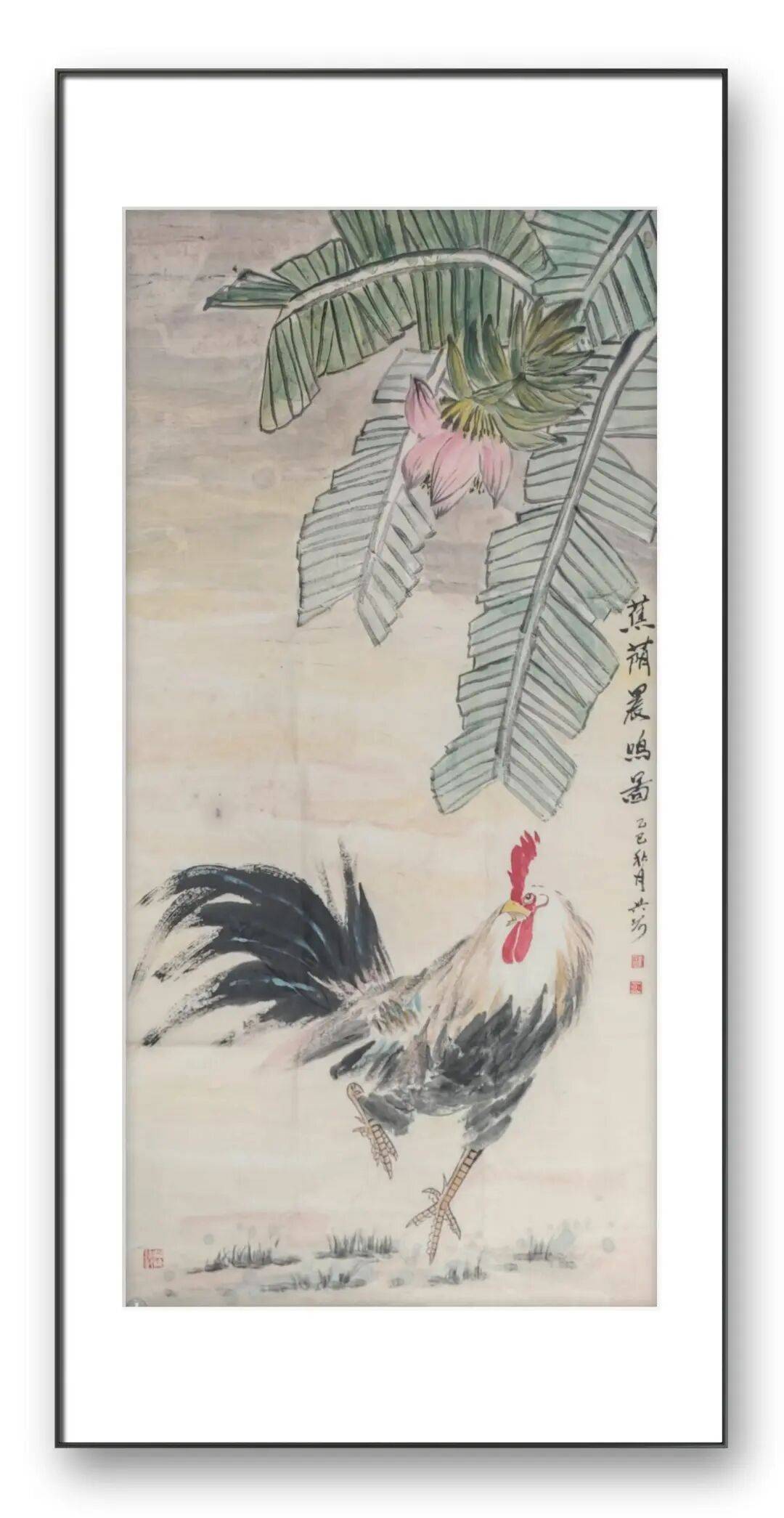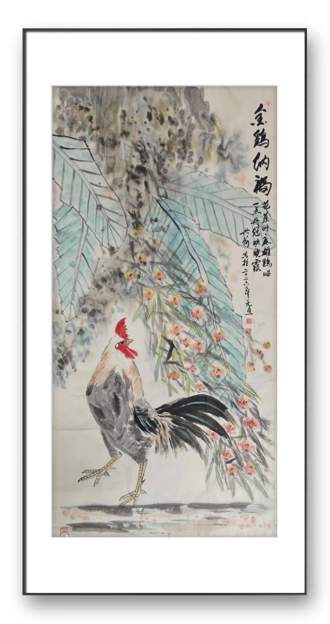 刘兴前老师是当代画坛一位兼具传统底蕴与时代精神的艺术家。他的书画作品,尤其是以鸡为核心的花鸟创作,不仅是对自然生灵的生动写照,更是对生命力量与人文情怀的深刻表达。在他的作品中,我们既能看到传统文人画的清雅意境,又能感受到现代艺术的鲜活气息。他笔下的雄鸡,冠红如火,尾黑如墨,爪利似剑,在粗与细、红与黑的强烈对比中,呈现出一种和谐雄奇之美。这种对色彩与线条的精准把控,既继承了传统花鸟画的精髓,又融入了现代审美对力量感与表现力的追求。