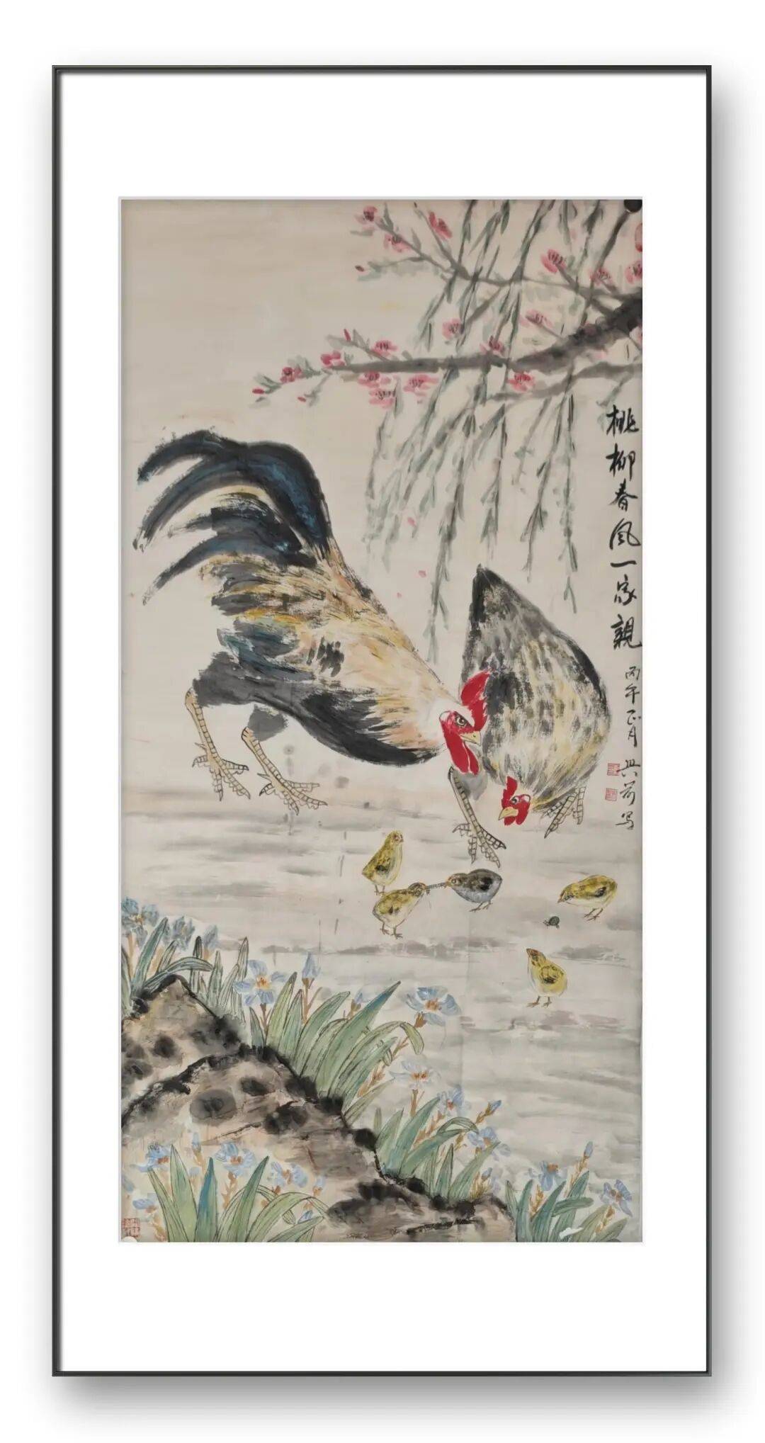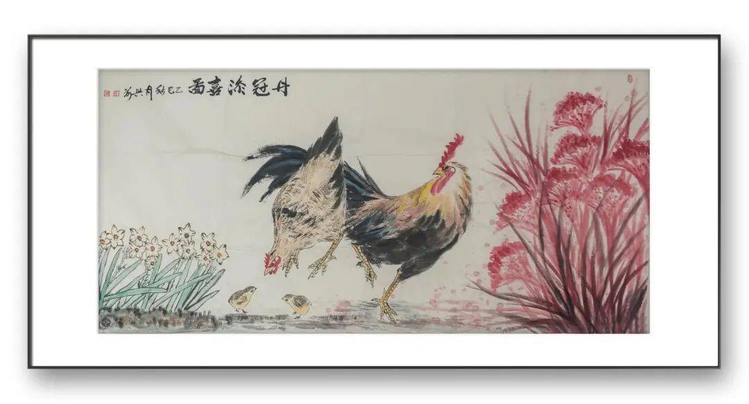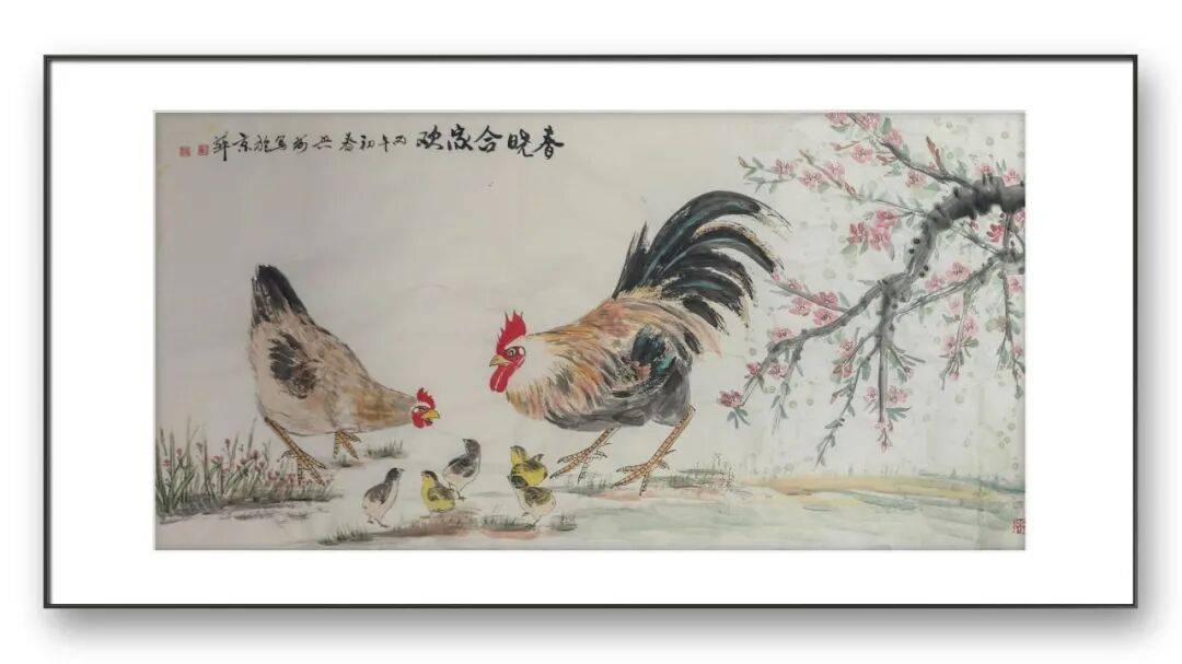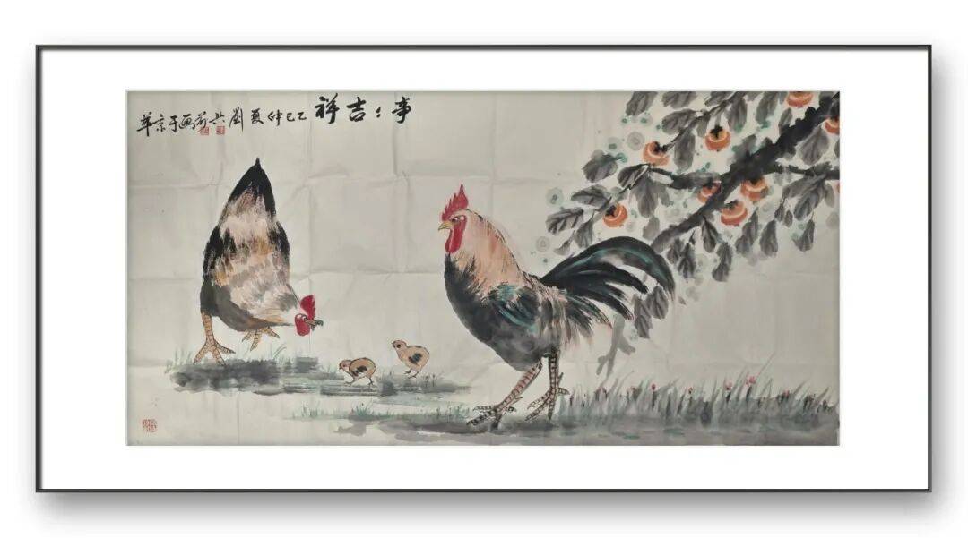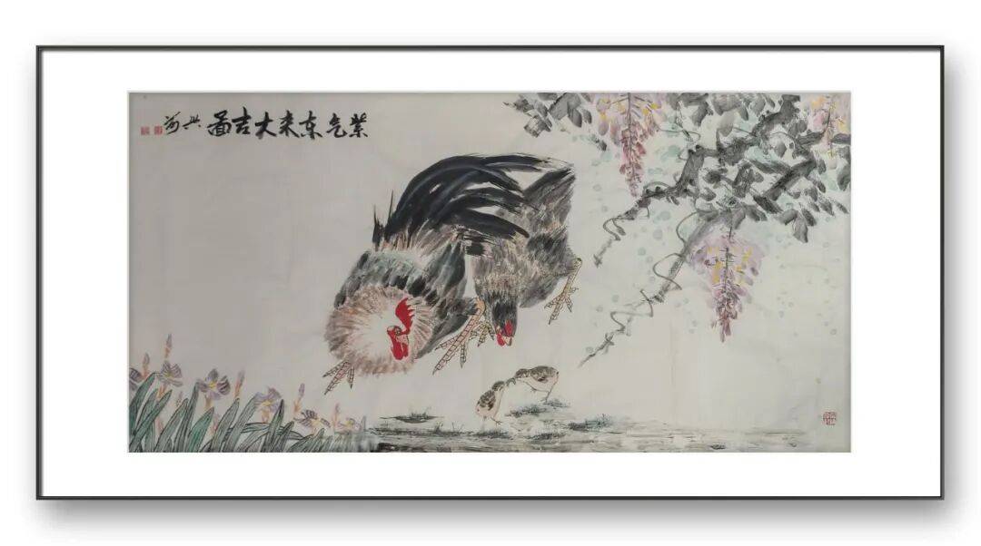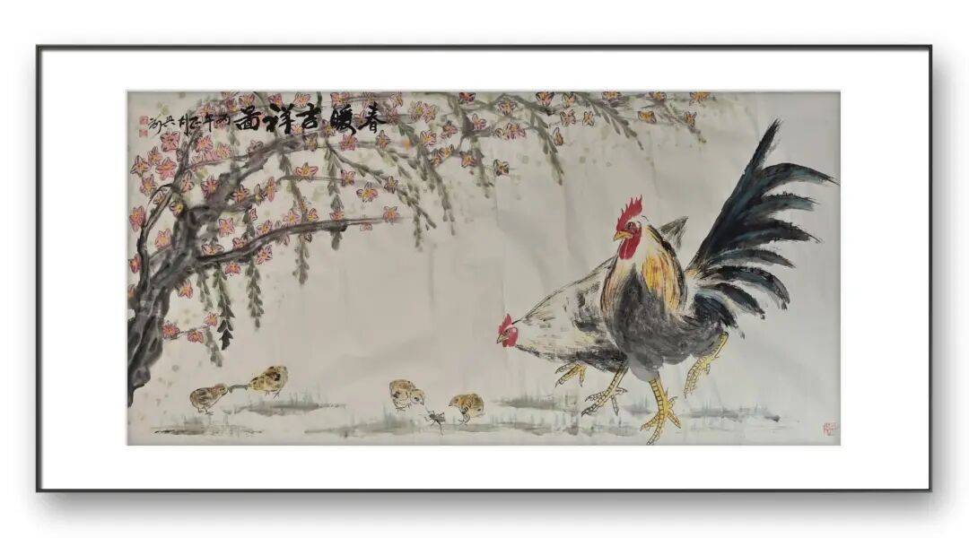 刘兴前老师尤擅画鸡,人称“军中画鸡王”。在他的笔下,鸡不再是简单的家禽,而是被赋予了丰富的人格与情感。他的作品中,既有雄鸡昂首报晓的威武雄壮,也有母鸡带领雏鸡觅食的温婉慈爱;既有“势在必得”的昂扬斗志,也有“喜从天降”的悠然自得。这种对生命情态的细腻捕捉,源于他对生活的深刻观察与热爱。他画的鸡,雌雄各异,动静相宜,充满了人间烟火气。无论是雄鸡立于竹篱之上的傲然,还是鸡群在桃花下嬉戏的温馨,都让我们感受到生命的美好与力量。他通过鸡的形象,抒写着对家庭、爱情、和谐与幸福的向往,让传统题材焕发出新的时代内涵。