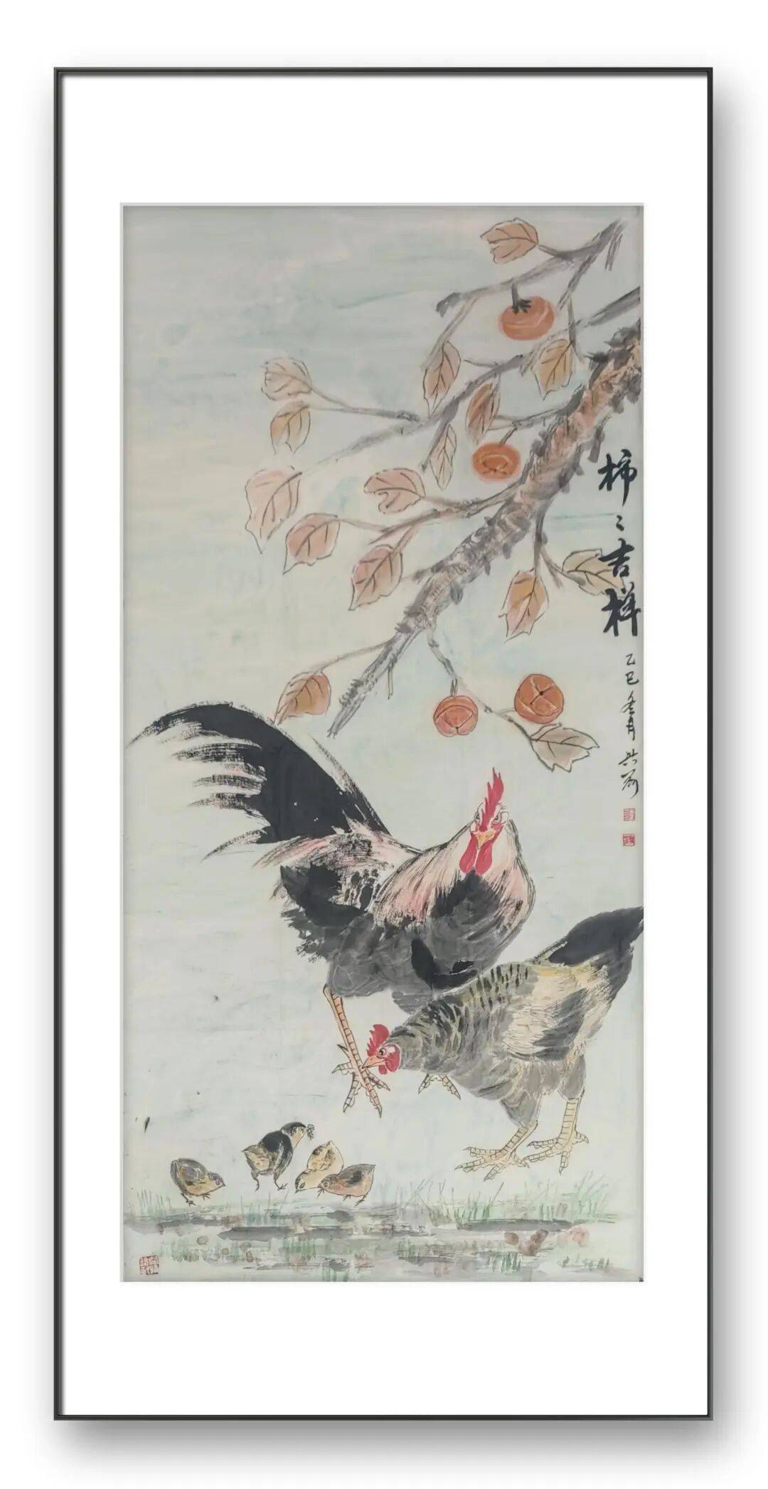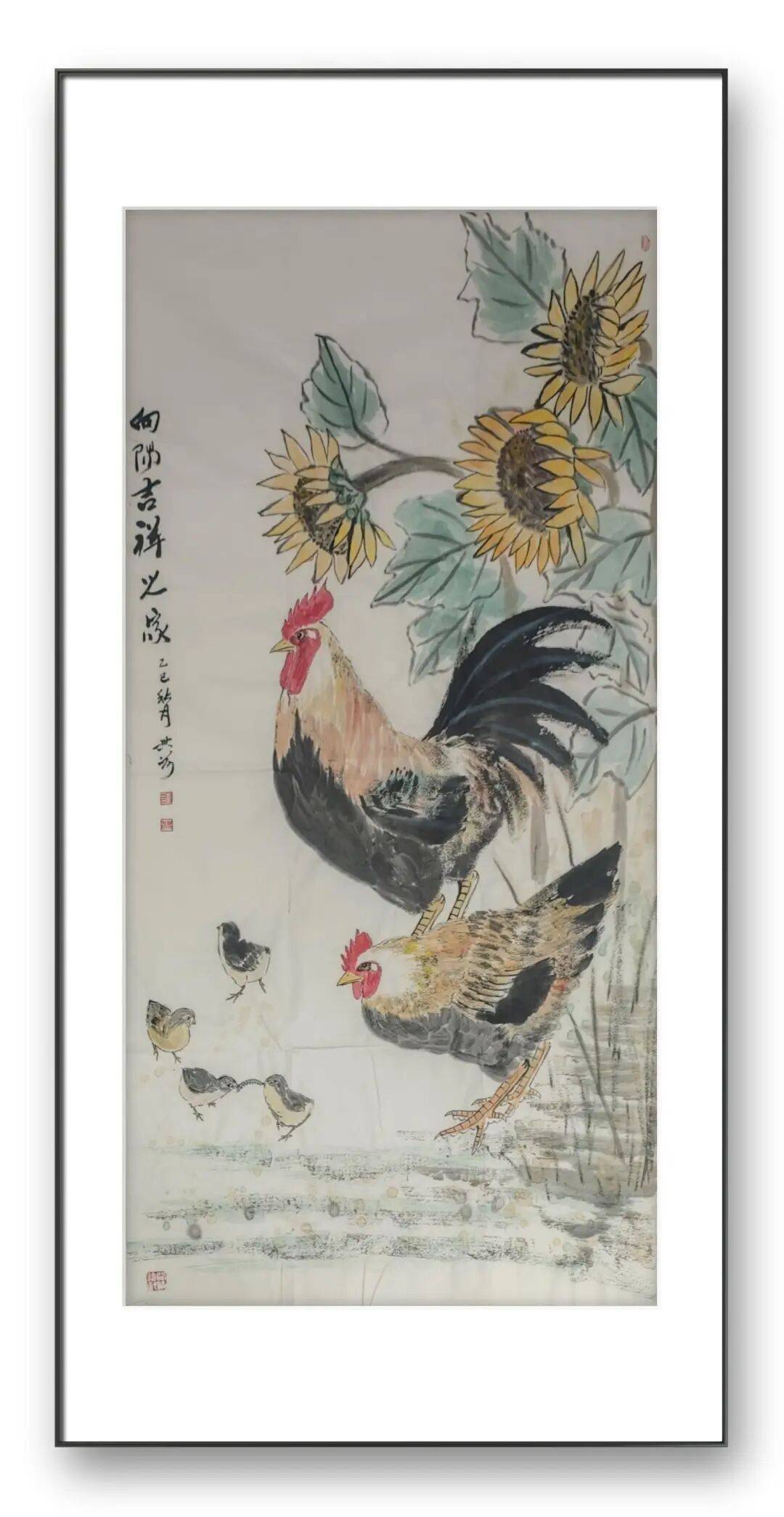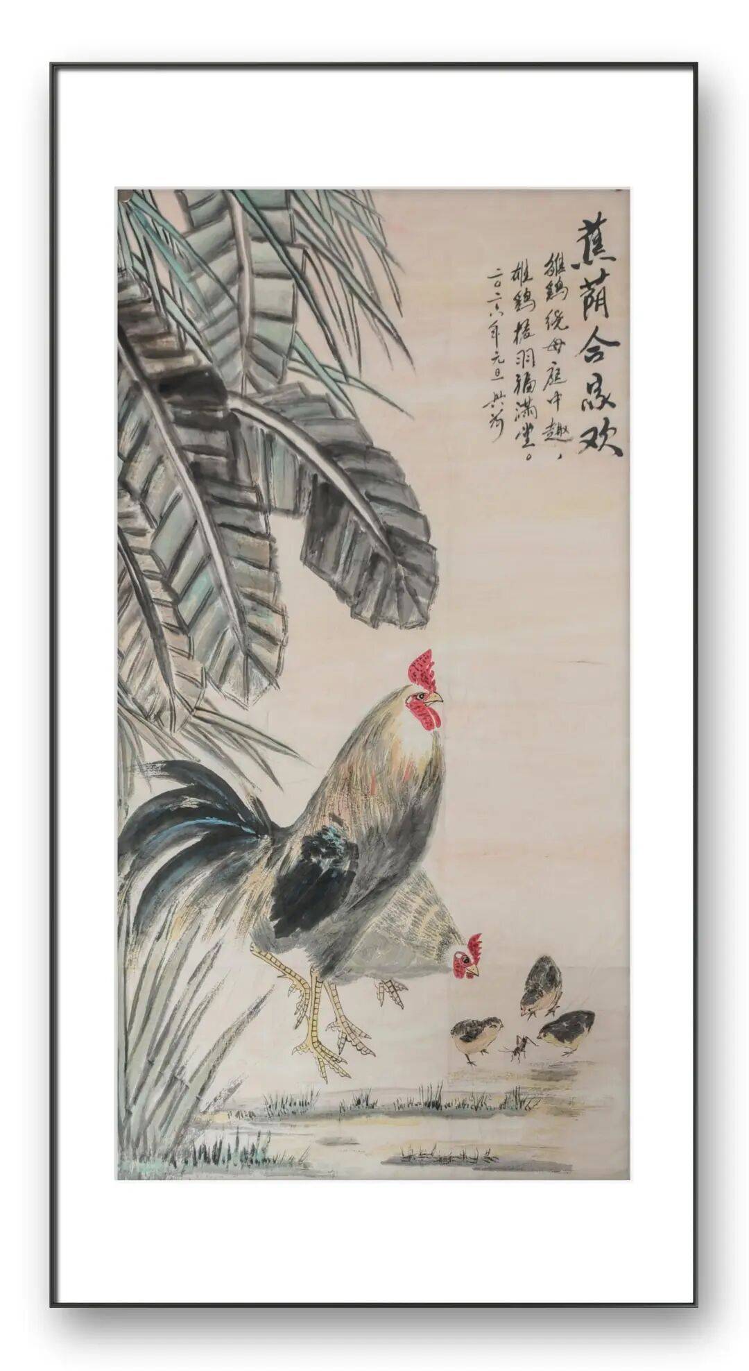 刘兴前老师尤擅画鸡,人称“军中画鸡王”。在他的笔下,鸡不再是简单的家禽,而是被赋予了丰富的人格与情感。他的作品中,既有雄鸡昂首报晓的威武雄壮,也有母鸡带领雏鸡觅食的温婉慈爱;既有“势在必得”的昂扬斗志,也有“喜从天降”的悠然自得。这种对生命情态的细腻捕捉,源于他对生活的深刻观察与热爱。他画的鸡,雌雄各异,动静相宜,充满了人间烟火气。无论是雄鸡立于竹篱之上的傲然,还是鸡群在桃花下嬉戏的温馨,都让我们感受到生命的美好与力量。他通过鸡的形象,抒写着对家庭、爱情、和谐与幸福的向往,让传统题材焕发出新的时代内涵。
