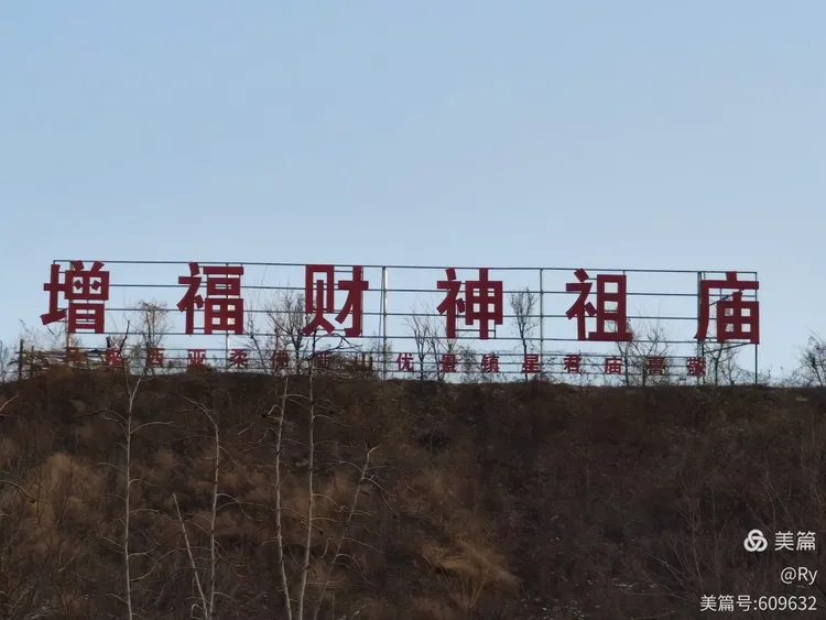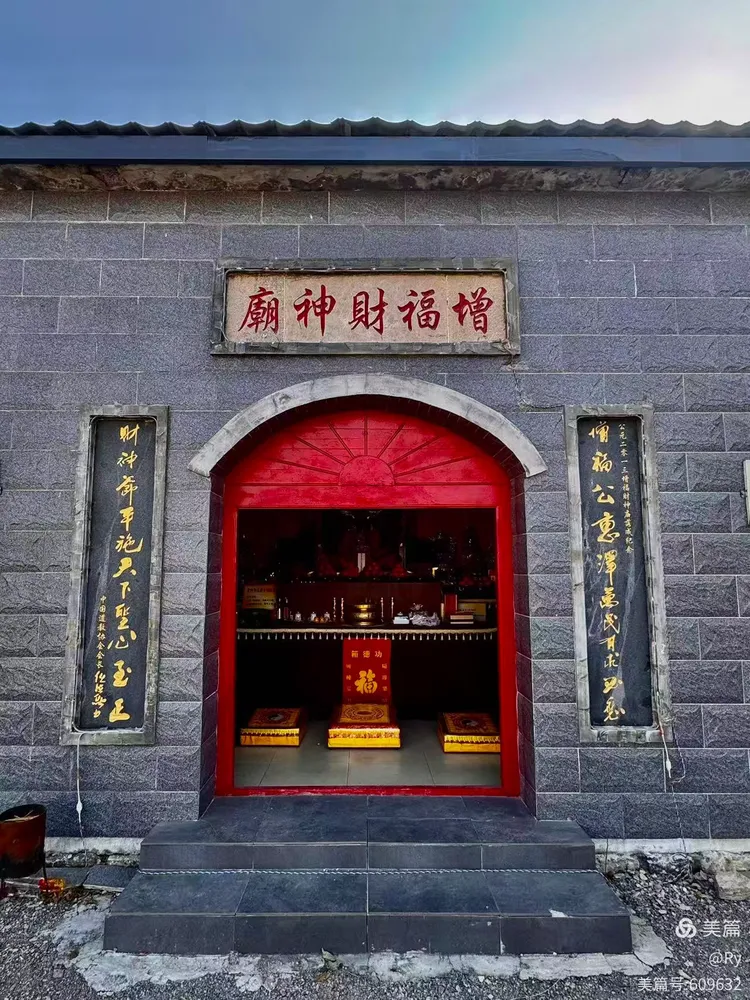 青砖灰瓦、红门拱券、蓝底白字指示牌指向城墙旧影,增福财神祖庙,就低调隐藏在这片苍茫山色里。
