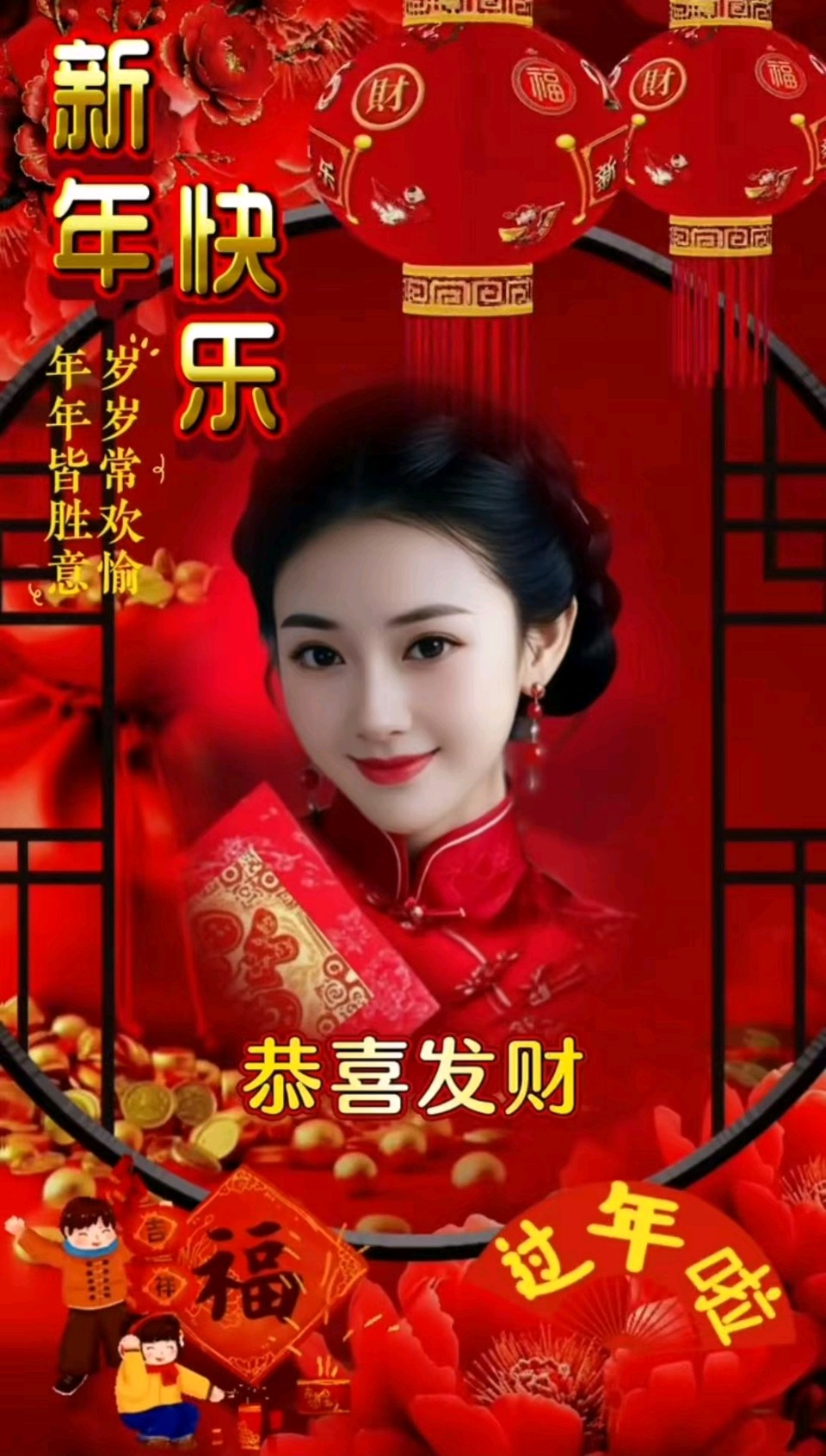 欢然,童稚喜,红包满握,吉语声长。道恭喜发财,喜气洋洋。共祝神州鼎盛,民安乐、岁稔时和。同期盼,明朝景好,盛世福绵长。