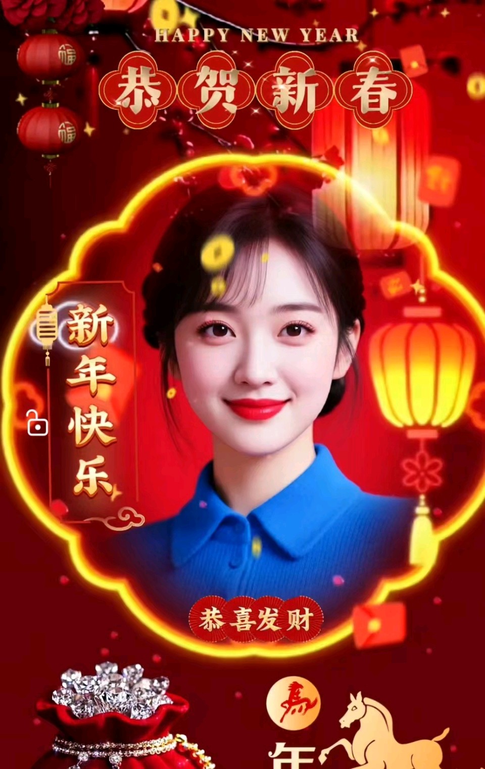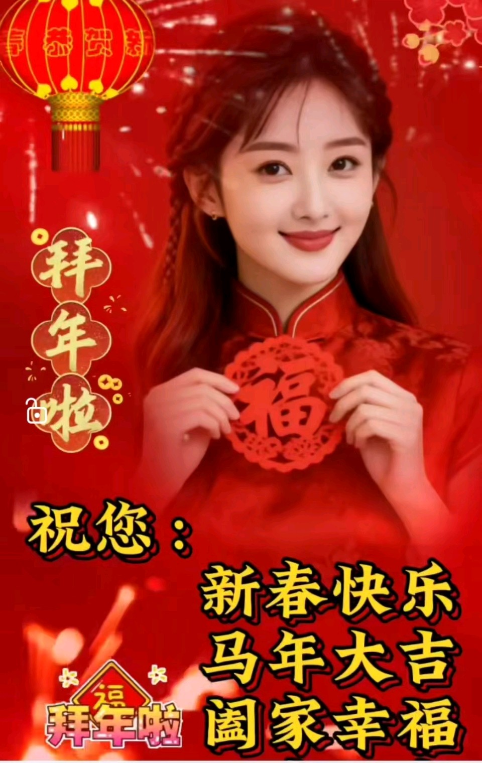 旧岁炮声辞罢,新春梅蕊初开。红灯高挂映楼台,福字沿街满宅。