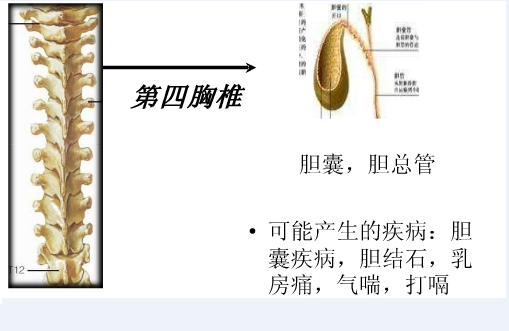 第四胸椎段:主要关联肺、支气管、胆囊、胸肋等。如发生障碍,易患肺炎、气喘、黄疸、胸膜炎、乳房痛、肋间痛等症。