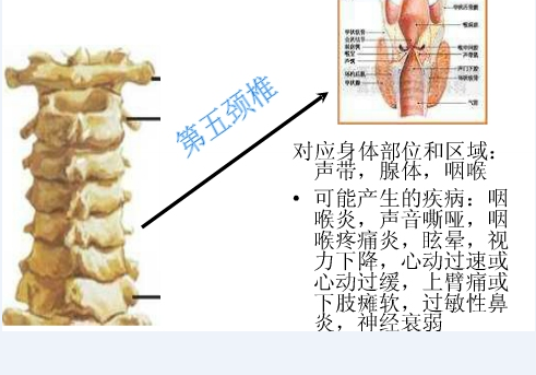 第五颈椎段:主要关联手肘、食道、气管、横膈膜、心脏等。如发生障碍,易患气管炎、咽喉炎、哮喘、手臂酸痛、心动过速或过缓等。