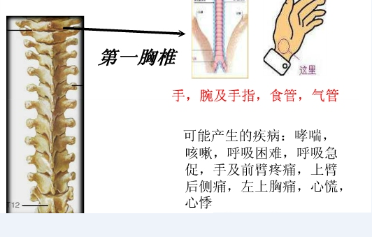 第一胸椎段:主要关联心脏、气管、食道、前臂等。如发生障碍,易患心慌、心悸、气管炎、气喘、咳嗽、呼吸困难、左上胸痛、手腕痛、手臂后侧痛等症。