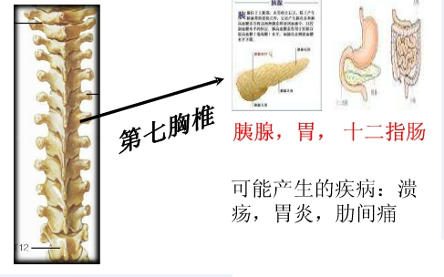 第七胸椎段:主要关联肝、胆、胰、十二指肠等。如发生障碍,易患肝区痛、胆石症、胃溃疡、2型糖尿病、十二指肠炎、扁桃腺炎等症。