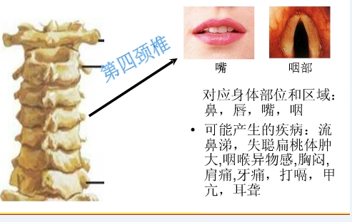 第四颈椎段:主要关联颈部肌肉、咽、臂等。如发生障碍,易患肩酸痛、牙痛、三叉神经痛、甲状腺功能亢进、胸闷、呃逆(打呃)等症。